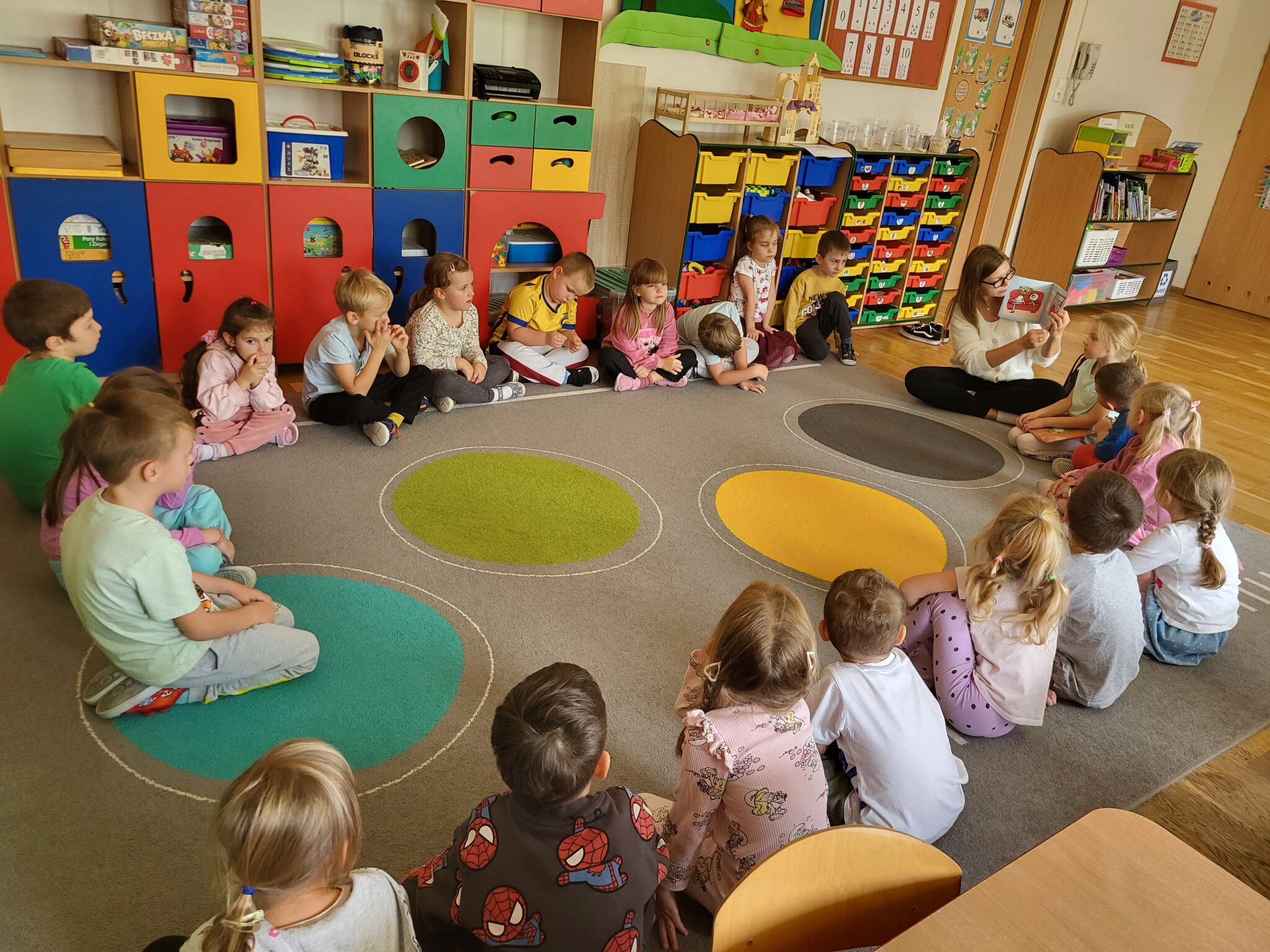 dnia 9.10.2025r. grupę VI odwiedziła mama Magdy, która w ramach akcji “Czytanie na dywanie” przeczytała dzieciom dwie książeczki: “Kicia Kocia i straszna burza” oraz “Jesień w Jeżynowym Grodzie”. Podczas słuchania