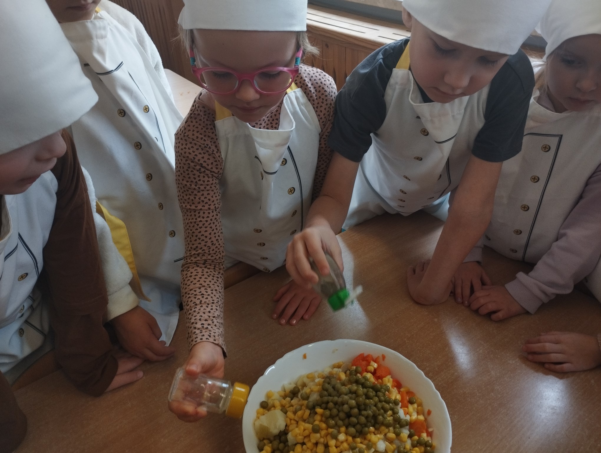 „Zdrowie na talerzu” Dnia 15.10.2025r. dzieci z grupy „Żabki” kolejny raz zgłębiały tajniki kuchni polskiej. Tym razem poznawały przepis na sałatkę jarzynową. Zajęcia kulinarne rozpoczęto od przypomnienia nazw warzyw, które