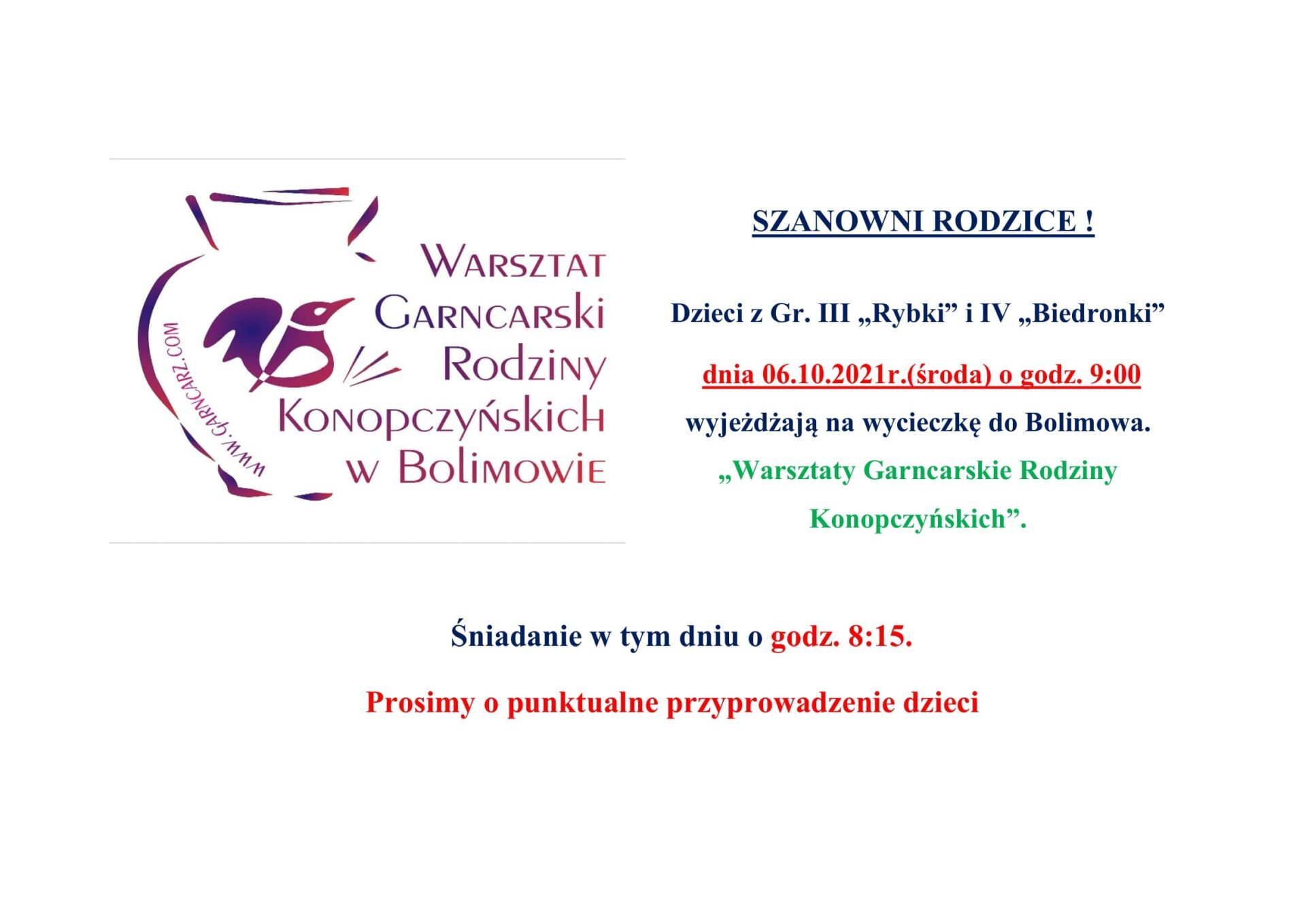 dnia 06.10.2021r.(środa) o godz. 9:00 wyjeżdżają na wycieczkę do Bolimowa. „Warsztaty Garncarskie Rodziny Konopczyńskich”.