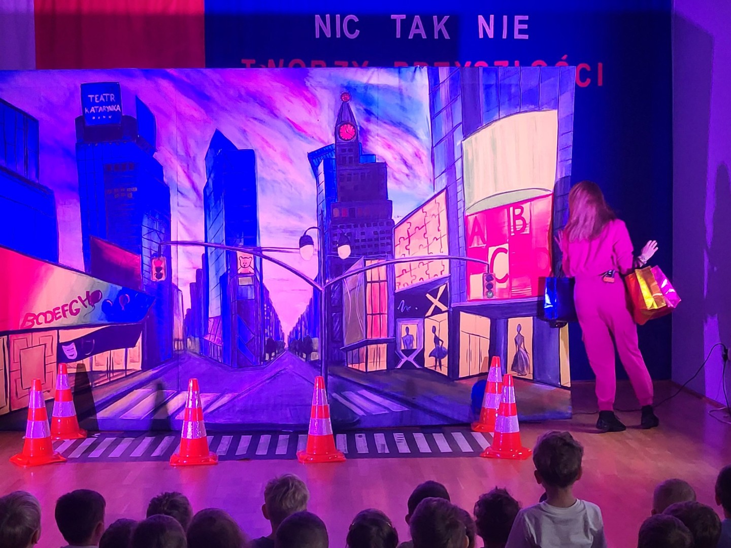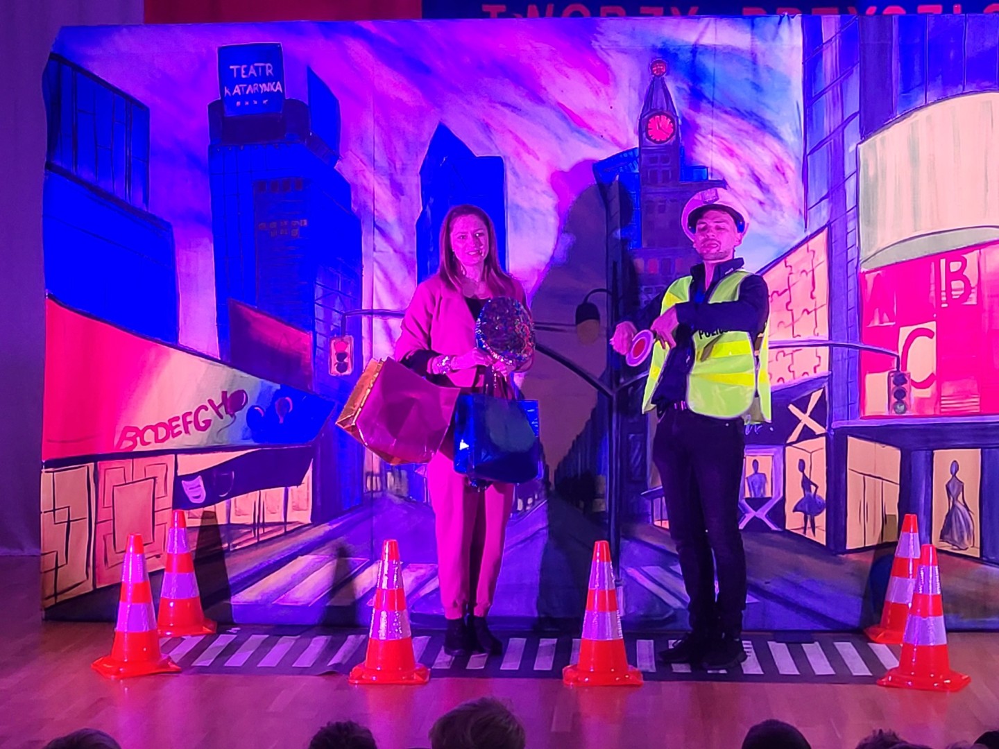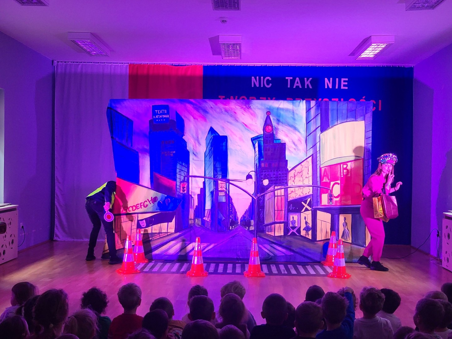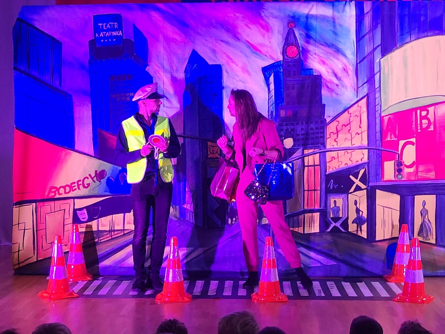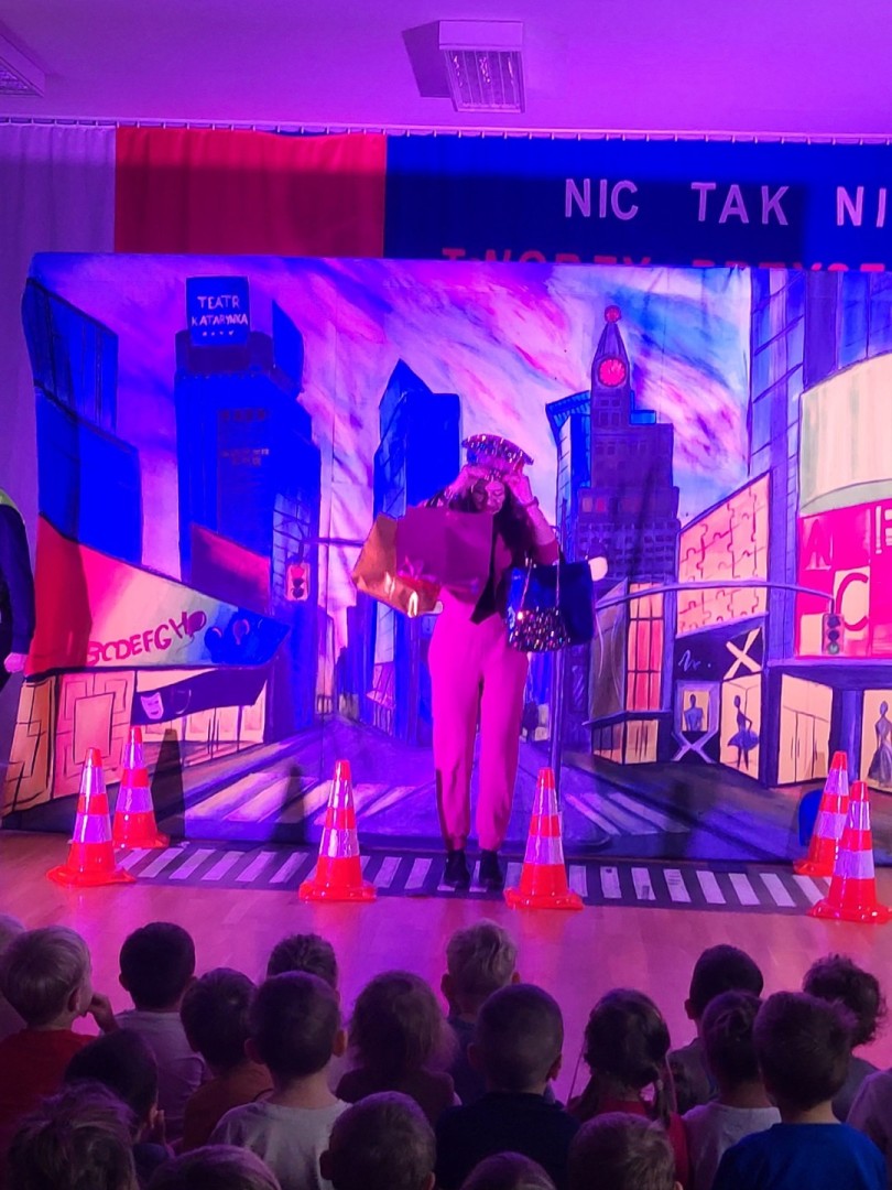 14 .11.2025r gościliśmy w naszym przedszkolu aktorów z Teatru “Katarynka, którzy zaprezentowali nam spektakl edukacyjno-profilaktyczny. Tematem przewodnim przedstawienia było bezpieczeństwo zarówno w ruchu drogowym, jak i podczas zagrożenia pożarem. Dzieci utrwaliły numer alarmowy 112, zobaczyły w akcji strażaka, dowiedziały się jak należy wychodzić z pomieszczenia zadymionego.Pan Policjant wraz z Wiolettą z Wydziału Ruchu Drogowego, nauczyli przedszkolaki jak przechodzić przez ulice. Na przykładzie nierozważnej Łucji i zabawnego kierowcy – Gienia, dzieci zobaczyły  do czego może dojść na ulicy jeśli będziemy nieuważni. Wszystko zostało przedstawione w kabaretowo-musicalowej formie.