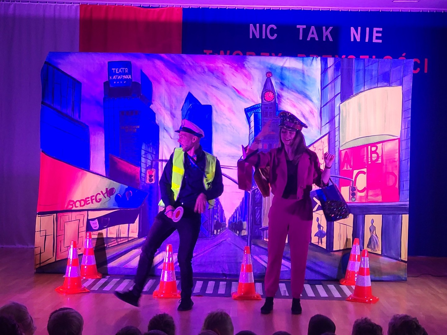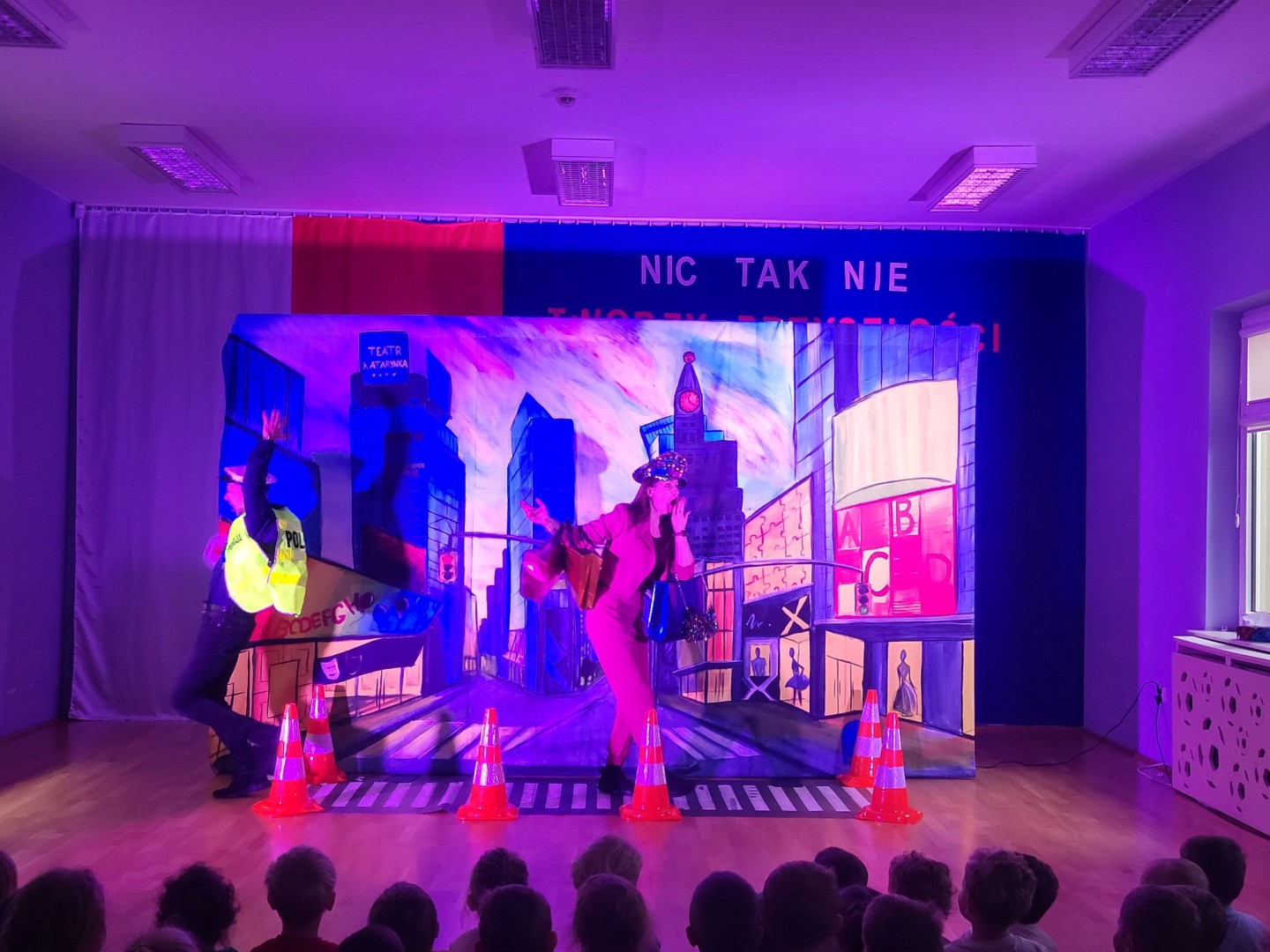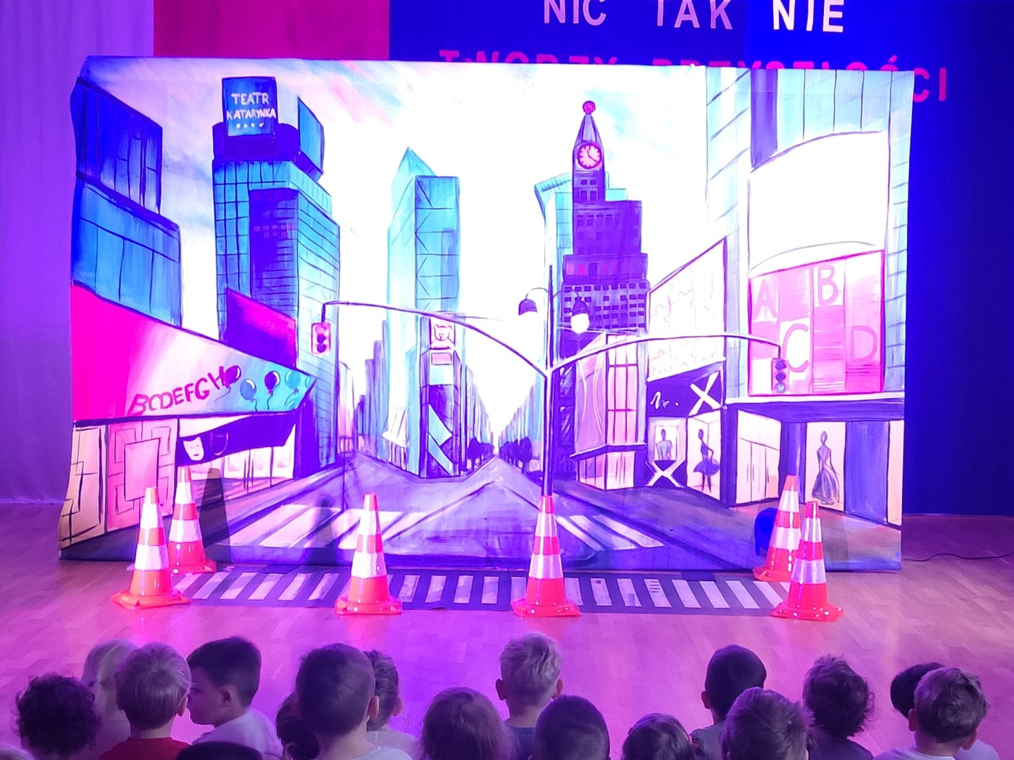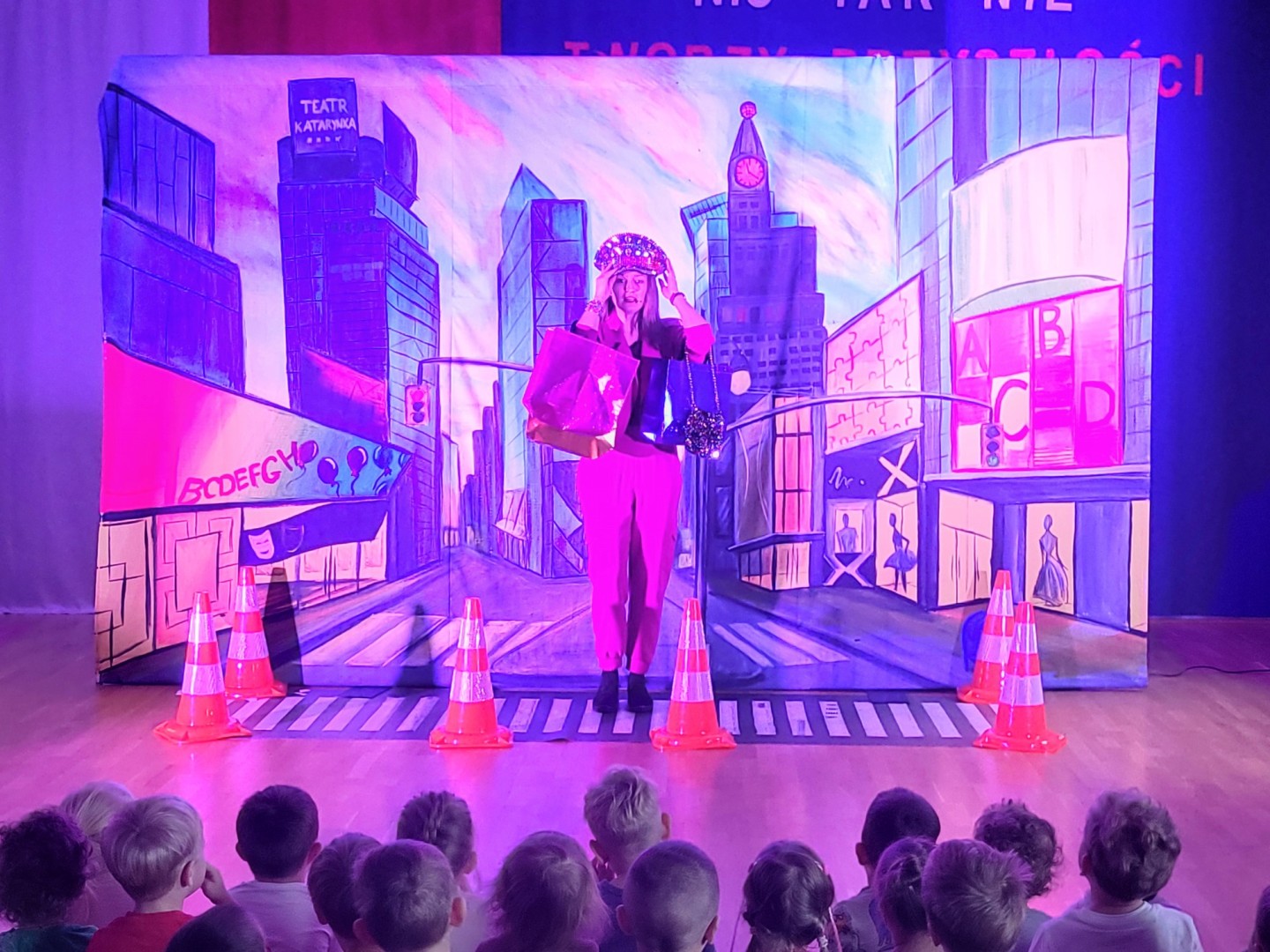14 .11.2025r gościliśmy w naszym przedszkolu aktorów z Teatru “Katarynka, którzy zaprezentowali nam spektakl edukacyjno-profilaktyczny. Tematem przewodnim przedstawienia było bezpieczeństwo zarówno w ruchu drogowym, jak i podczas zagrożenia pożarem. Dzieci utrwaliły numer alarmowy 112, zobaczyły w akcji strażaka, dowiedziały się jak należy wychodzić z pomieszczenia zadymionego.Pan Policjant wraz z Wiolettą z Wydziału Ruchu Drogowego, nauczyli przedszkolaki jak przechodzić przez ulice. Na przykładzie nierozważnej Łucji i zabawnego kierowcy – Gienia, dzieci zobaczyły  do czego może dojść na ulicy jeśli będziemy nieuważni. Wszystko zostało przedstawione w kabaretowo-musicalowej formie.
