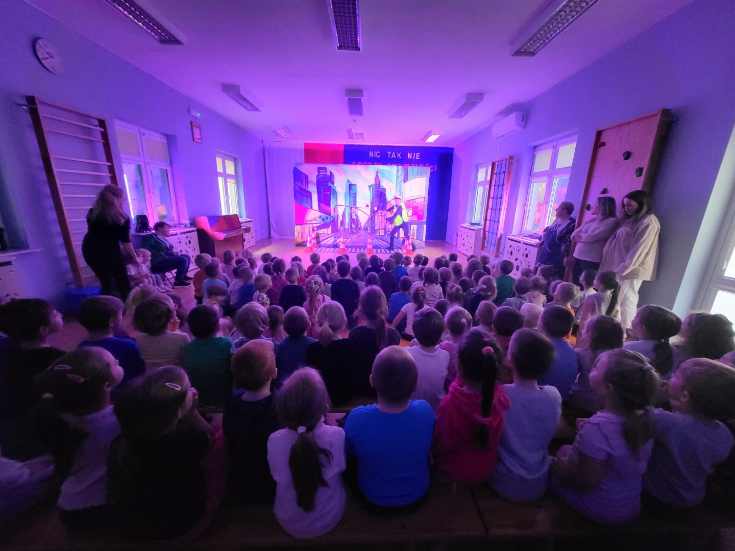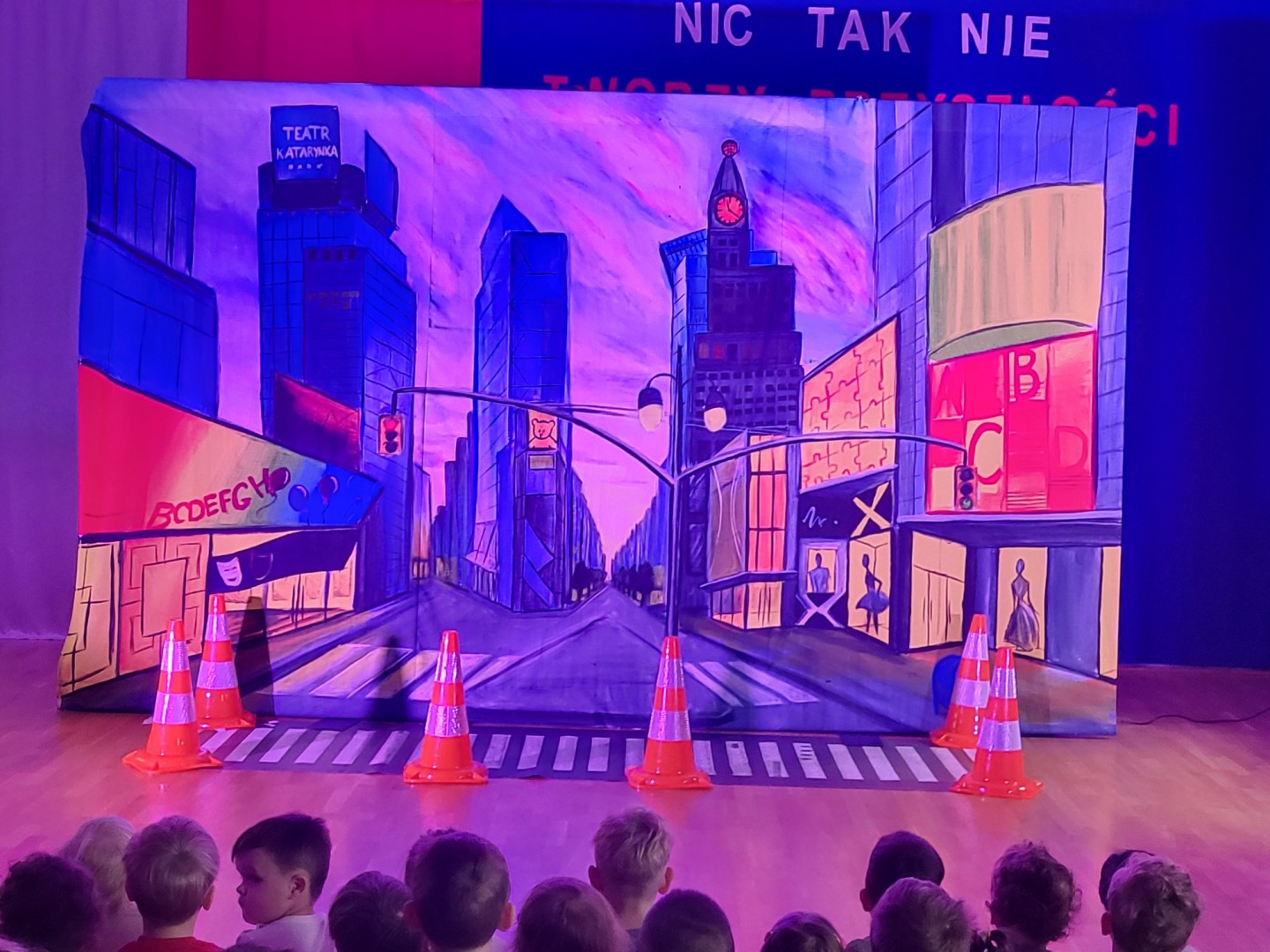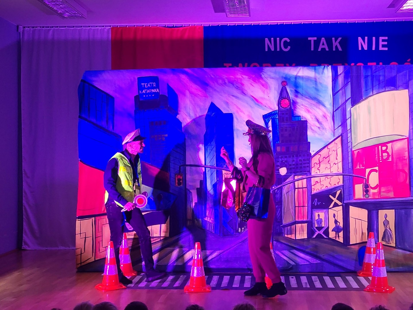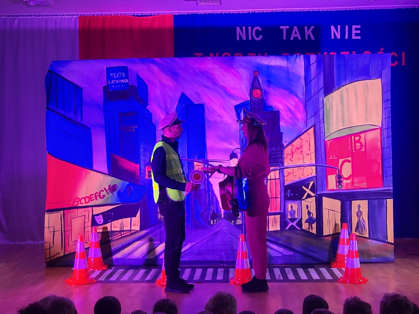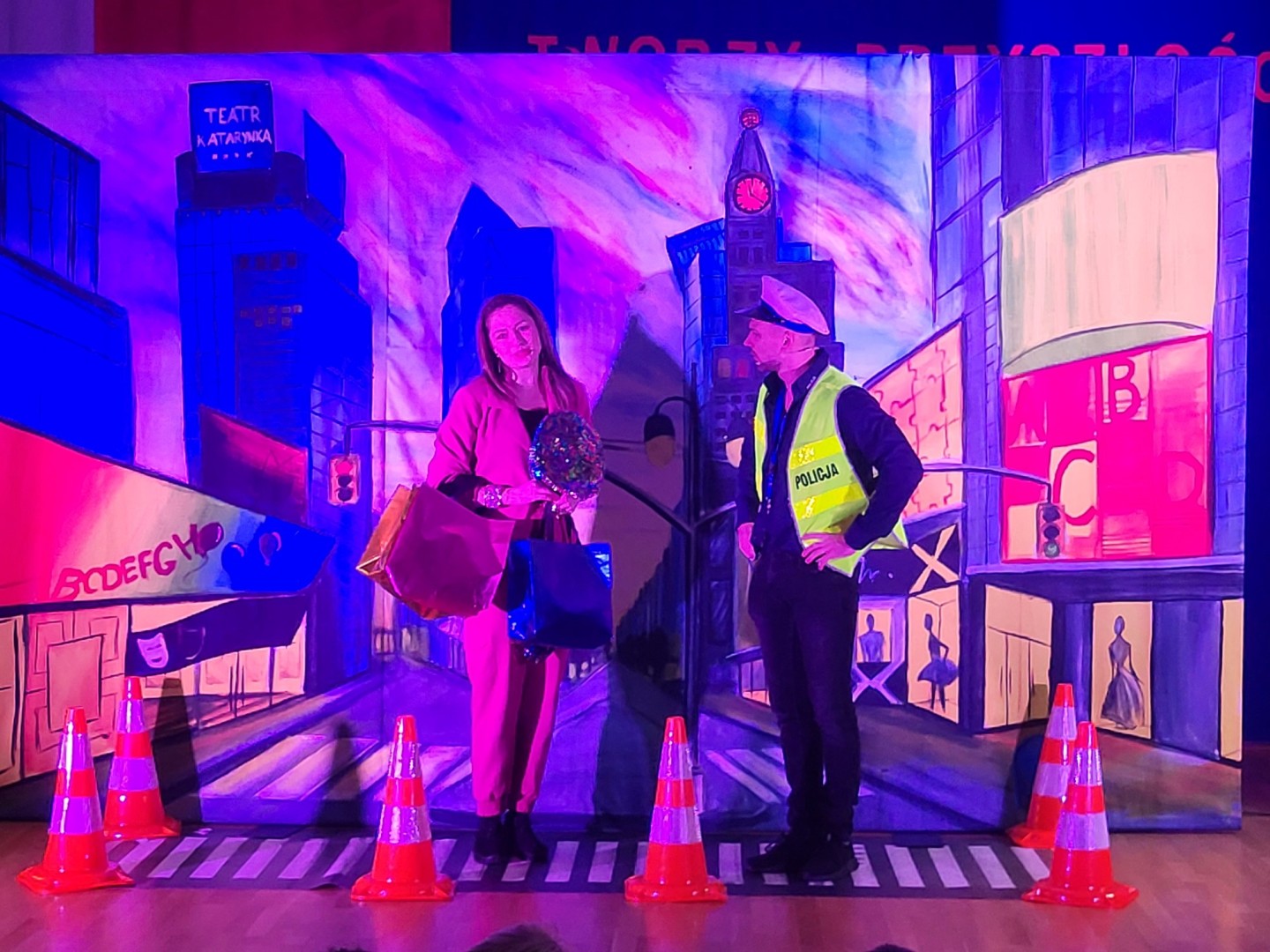 14 .11.2025r gościliśmy w naszym przedszkolu aktorów z Teatru “Katarynka, którzy zaprezentowali nam spektakl edukacyjno-profilaktyczny. Tematem przewodnim przedstawienia było bezpieczeństwo zarówno w ruchu drogowym, jak i podczas zagrożenia pożarem. Dzieci utrwaliły numer alarmowy 112, zobaczyły w akcji strażaka, dowiedziały się jak należy wychodzić z pomieszczenia zadymionego.Pan Policjant wraz z Wiolettą z Wydziału Ruchu Drogowego, nauczyli przedszkolaki jak przechodzić przez ulice. Na przykładzie nierozważnej Łucji i zabawnego kierowcy – Gienia, dzieci zobaczyły  do czego może dojść na ulicy jeśli będziemy nieuważni. Wszystko zostało przedstawione w kabaretowo-musicalowej formie.