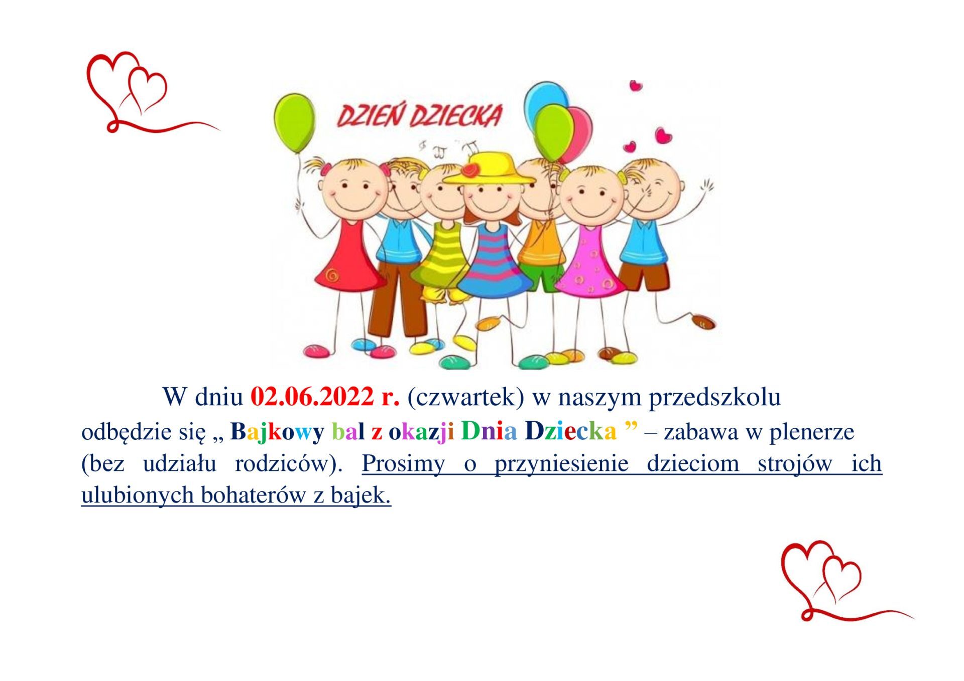 W dniu 02.06.2022 r. (czwartek) w naszym przedszkolu odbędzie się „ Bajkowy bal z okazji Dnia Dziecka ” – zabawa w plenerze
