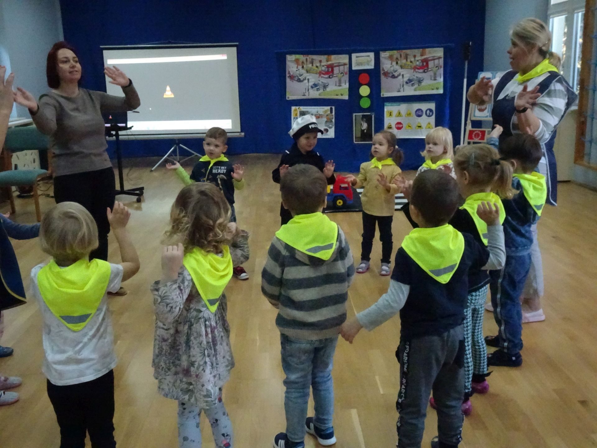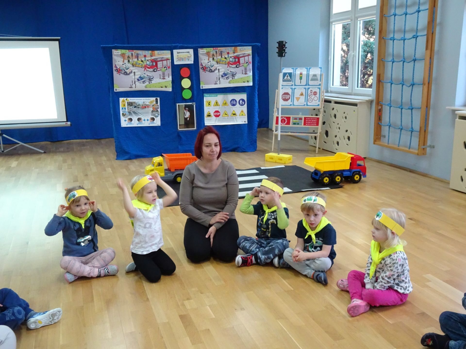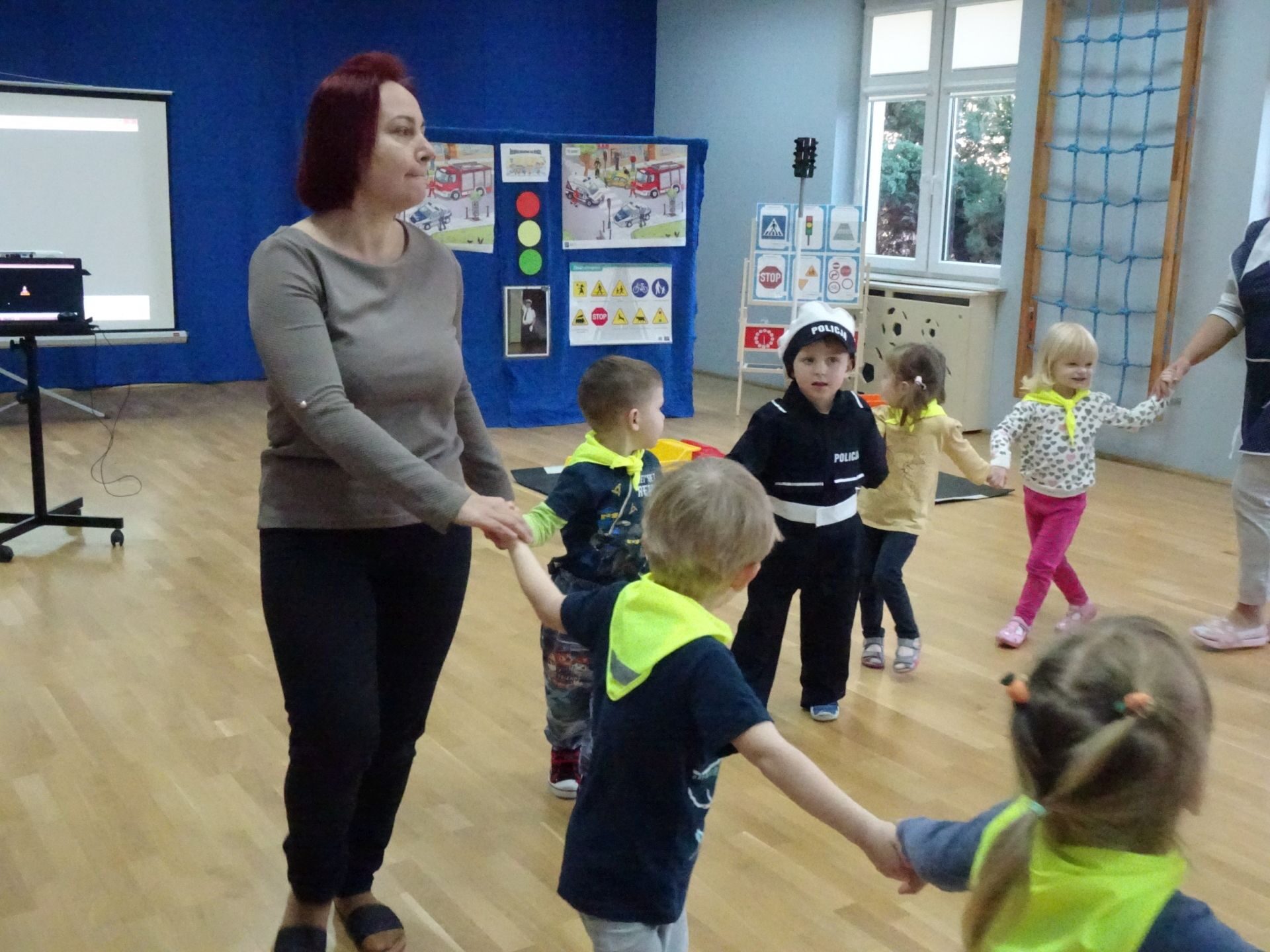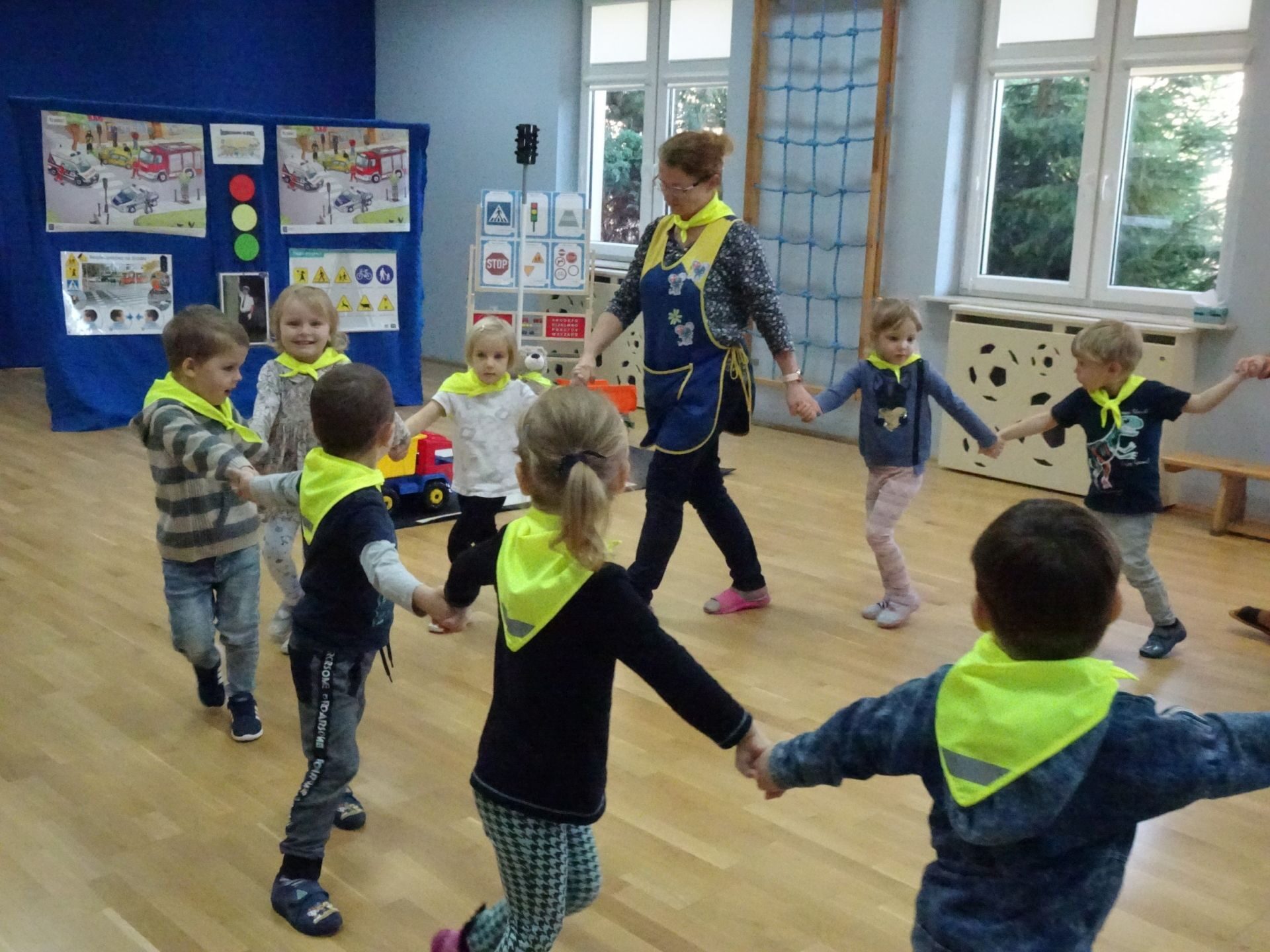 Dnia 29.10.2021 w grupie Kotki odbyły się zajęcia mające na celu rozwijanie u dzieci wiedzy na temat bezpieczeństwa w ruchu drogowym i pieszym. Dzieci ilustrowały ruchem piosenkę „Budujemy mosty”, słuchały opowiadania „Miś i światła sygnalizatora”. Oglądały film edukacyjny pt. „Zasady bezpieczeństwa drogowego” a następnie w odblaskowych chustach przechodziły przez przejście dla pieszych sprawdzając kolor światła na sygnalizatorze. Dziecko ubrane w strój Policjanta sprawdzało prawidłowość wykonania zadania. Na koniec dzieci doskonale bawiły się przy piosence „Kolorowe światła” w kierowców samochodów. Dzięki ciekawym zajęciom nasze przedszkolaki doskonale znają zasady ruchu drogowego.