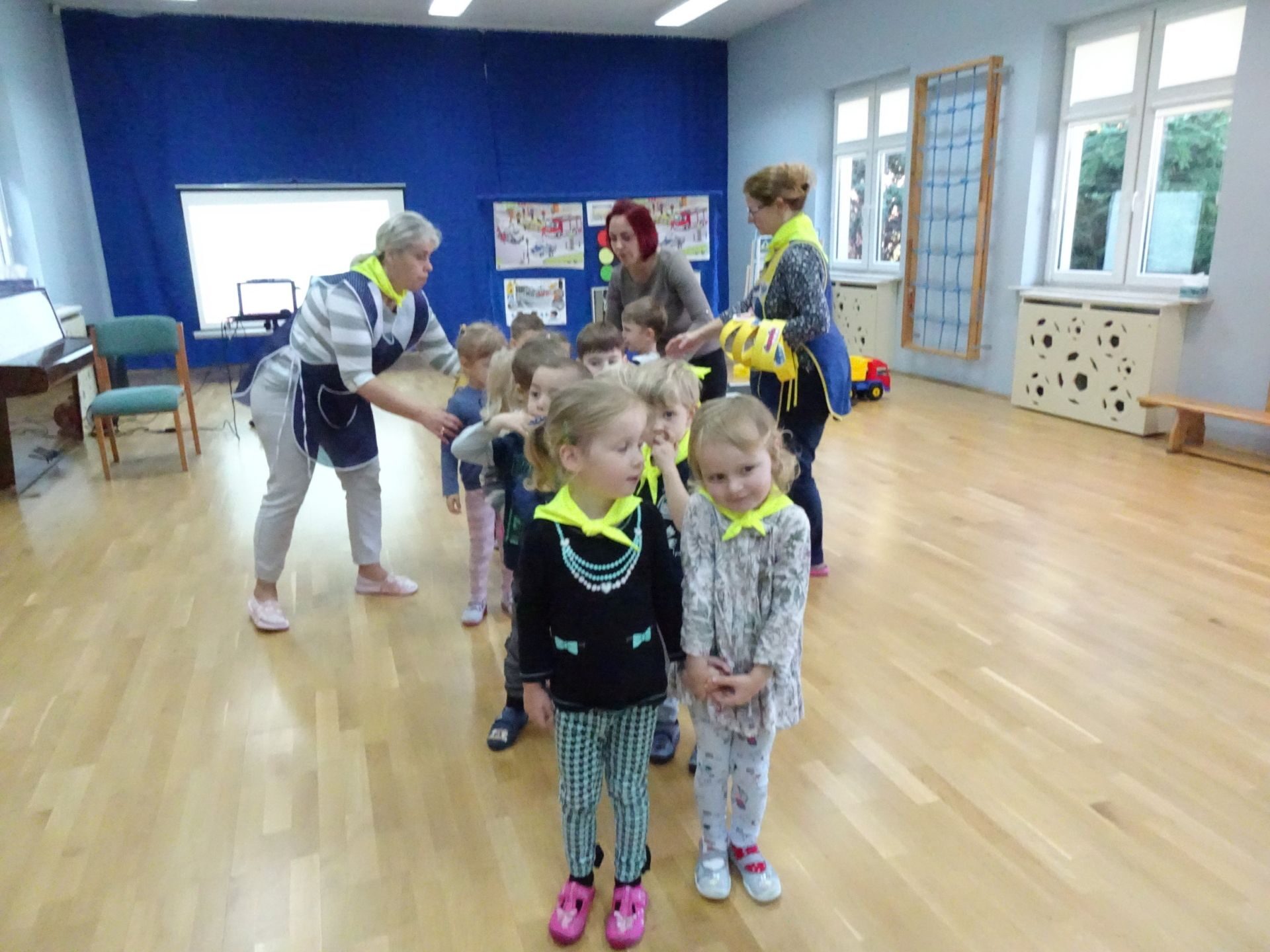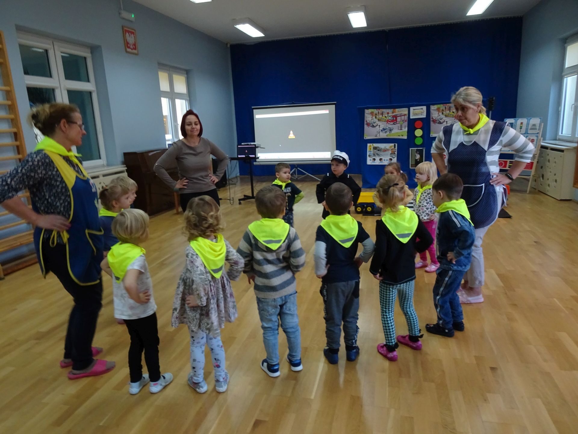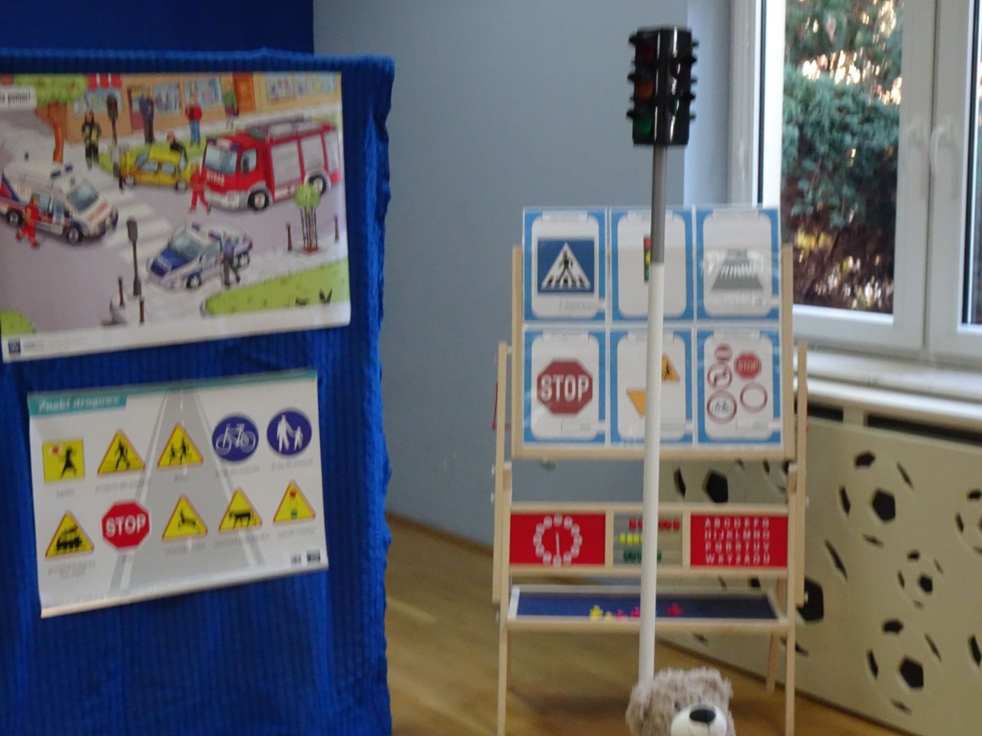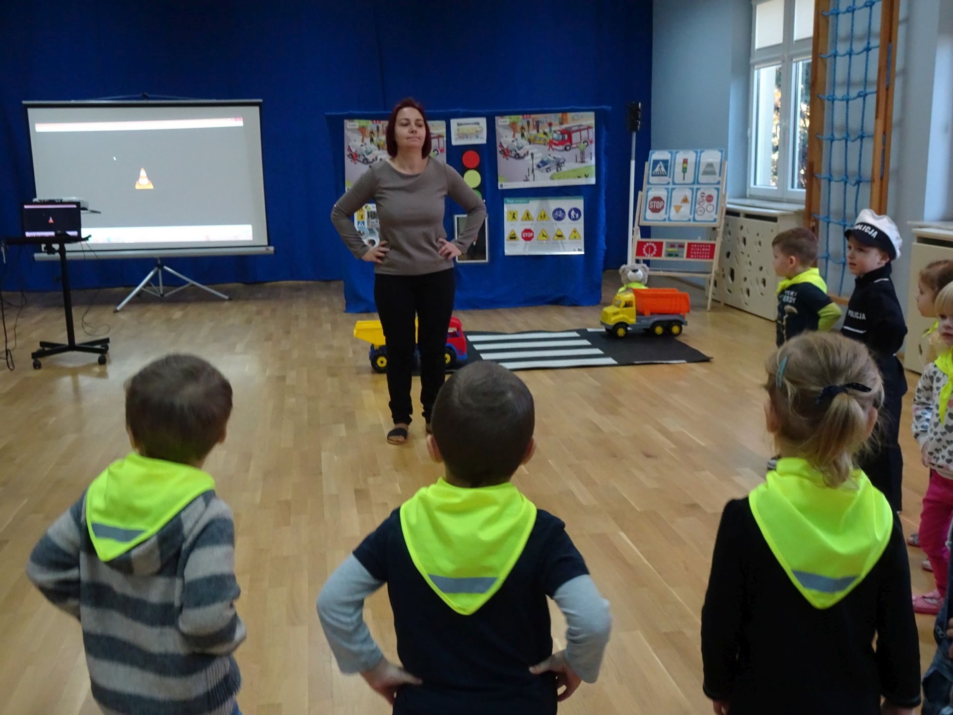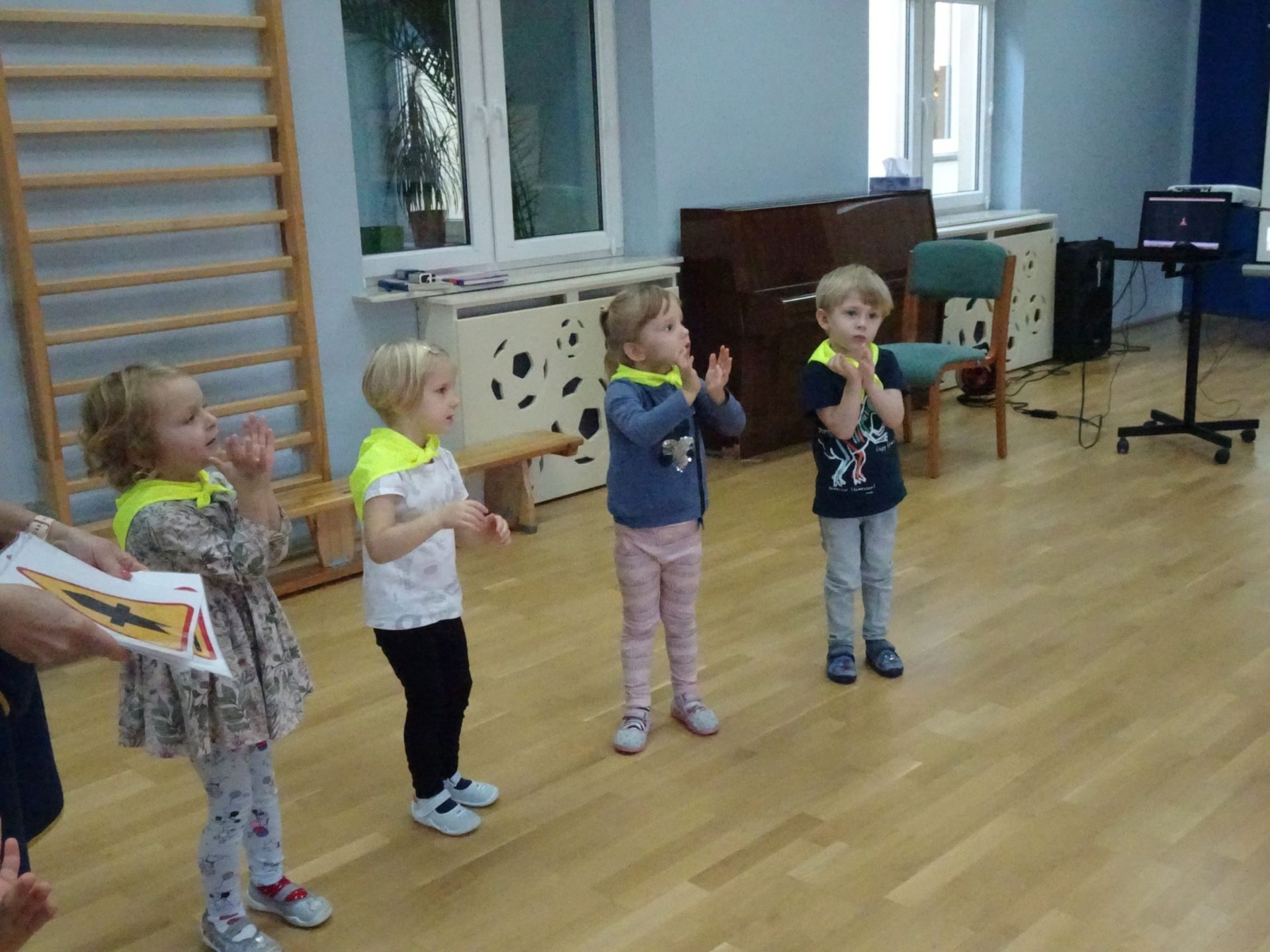 Dnia 29.10.2021 w grupie Kotki odbyły się zajęcia mające na celu rozwijanie u dzieci wiedzy na temat bezpieczeństwa w ruchu drogowym i pieszym. Dzieci ilustrowały ruchem piosenkę „Budujemy mosty”, słuchały opowiadania „Miś i światła sygnalizatora”. Oglądały film edukacyjny pt. „Zasady bezpieczeństwa drogowego” a następnie w odblaskowych chustach przechodziły przez przejście dla pieszych sprawdzając kolor światła na sygnalizatorze. Dziecko ubrane w strój Policjanta sprawdzało prawidłowość wykonania zadania. Na koniec dzieci doskonale bawiły się przy piosence „Kolorowe światła” w kierowców samochodów. Dzięki ciekawym zajęciom nasze przedszkolaki doskonale znają zasady ruchu drogowego.