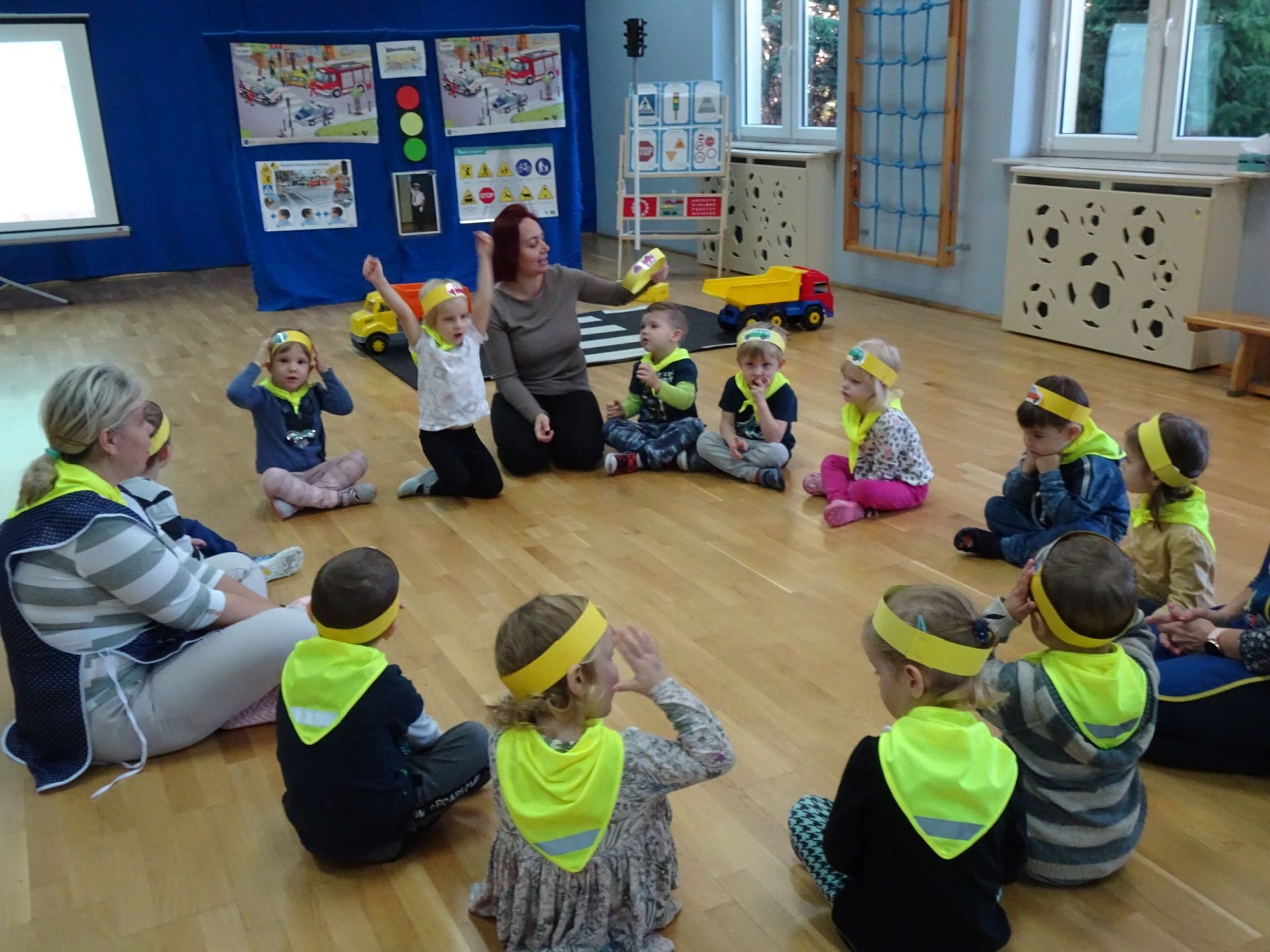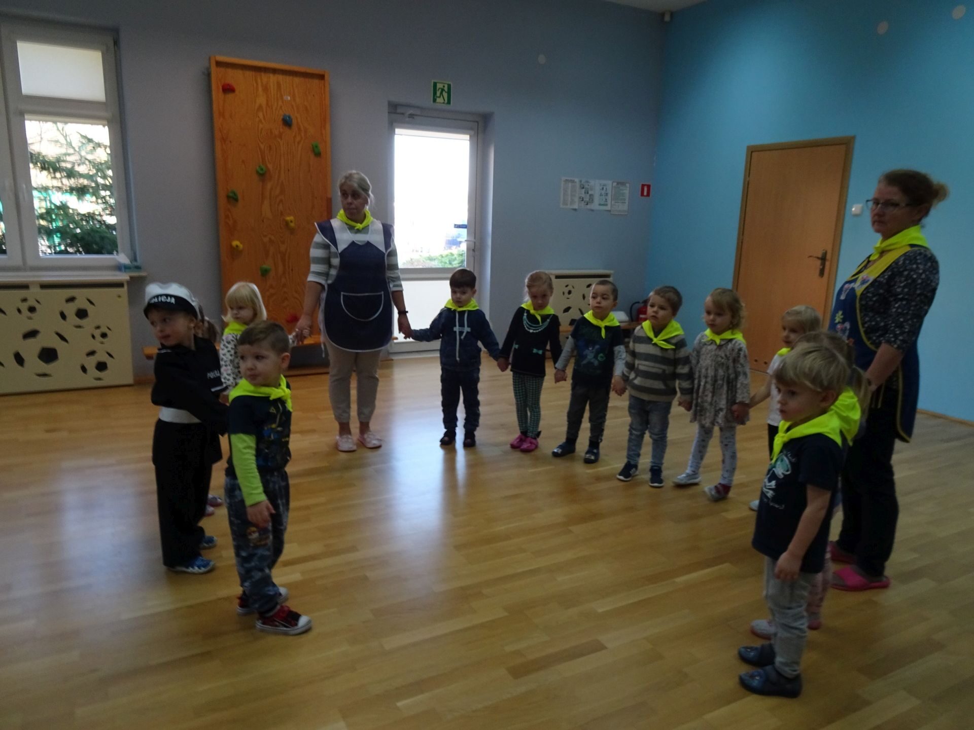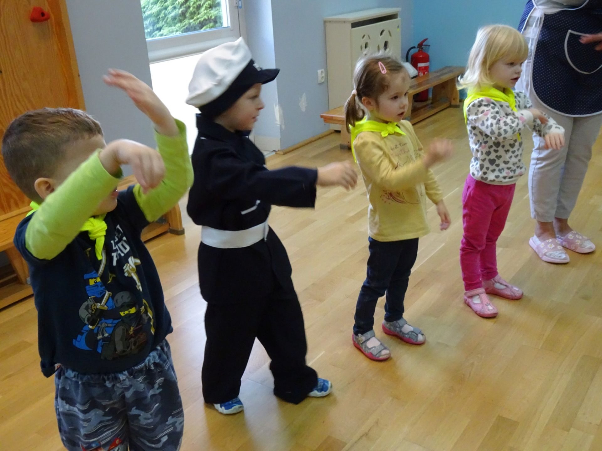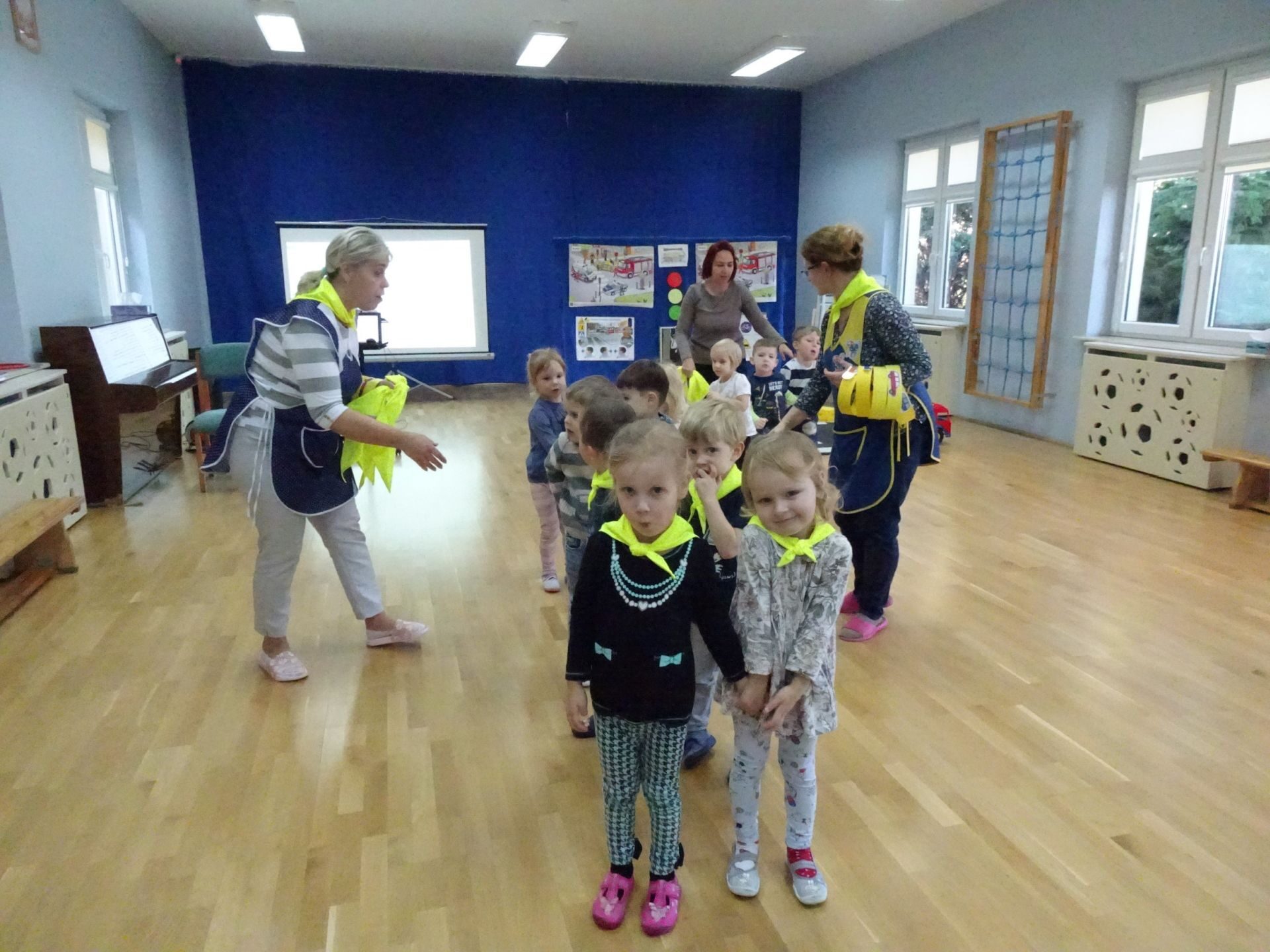 Dnia 29.10.2021 w grupie Kotki odbyły się zajęcia mające na celu rozwijanie u dzieci wiedzy na temat bezpieczeństwa w ruchu drogowym i pieszym. Dzieci ilustrowały ruchem piosenkę „Budujemy mosty”, słuchały opowiadania „Miś i światła sygnalizatora”. Oglądały film edukacyjny pt. „Zasady bezpieczeństwa drogowego” a następnie w odblaskowych chustach przechodziły przez przejście dla pieszych sprawdzając kolor światła na sygnalizatorze. Dziecko ubrane w strój Policjanta sprawdzało prawidłowość wykonania zadania. Na koniec dzieci doskonale bawiły się przy piosence „Kolorowe światła” w kierowców samochodów. Dzięki ciekawym zajęciom nasze przedszkolaki doskonale znają zasady ruchu drogowego.