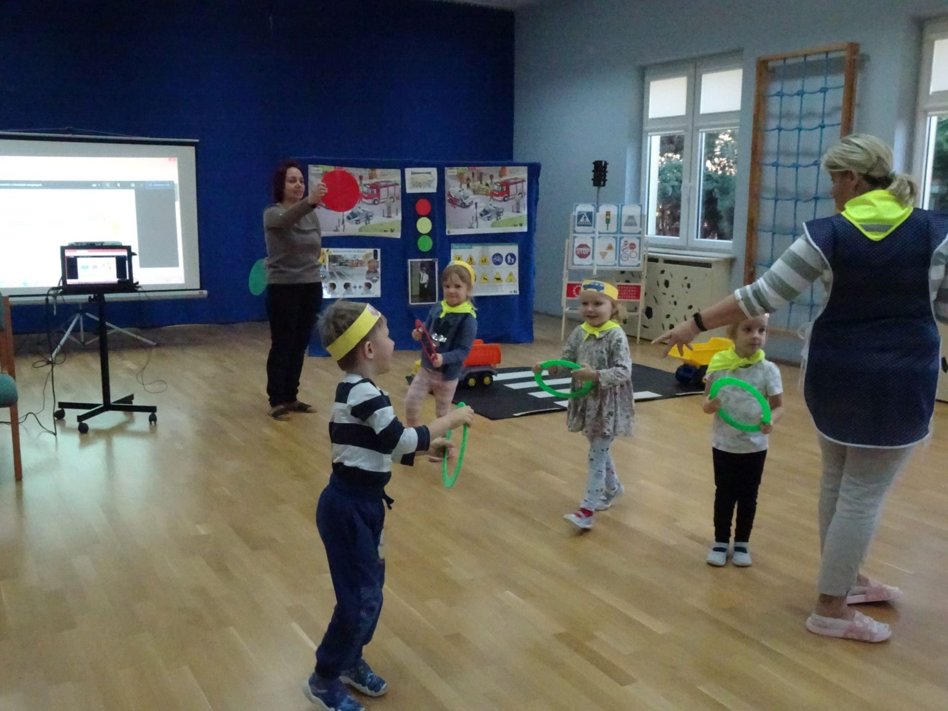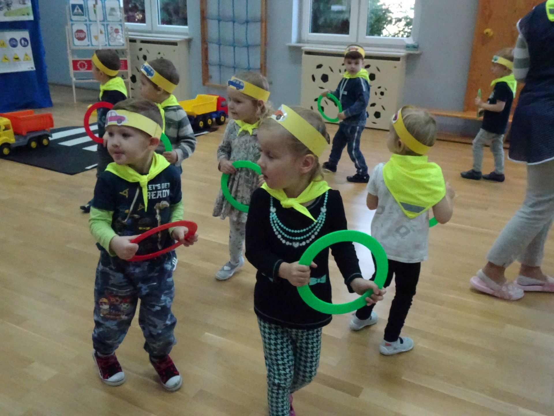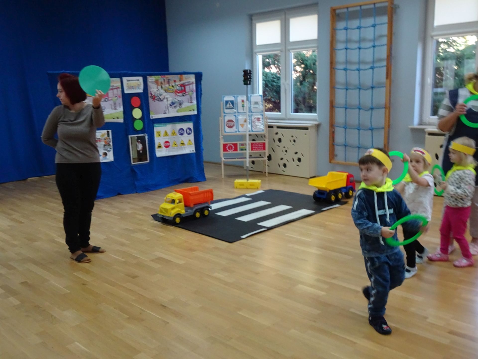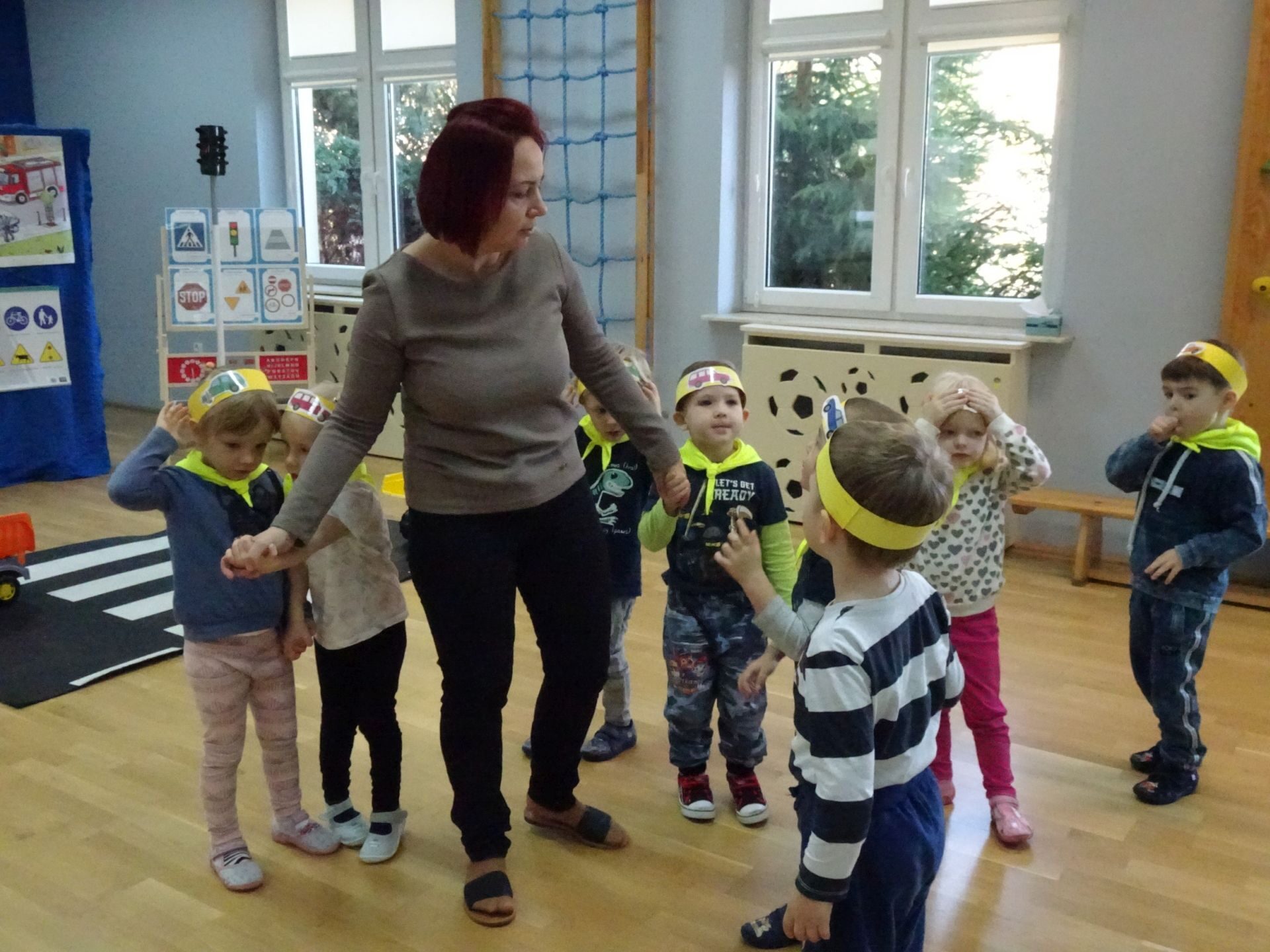 Dnia 29.10.2021 w grupie Kotki odbyły się zajęcia  mające na celu rozwijanie u dzieci wiedzy na temat bezpieczeństwa w ruchu drogowym i pieszym. Dzieci ilustrowały ruchem piosenkę „Budujemy mosty”, słuchały opowiadania „Miś i światła sygnalizatora”. Oglądały film edukacyjny pt. „Zasady bezpieczeństwa drogowego” a następnie w odblaskowych chustach przechodziły przez przejście dla pieszych sprawdzając kolor światła na sygnalizatorze. Dziecko ubrane w strój Policjanta sprawdzało prawidłowość wykonania zadania. Na koniec dzieci doskonale bawiły się przy piosence „Kolorowe światła” w kierowców samochodów. Dzięki ciekawym zajęciom nasze przedszkolaki doskonale znają zasady ruchu drogowego.