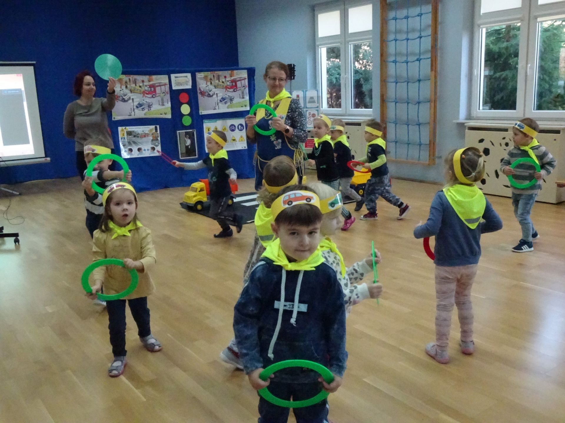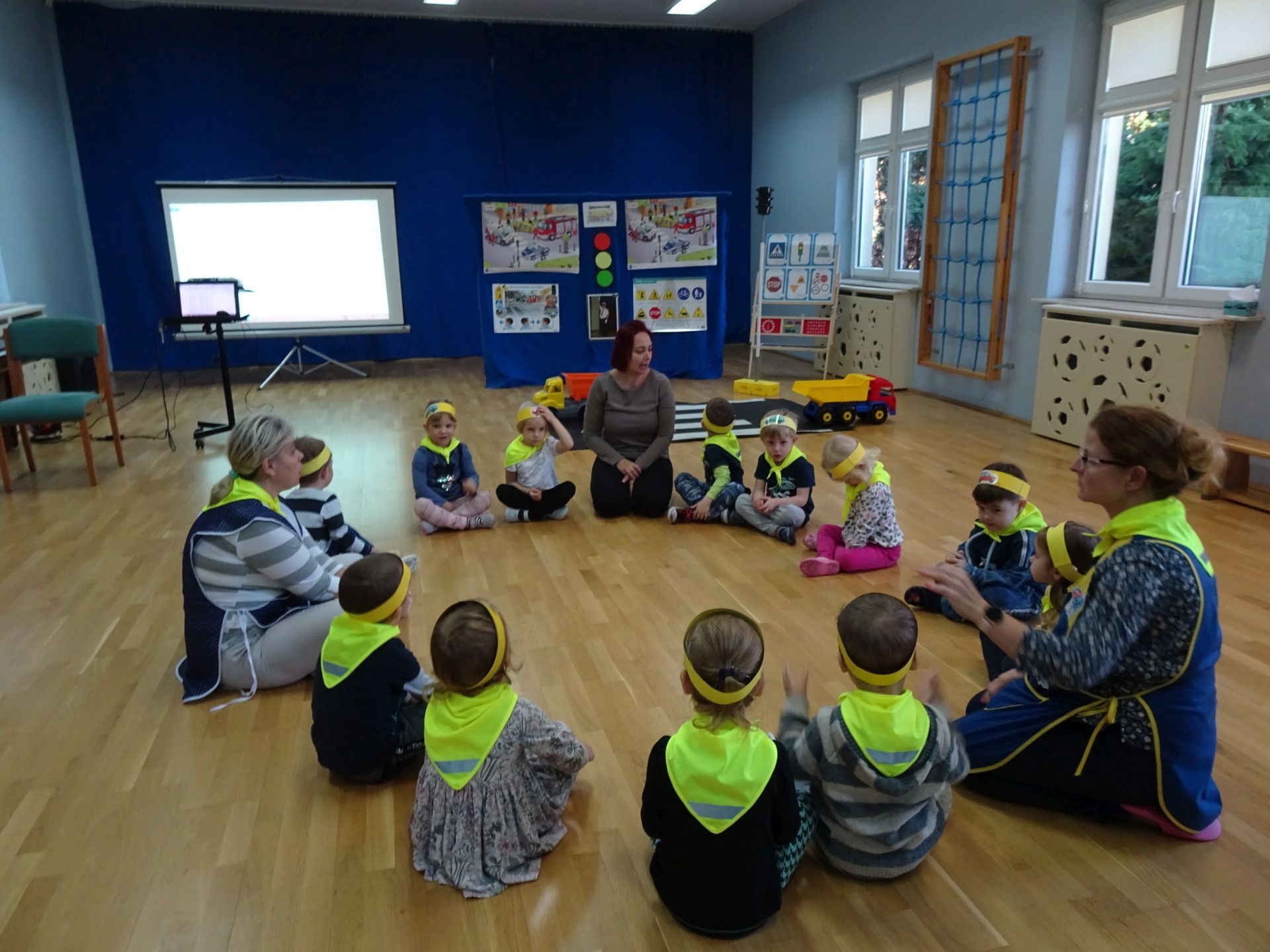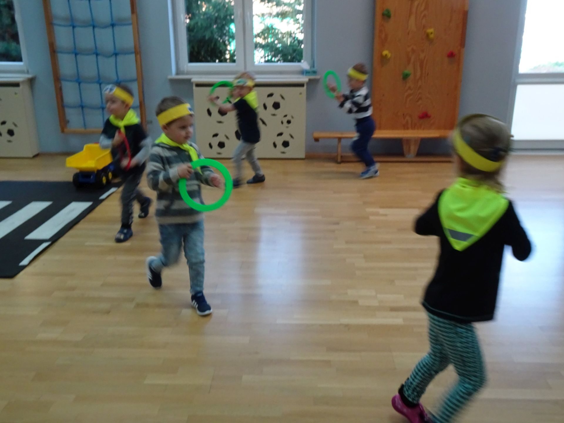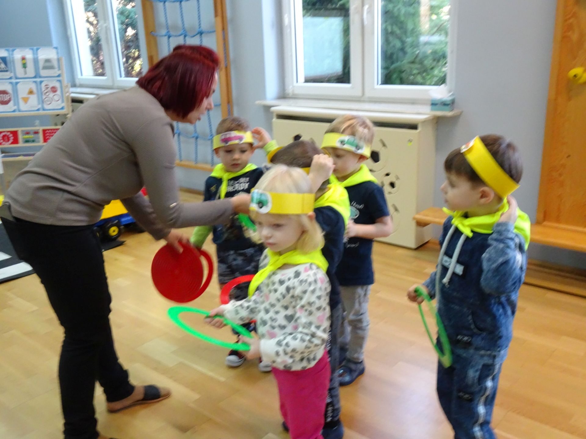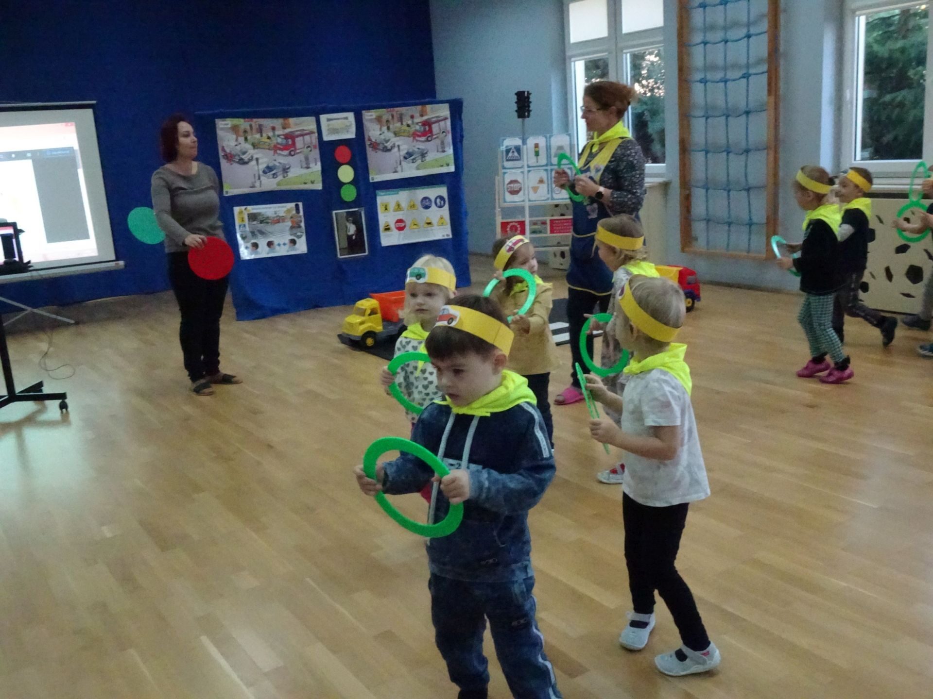 Dnia 29.10.2021 w grupie Kotki odbyły się zajęcia  mające na celu rozwijanie u dzieci wiedzy na temat bezpieczeństwa w ruchu drogowym i pieszym. Dzieci ilustrowały ruchem piosenkę „Budujemy mosty”, słuchały opowiadania „Miś i światła sygnalizatora”. Oglądały film edukacyjny pt. „Zasady bezpieczeństwa drogowego” a następnie w odblaskowych chustach przechodziły przez przejście dla pieszych sprawdzając kolor światła na sygnalizatorze. Dziecko ubrane w strój Policjanta sprawdzało prawidłowość wykonania zadania. Na koniec dzieci doskonale bawiły się przy piosence „Kolorowe światła” w kierowców samochodów. Dzięki ciekawym zajęciom nasze przedszkolaki doskonale znają zasady ruchu drogowego.