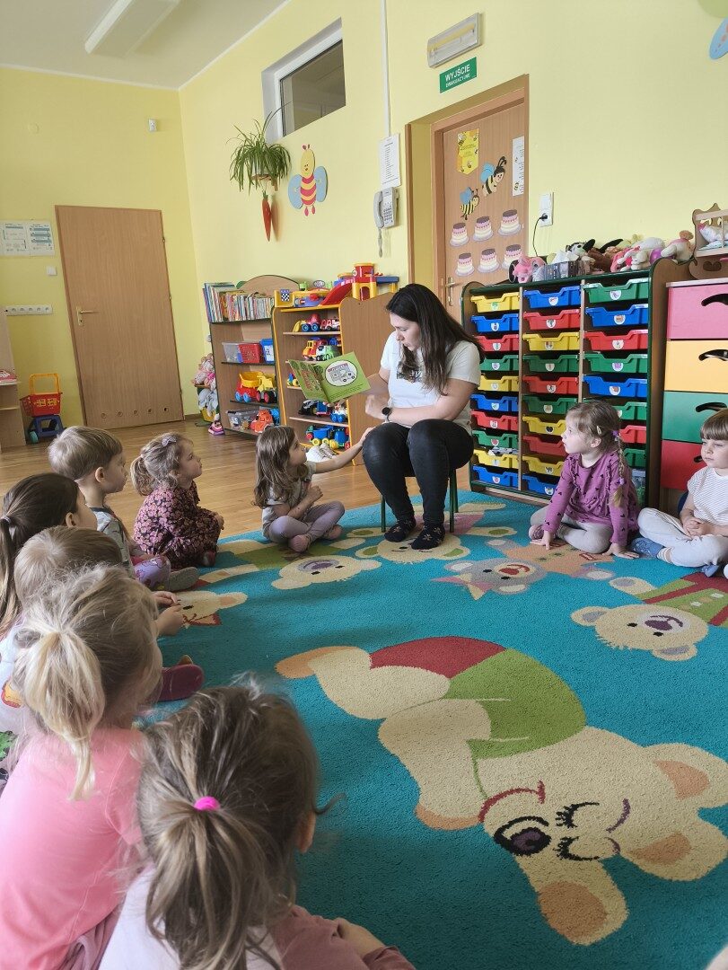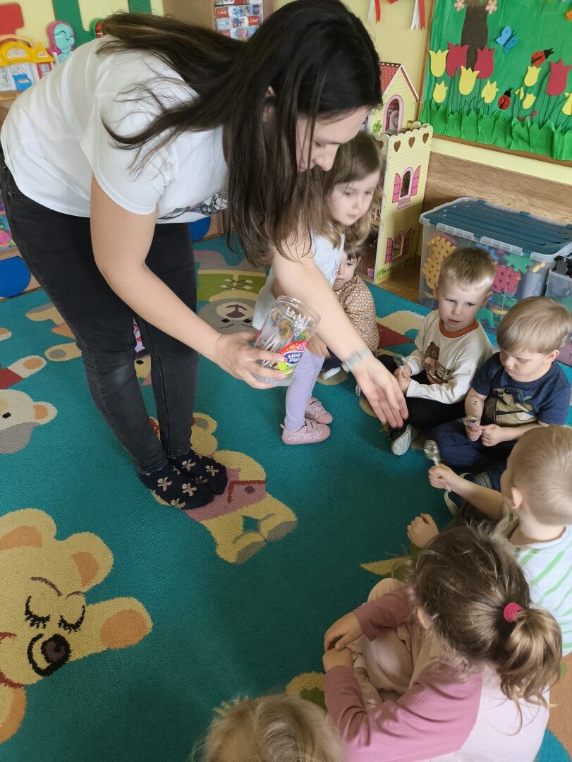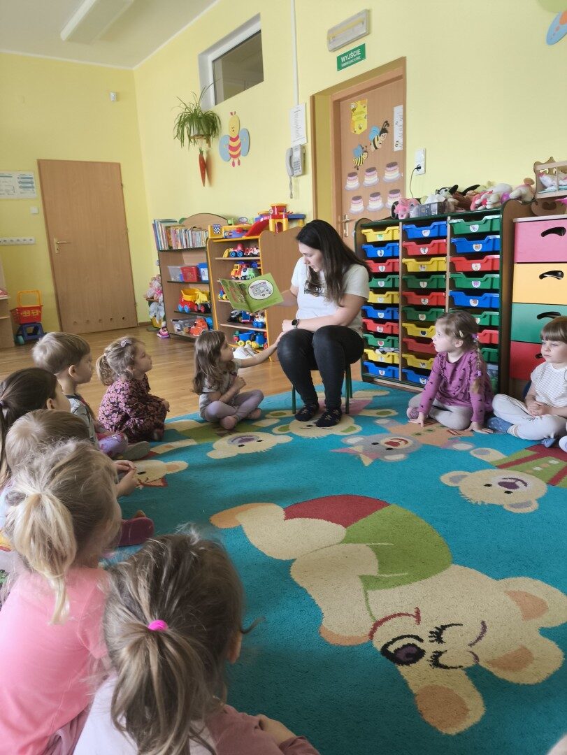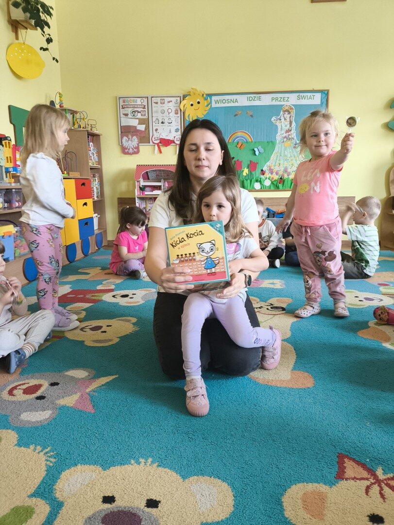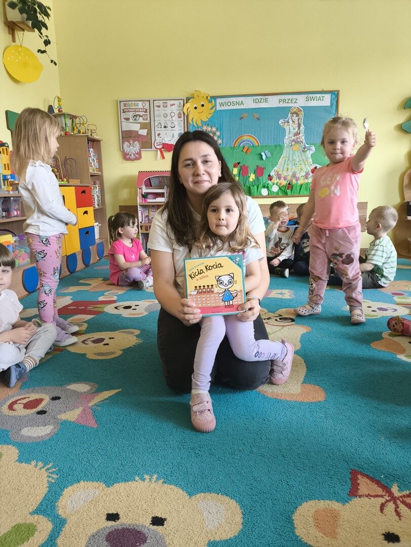 Dnia 1 kwietnia nasze przedszkole odwiedziła mama Martynki Pani Marta. Przeczytała dzieciom bajkę A. Głowińskiej pt.: „Kocia Kicia w aptece”. Przedszkolaki z dużym zainteresowaniem wsłuchiwały się w odpowiednio zaintonowany tekst utworu. Natomiast piękne ilustracje skupiały uwagę wzrokową dzieci. Na zakończenie spotkania dzieci zostały nagrodzone pysznymi lizakami.