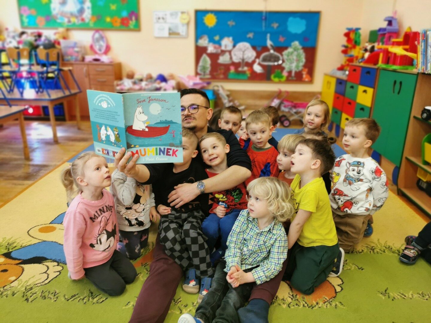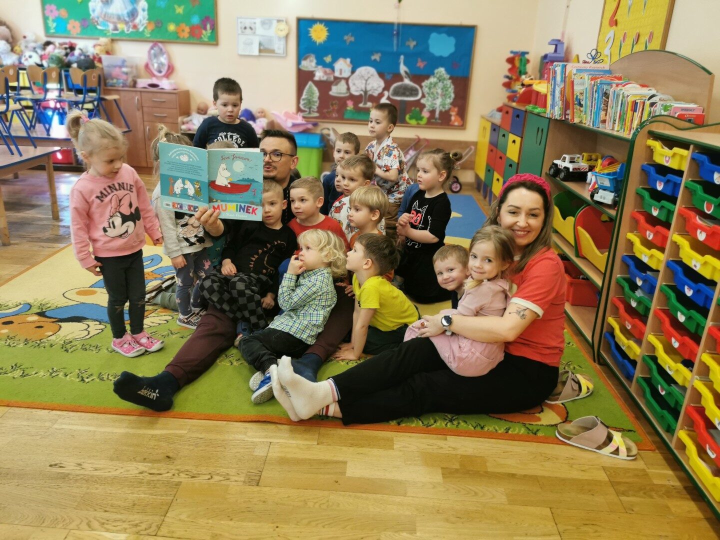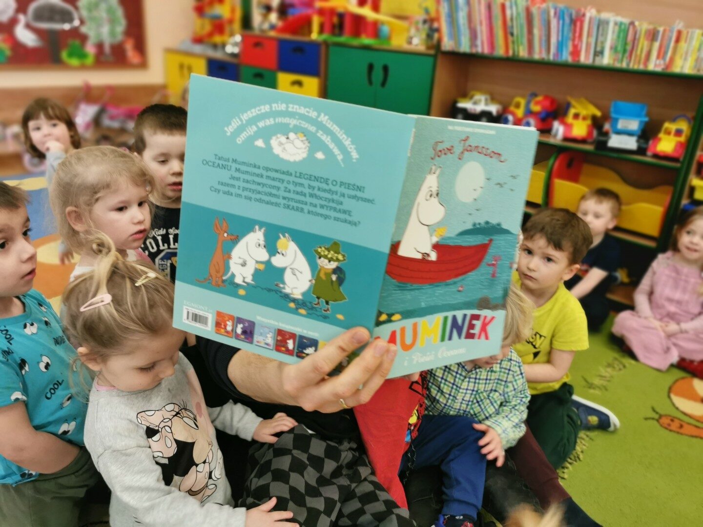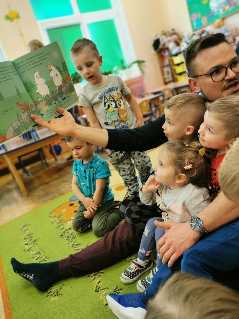 Dnia 28.03.2025 r grupę „Kotki” odwiedził kolejny raz tata Ludwika S. Pan Konrad wprowadził nas w świat Muminków.