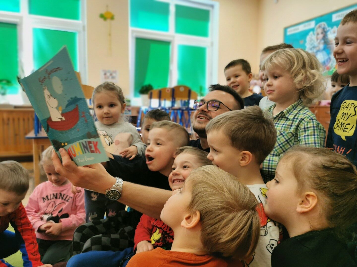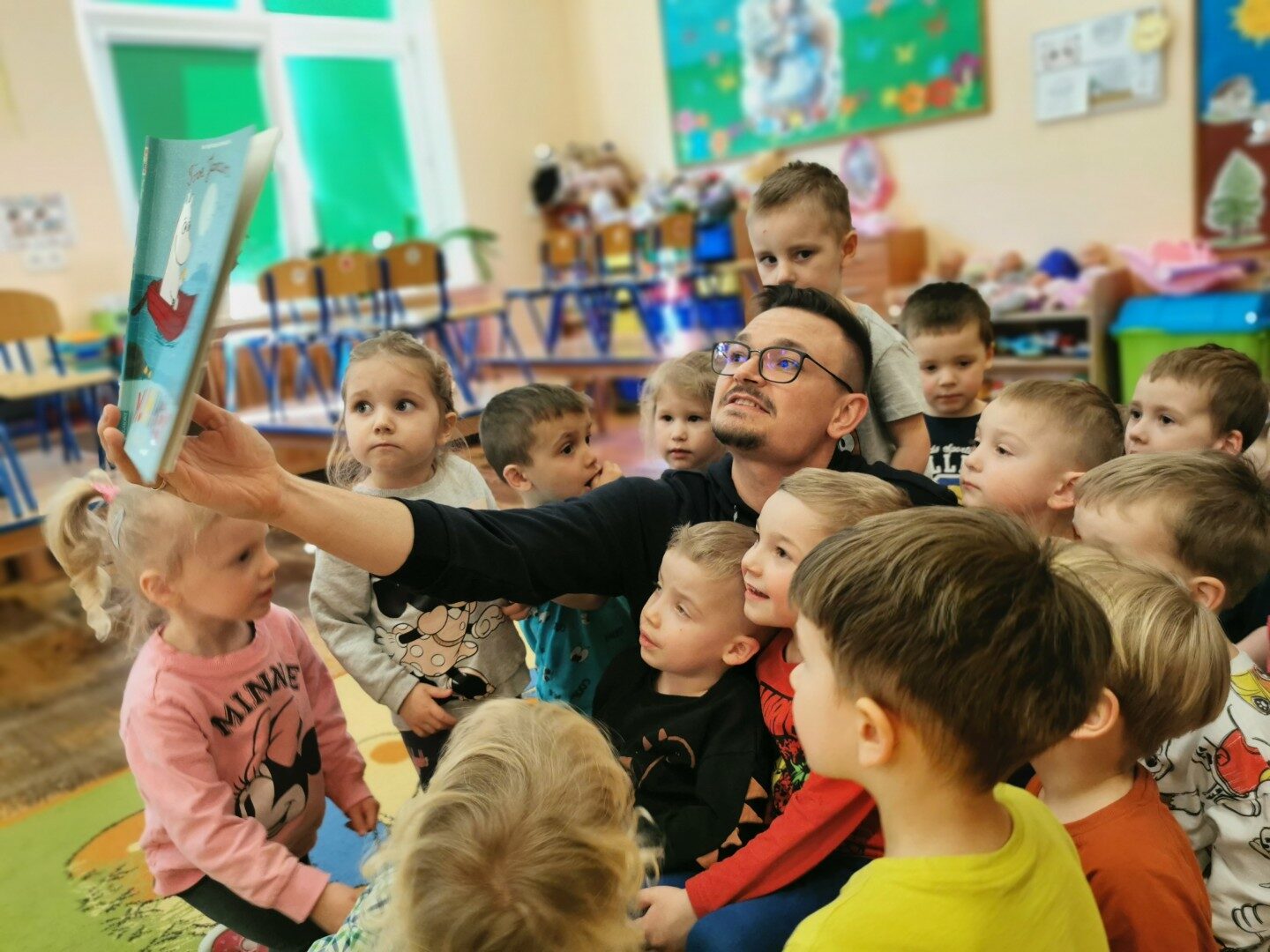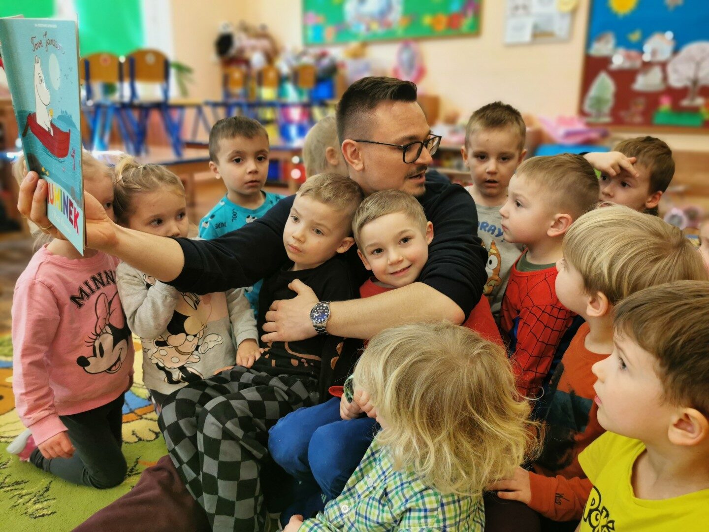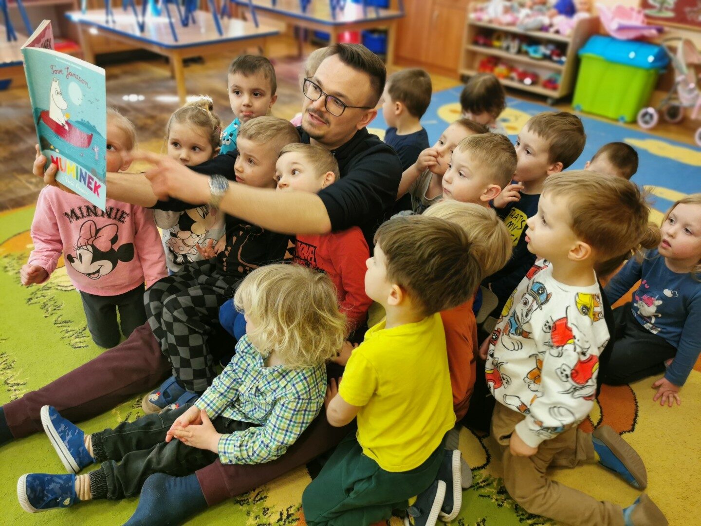 Dnia 28.03.2025 r grupę „Kotki” odwiedził kolejny raz tata Ludwika S. Pan Konrad wprowadził nas w świat Muminków.