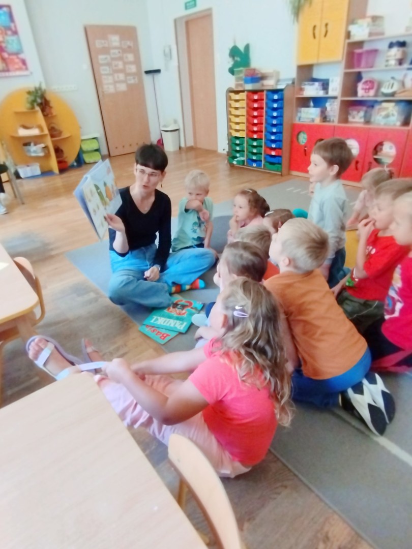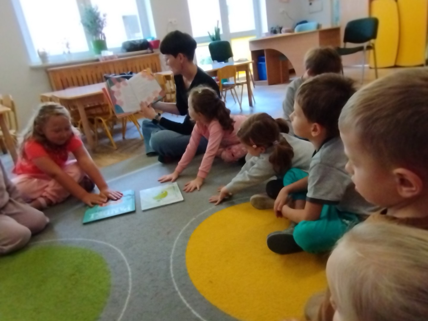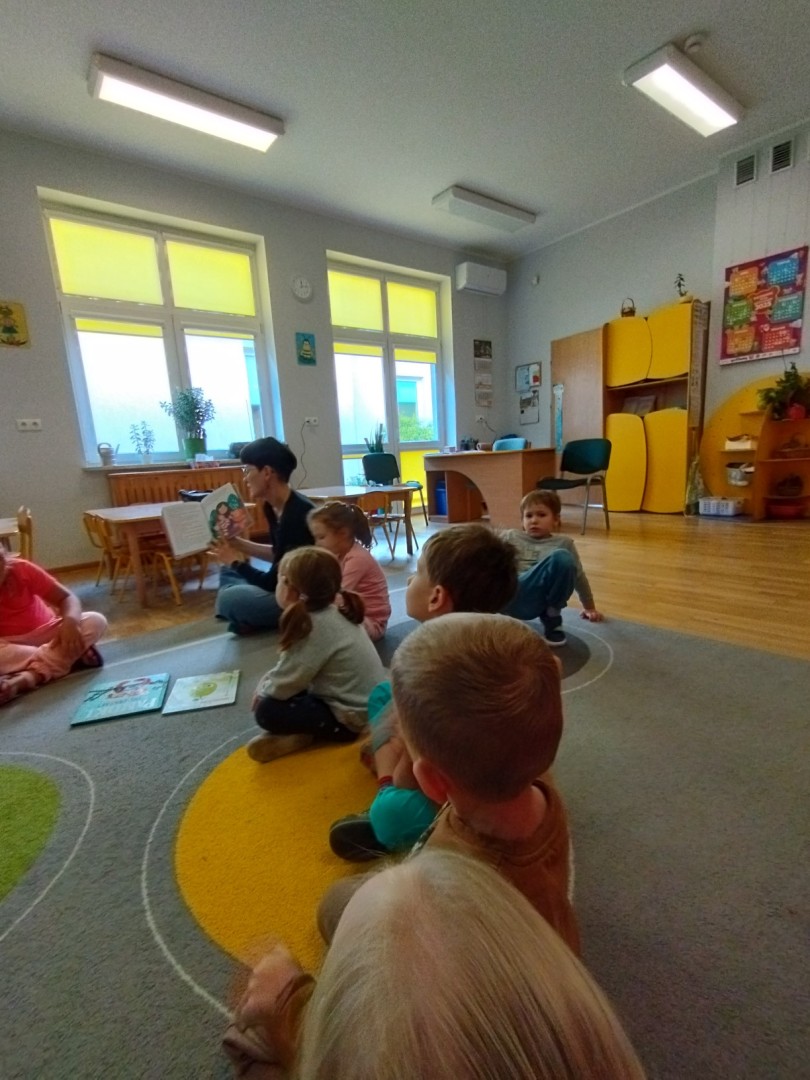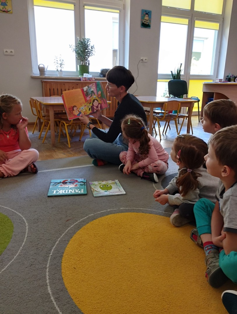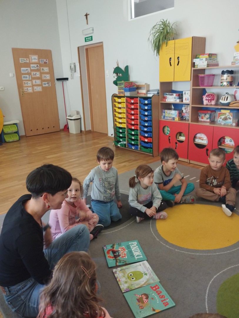 Dnia 1.10.2025rr. naszą grupę odwiedziła Pani Gabriela- mama Tymona. Nasz gość zabrał dzieci w świat przepięknej literatury dziecięcej. Przedszkolaki wysłuchały przygód bohaterów opowiadań pt. „ Basia i granice” oraz” Skwaszone winogrono”. Pełne humoru sytuacje zawarte w opowiadaniach wywołały na twarzach dzieci mnóstwo uśmiechu i radości . Dziękujemy mamie Tymona za rozwijanie w dzieciach wyobraźni i pasji czytelniczych.