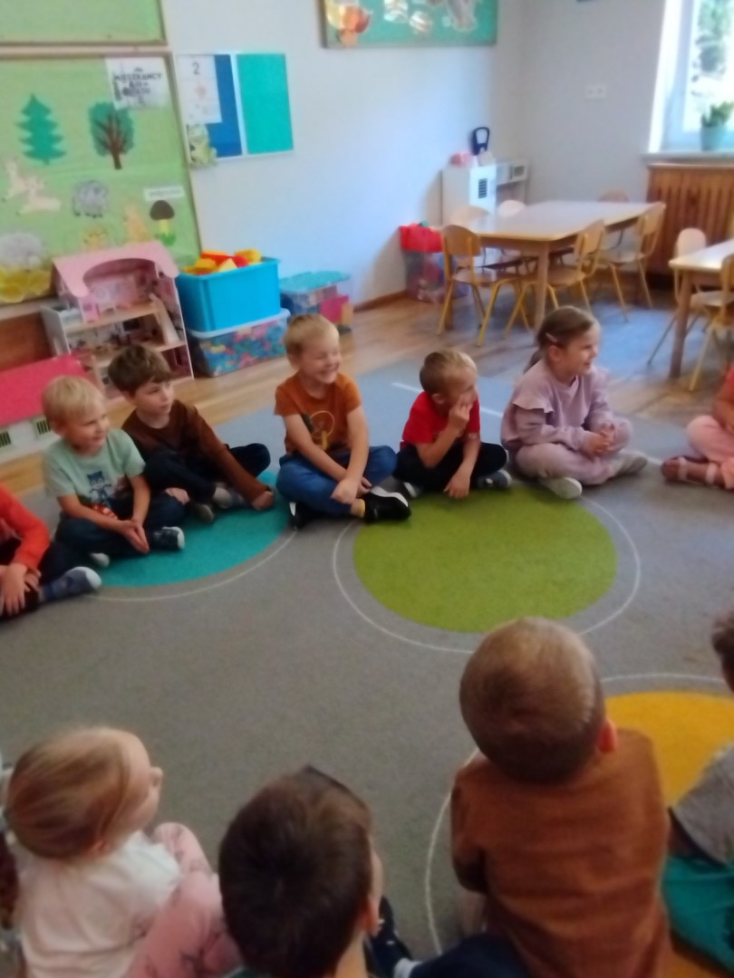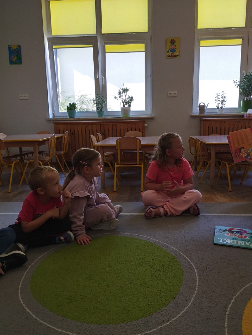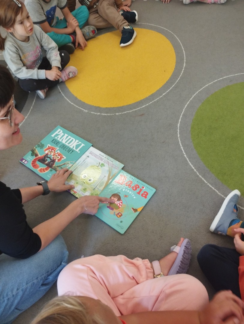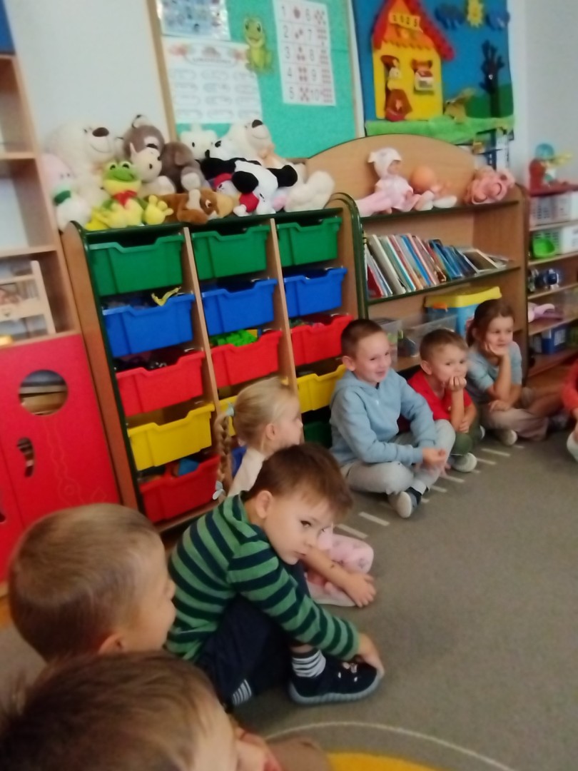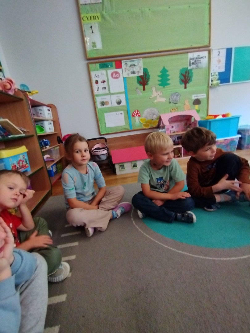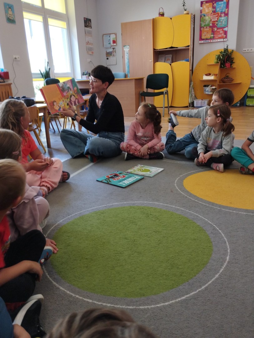 Dnia 1.10.2025rr. naszą grupę odwiedziła Pani Gabriela- mama Tymona. Nasz gość zabrał dzieci w świat przepięknej literatury dziecięcej. Przedszkolaki wysłuchały przygód bohaterów opowiadań pt. „ Basia i granice” oraz” Skwaszone winogrono”. Pełne humoru sytuacje zawarte w opowiadaniach wywołały na twarzach dzieci mnóstwo uśmiechu i radości . Dziękujemy mamie Tymona za rozwijanie w dzieciach wyobraźni i pasji czytelniczych.