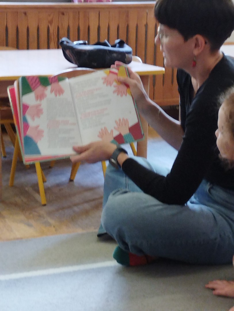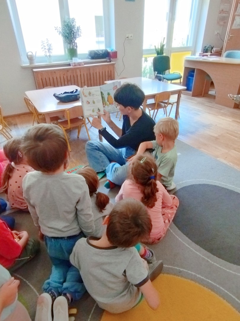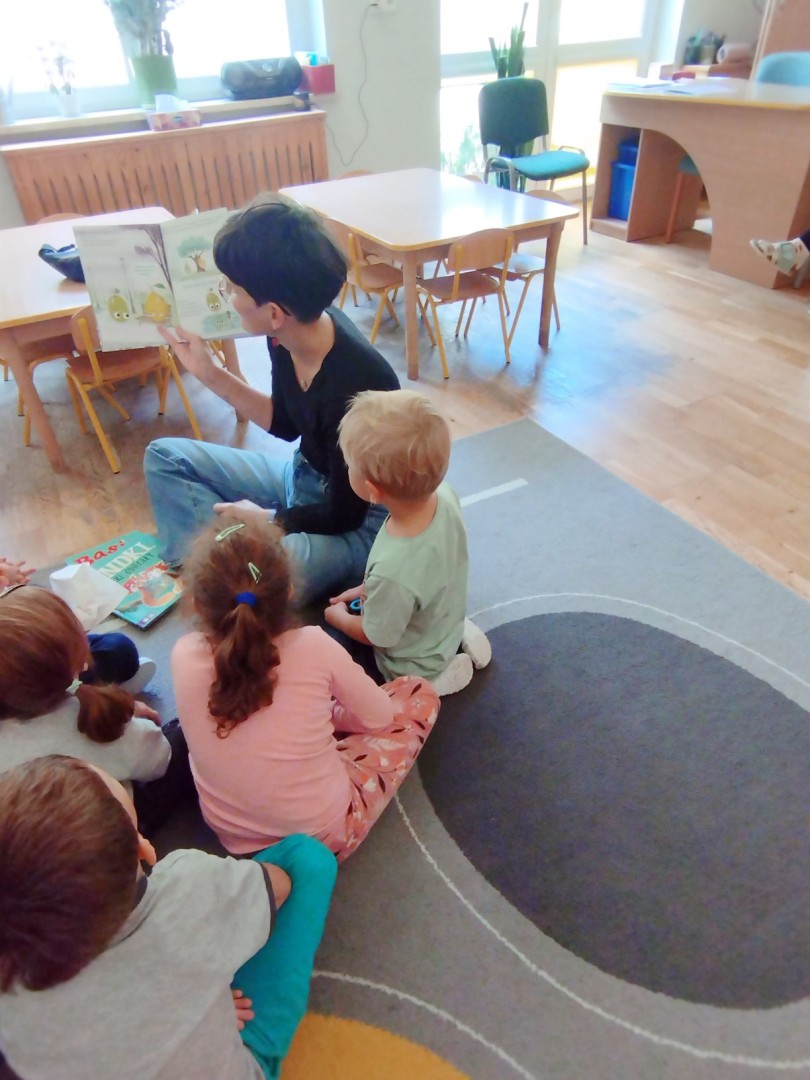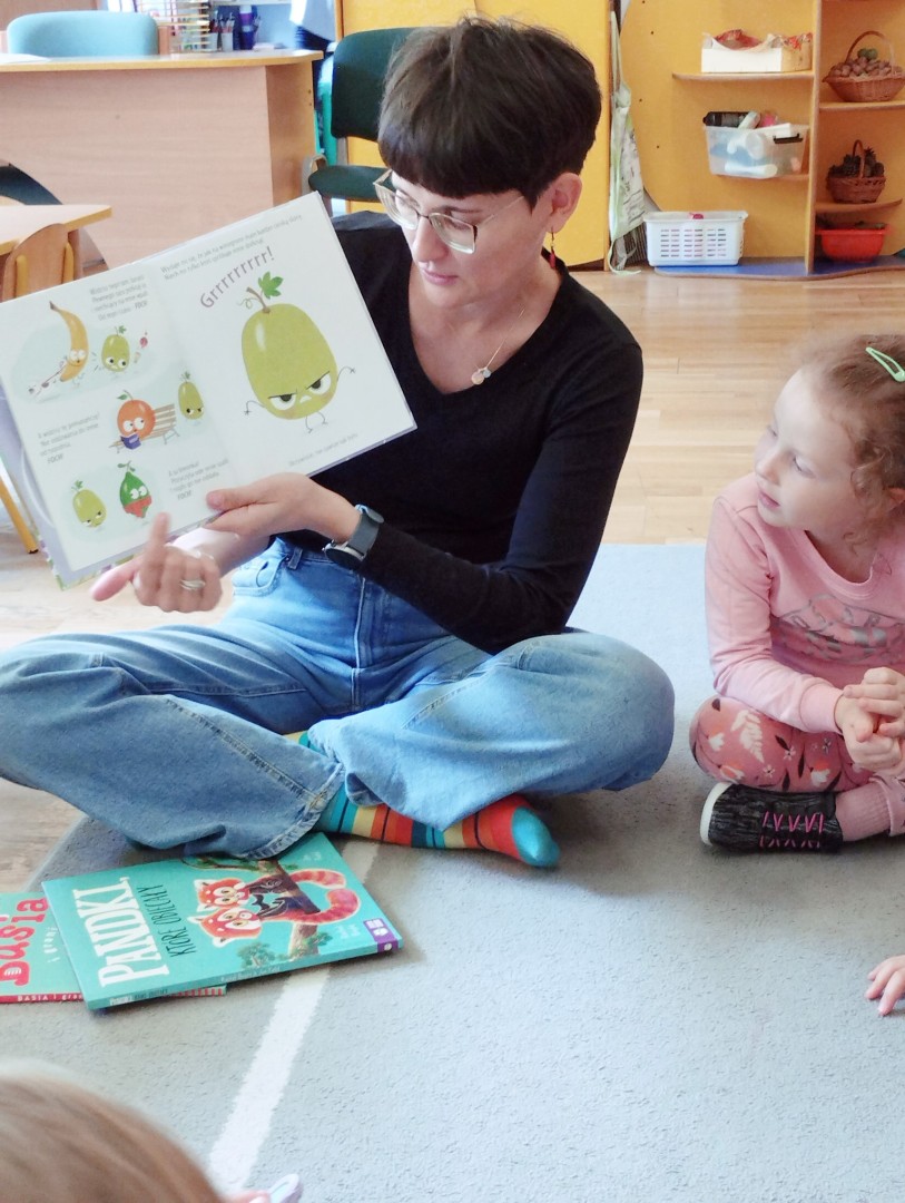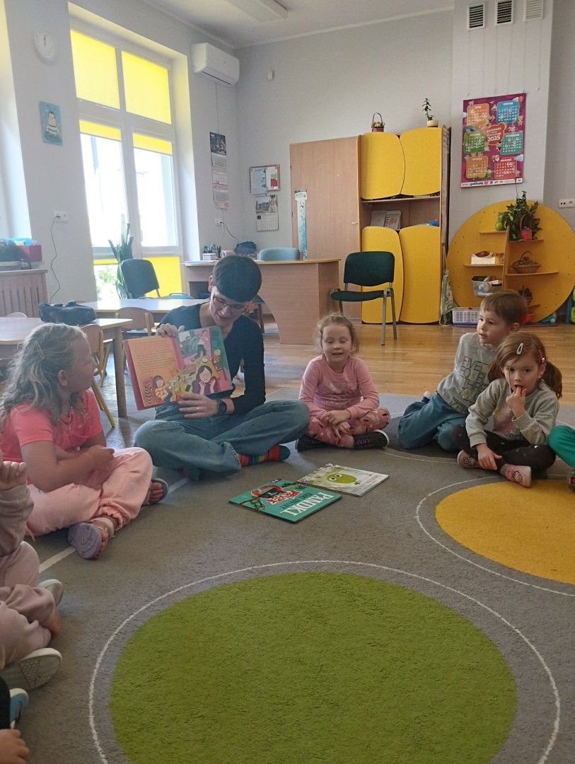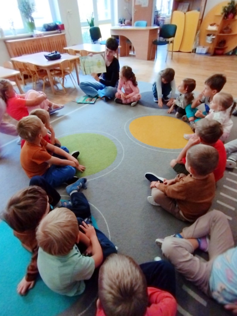 Dnia 1.10.2025rr. naszą grupę odwiedziła Pani Gabriela- mama Tymona. Nasz gość zabrał dzieci w świat przepięknej literatury dziecięcej. Przedszkolaki wysłuchały przygód bohaterów opowiadań pt. „ Basia i granice” oraz” Skwaszone winogrono”. Pełne humoru sytuacje zawarte w opowiadaniach wywołały na twarzach dzieci mnóstwo uśmiechu i radości . Dziękujemy mamie Tymona za rozwijanie w dzieciach wyobraźni i pasji czytelniczych.