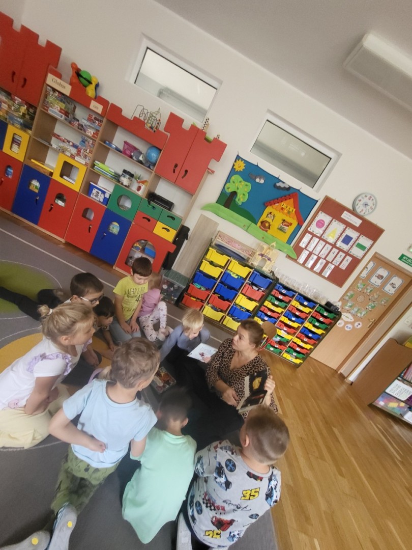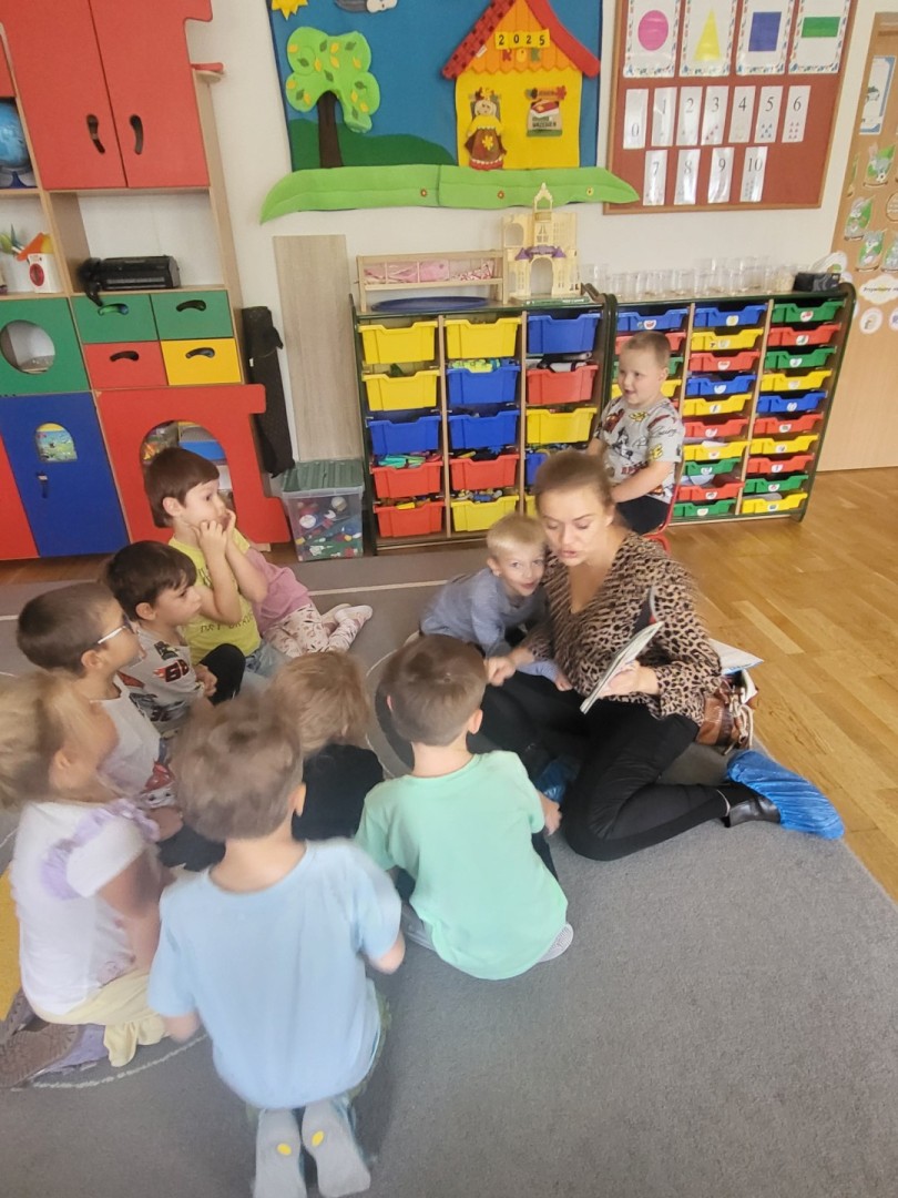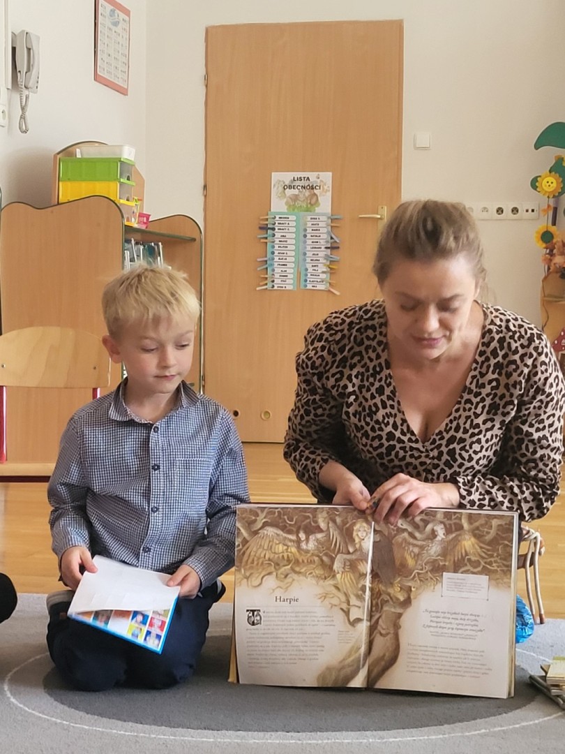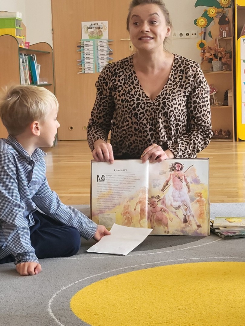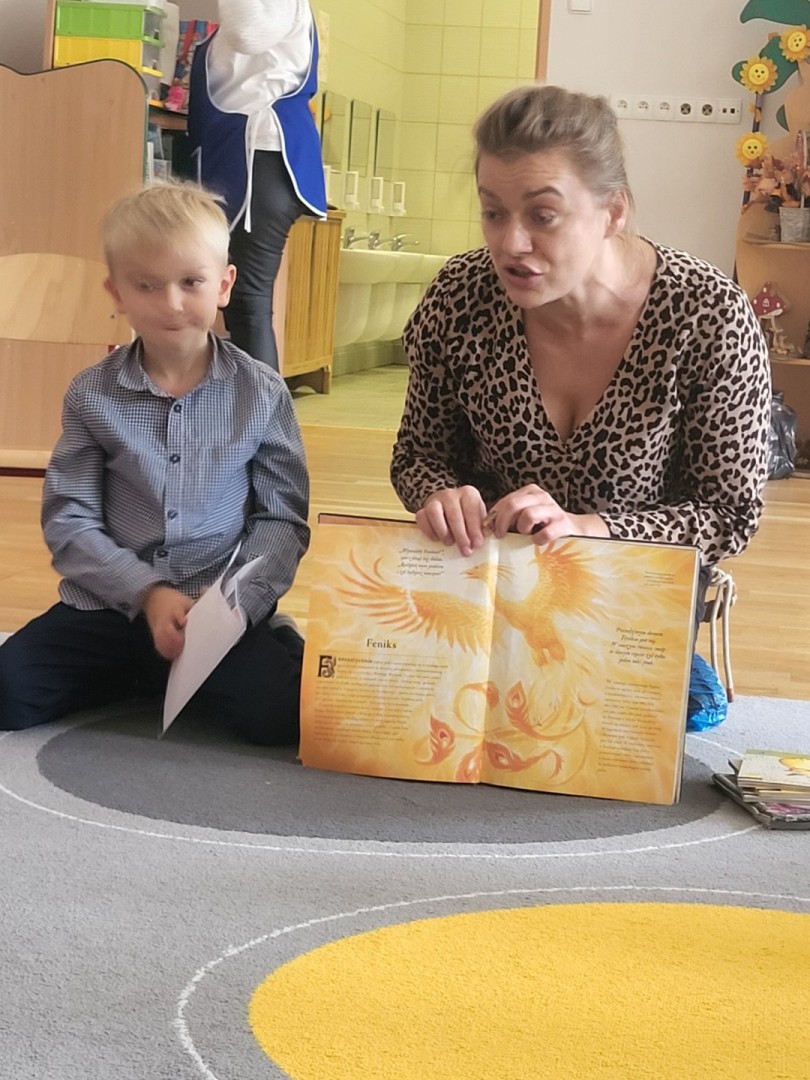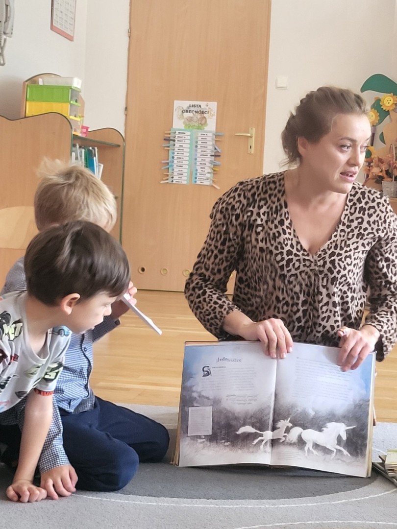 Dnia 01.10.2025r naszą grupę odwiedziła mama Leonarda, która przeczytała dzieciom opowiadania z książeczki “Smoki” oraz “Dobry Pies”, a także pokazała piękne ilustracje w ciekawej  książce  “Magiczne Istoty”. Dzieci z zainteresowaniem wyłuchały historii o bohaterach opowiadań. Dużo emocji wzbudziły i bardzo zaciekawiły dzieci Istoty przedsztawione w książce “Magiczne Istoty”, a był tam m.in.:Centaur, Minotaur, Jednorożec, Feniks czy Syrena.