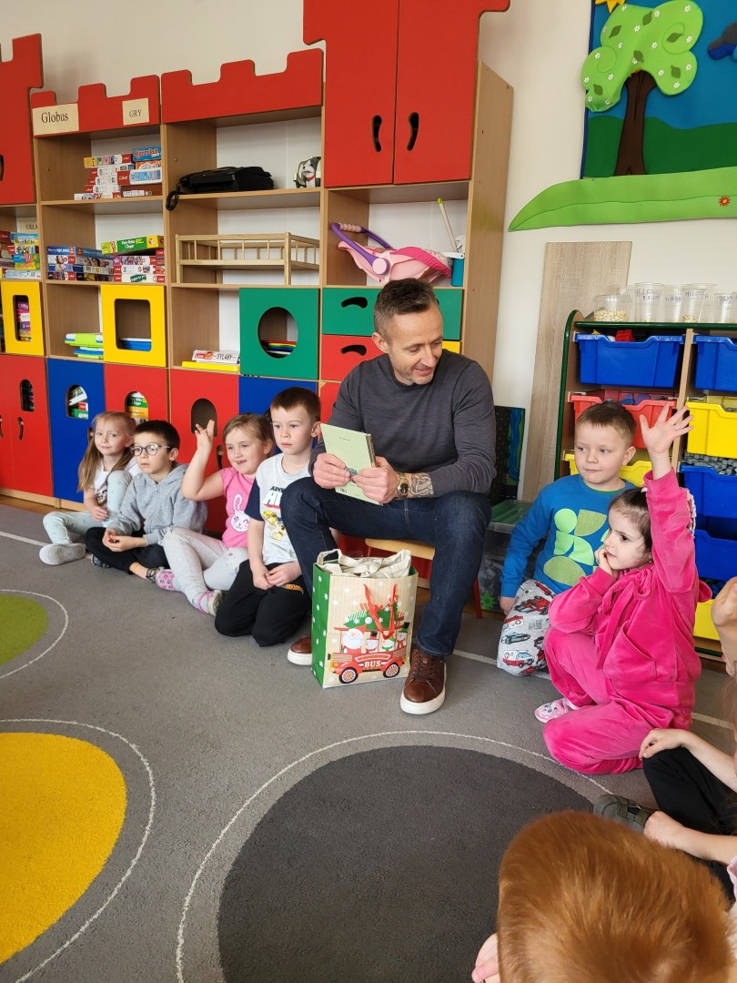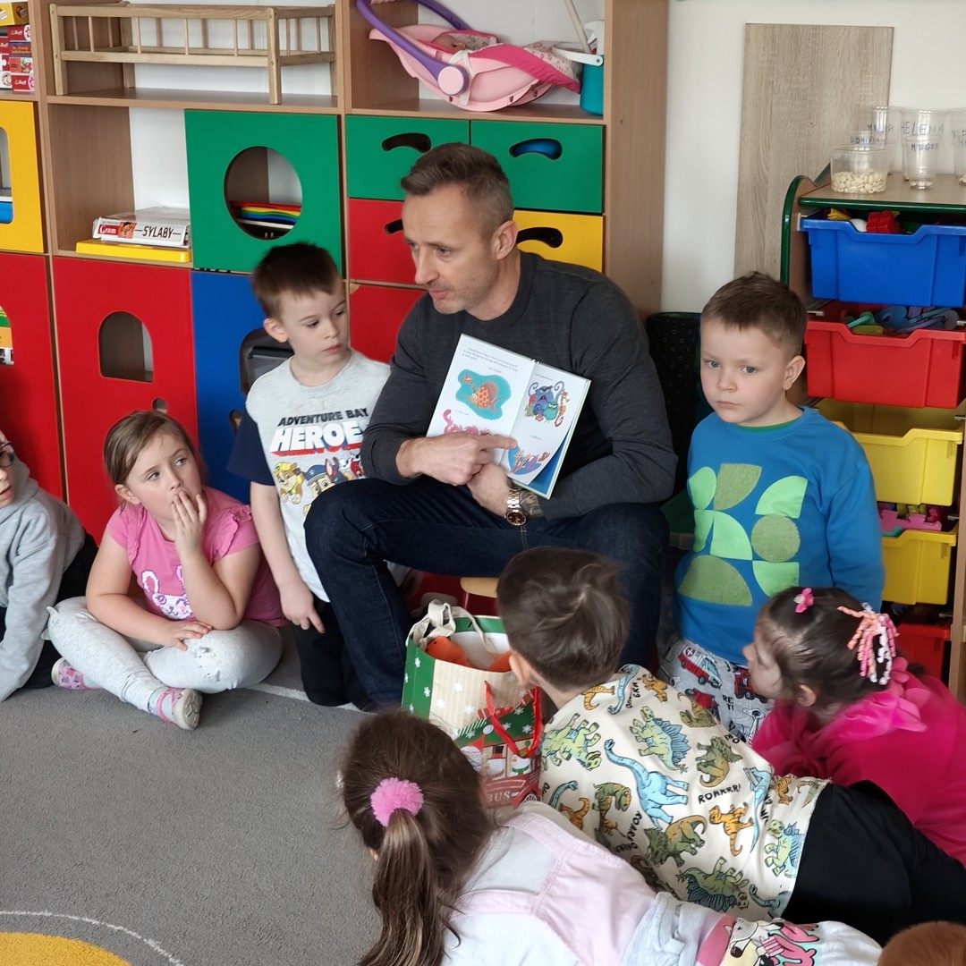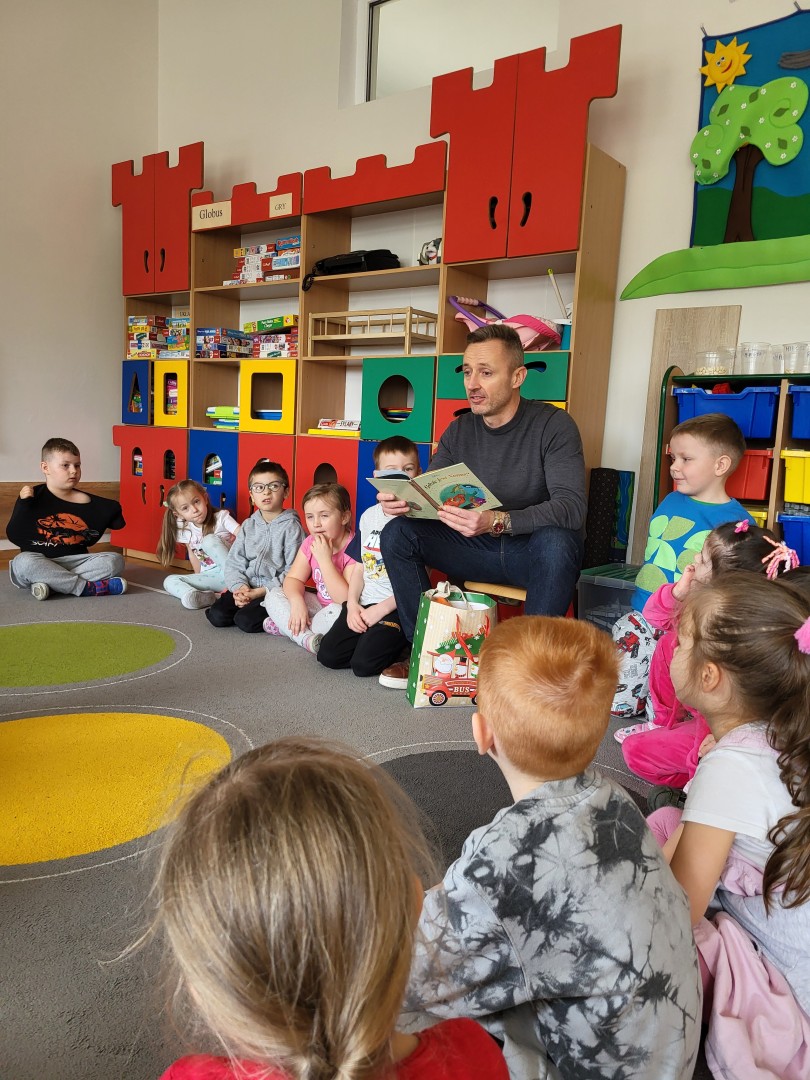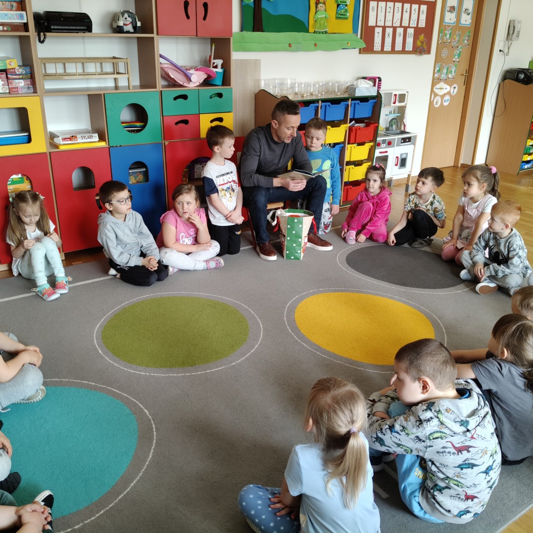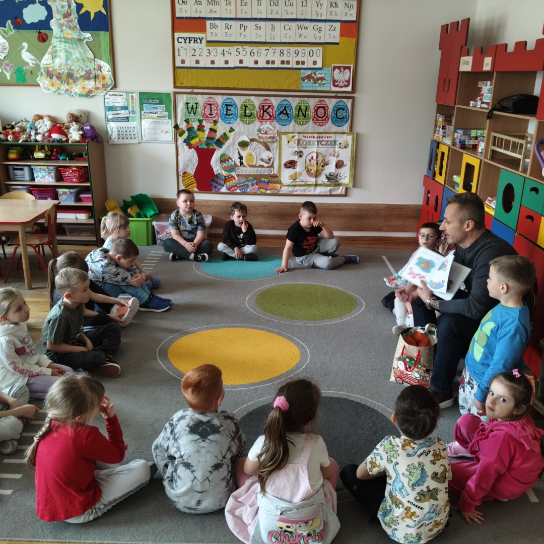 Dnia 31 marca w grupie przedszkolnej “Zajączki” odbyło się spotkanie z tatą Maksa, który odwiedził przedszkole w ramach akcji czytania bajek. Celem wizyty było rozwijanie zainteresowań czytelniczych dzieci, kształtowanie umiejętności słuchania ze zrozumieniem oraz budowanie pozytywnych relacji między przedszkolem a rodziną.