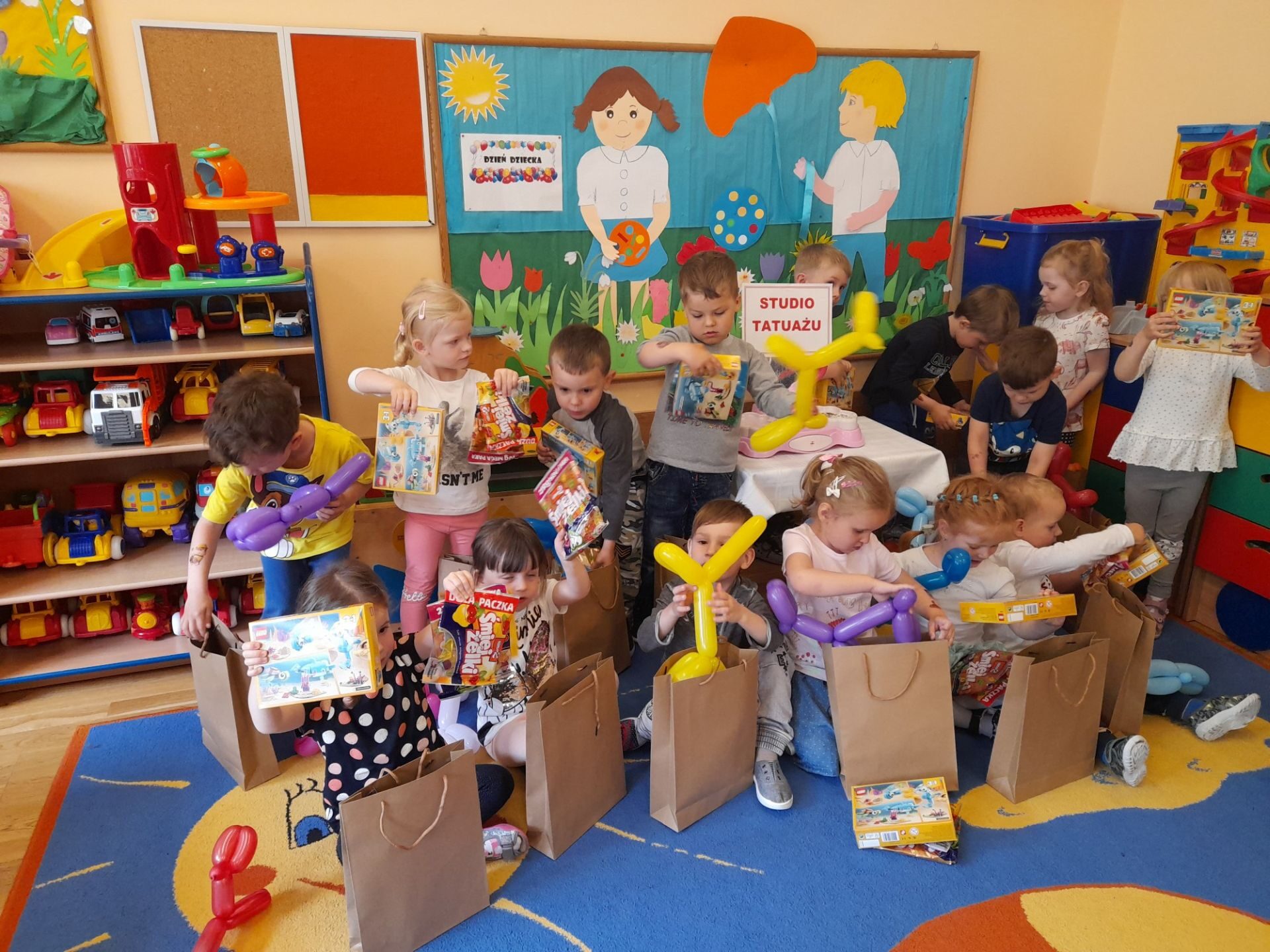 Dzień Dziecka to święto, które uwielbiają wszystkie dzieci, te małe i te duże. To dzień pełen uśmiechów, zabawy, niespodzianek, radości i wielu niezapomnianych wrażeń! W Naszym Przedszkolu tego dnia również nie zabrakło atrakcji. Były tańce, zabawy z wykorzystaniem sprzętu sportowego, tunelu, zabawy z chustą, studio tatuażu, kolorowe balony i wiele innych niespodzianek. Każde dziecko otrzymało wymarzony prezent. Na zakończenie przedszkolaki zjadły zdrowy owocowy poczęstunek. To był wspaniały dzień, co można zobaczyć na zdjęciach poniżej.