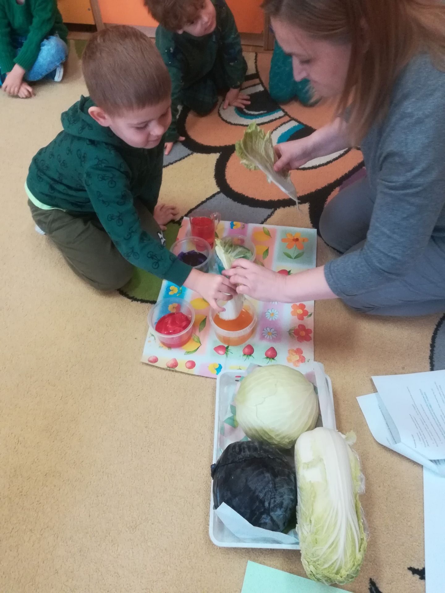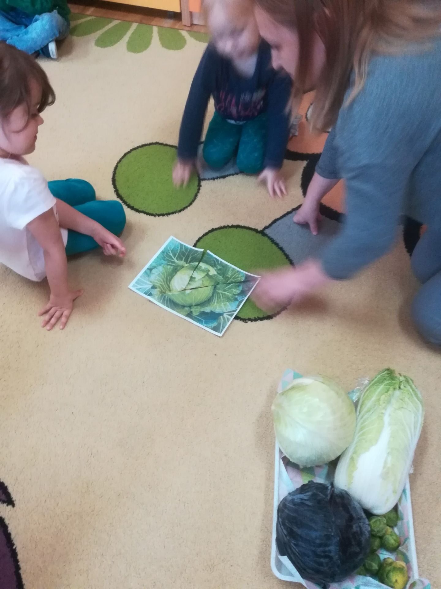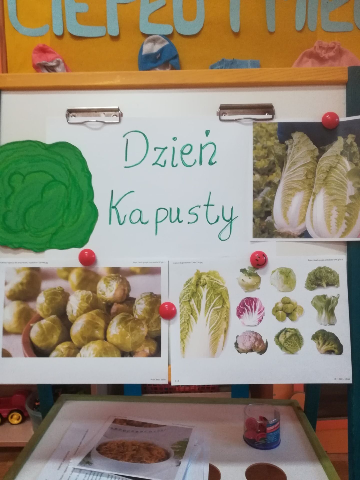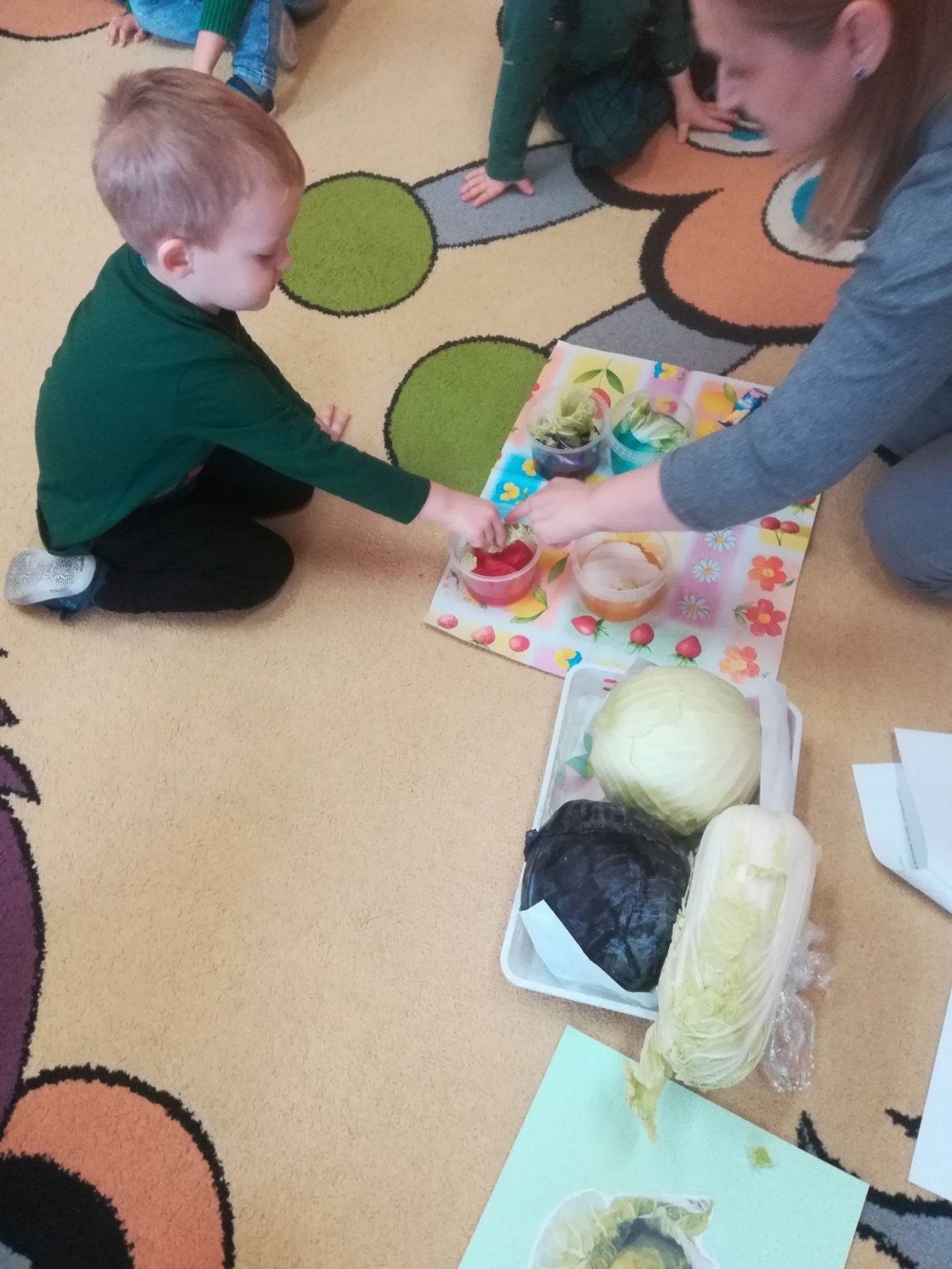 24.11. 2021 w naszym przedszkolu obchodziliśmy „Dzień Kapusty”. W tym dniu wszystkie dzieci ubrały się na zielono. Przedszkolaki z niecierpliwością wyczekiwały tego, co się wydarzy. Nadszedł wreszcie czas na poznanie niespodzianki – kapusty. Dzieci miały okazję zobaczyć i dotknąć kapustę białą, czerwoną, włoską, pekińską a także brukselkę. Następnie przedszkolaki rozpoznawały dania jakie można przygotować z kapusty. Bardzo pomocne okazały się przygotowane ilustracje potraw. Przedszkolaki z wielkim zainteresowaniem obserwowały eksperyment przewodzenia kolorowej wody przez kapustę pekińską „Jak kapusta pije wodę”.  Dzieci poznały wartości odżywcze kapusty, utrwaliły  wiadomości o cechach i walorach zdrowotnych kapusty surowej i kiszonej,  wzięły również udział w zabawach ruchowych przy piosence  „Kapuściana piosenka”, a także bawiły się w „Kiszenie kapusty”, naśladowały czynności, o których  była mowa w rymowance. Kulminacyjnym punktem tego dnia było wykonanie kulinarnego zadania z zachowaniem zasad bezpieczeństwa i higieny podczas przygotowywania posiłków. Jedne grupy przedszkolaków przygotowały samodzielnie sałatkę z kapusty i dodatków, którą ze smakiem zjadły. W innych grupach odbyło się przygotowanie kapusty do kiszenia w słoikach. Dzieci samodzielnie próbowały szatkować kapustę, którą wkładały do słoików, soli, dodawały marchewkę i ubijały. Teraz pozostało czekać na ukiszenie kapusty i obserwację tego co się dzieje w słoikach. Przedszkolaki z niecierpliwością czekają aby z ukiszonej kapusty przygotować surówkę.