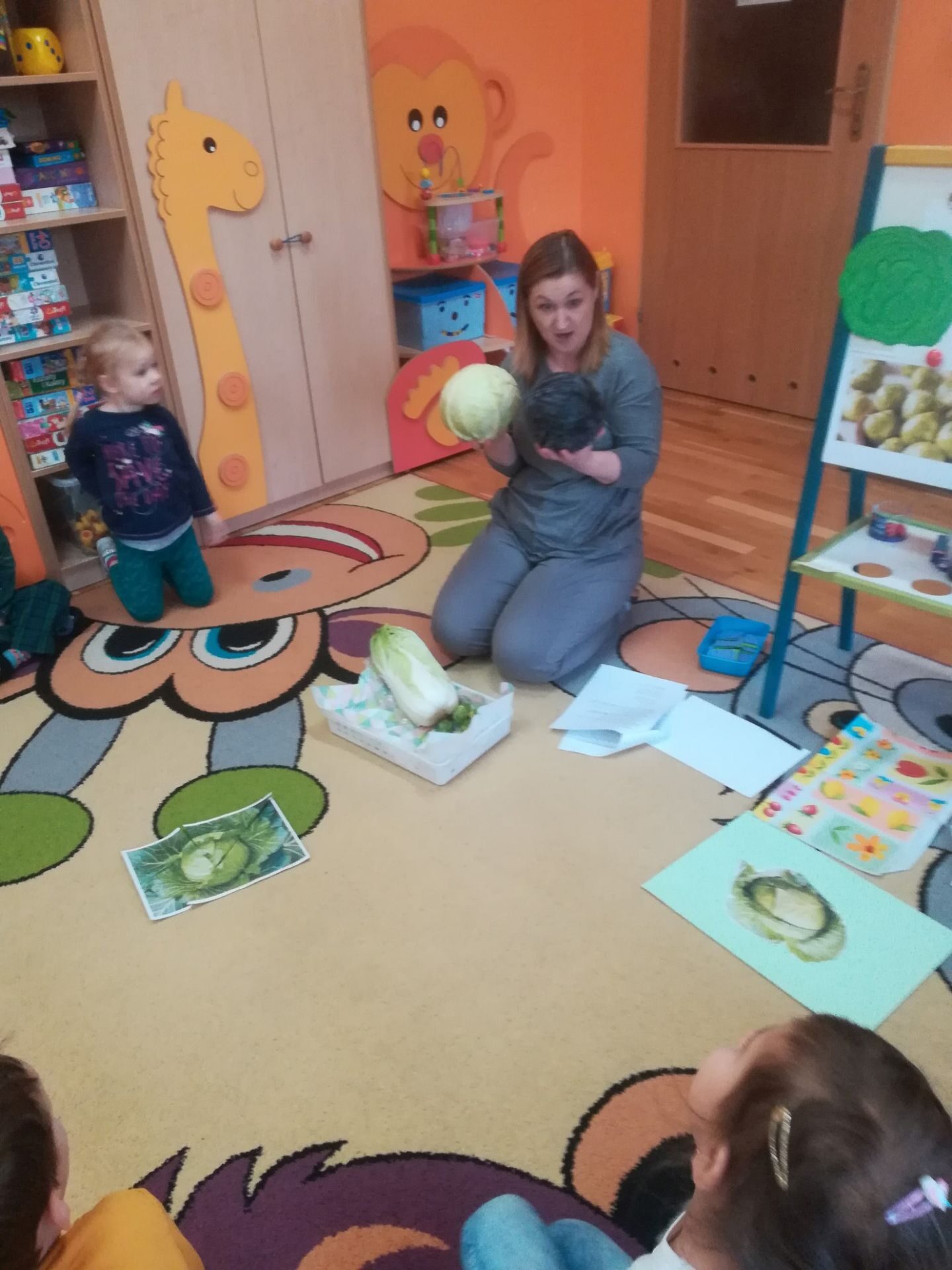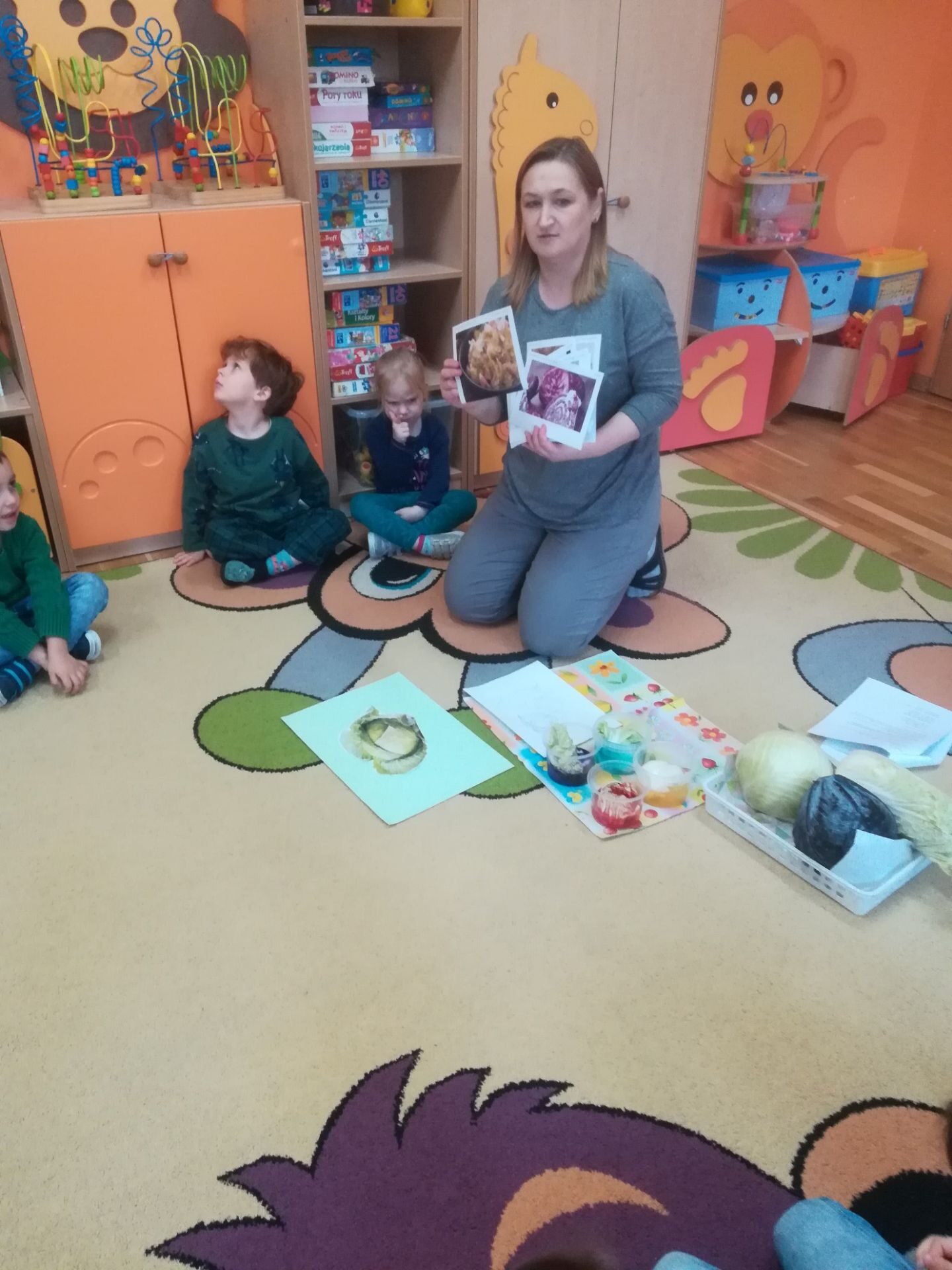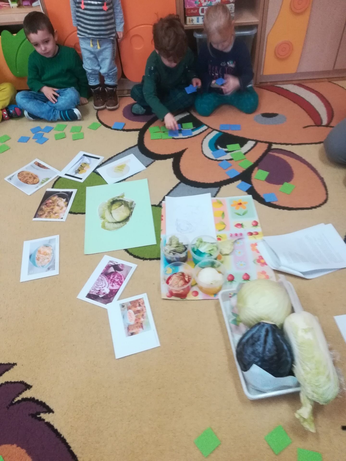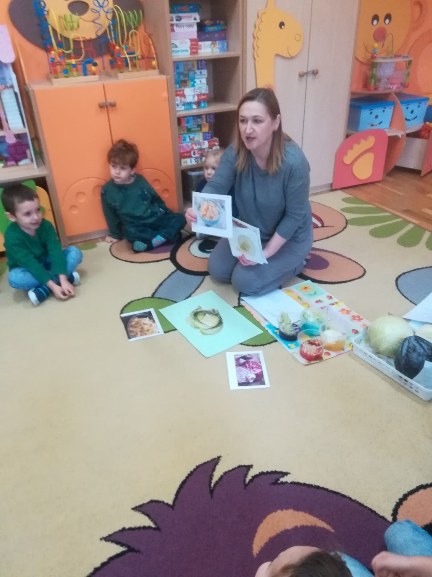 24.11. 2021 w naszym przedszkolu obchodziliśmy „Dzień Kapusty”. W tym dniu wszystkie dzieci ubrały się na zielono. Przedszkolaki z niecierpliwością wyczekiwały tego, co się wydarzy. Nadszedł wreszcie czas na poznanie niespodzianki – kapusty. Dzieci miały okazję zobaczyć i dotknąć kapustę białą, czerwoną, włoską, pekińską a także brukselkę. Następnie przedszkolaki rozpoznawały dania jakie można przygotować z kapusty. Bardzo pomocne okazały się przygotowane ilustracje potraw. Przedszkolaki z wielkim zainteresowaniem obserwowały eksperyment przewodzenia kolorowej wody przez kapustę pekińską „Jak kapusta pije wodę”.  Dzieci poznały wartości odżywcze kapusty, utrwaliły  wiadomości o cechach i walorach zdrowotnych kapusty surowej i kiszonej,  wzięły również udział w zabawach ruchowych przy piosence  „Kapuściana piosenka”, a także bawiły się w „Kiszenie kapusty”, naśladowały czynności, o których  była mowa w rymowance. Kulminacyjnym punktem tego dnia było wykonanie kulinarnego zadania z zachowaniem zasad bezpieczeństwa i higieny podczas przygotowywania posiłków. Jedne grupy przedszkolaków przygotowały samodzielnie sałatkę z kapusty i dodatków, którą ze smakiem zjadły. W innych grupach odbyło się przygotowanie kapusty do kiszenia w słoikach. Dzieci samodzielnie próbowały szatkować kapustę, którą wkładały do słoików, soli, dodawały marchewkę i ubijały. Teraz pozostało czekać na ukiszenie kapusty i obserwację tego co się dzieje w słoikach. Przedszkolaki z niecierpliwością czekają aby z ukiszonej kapusty przygotować surówkę.
