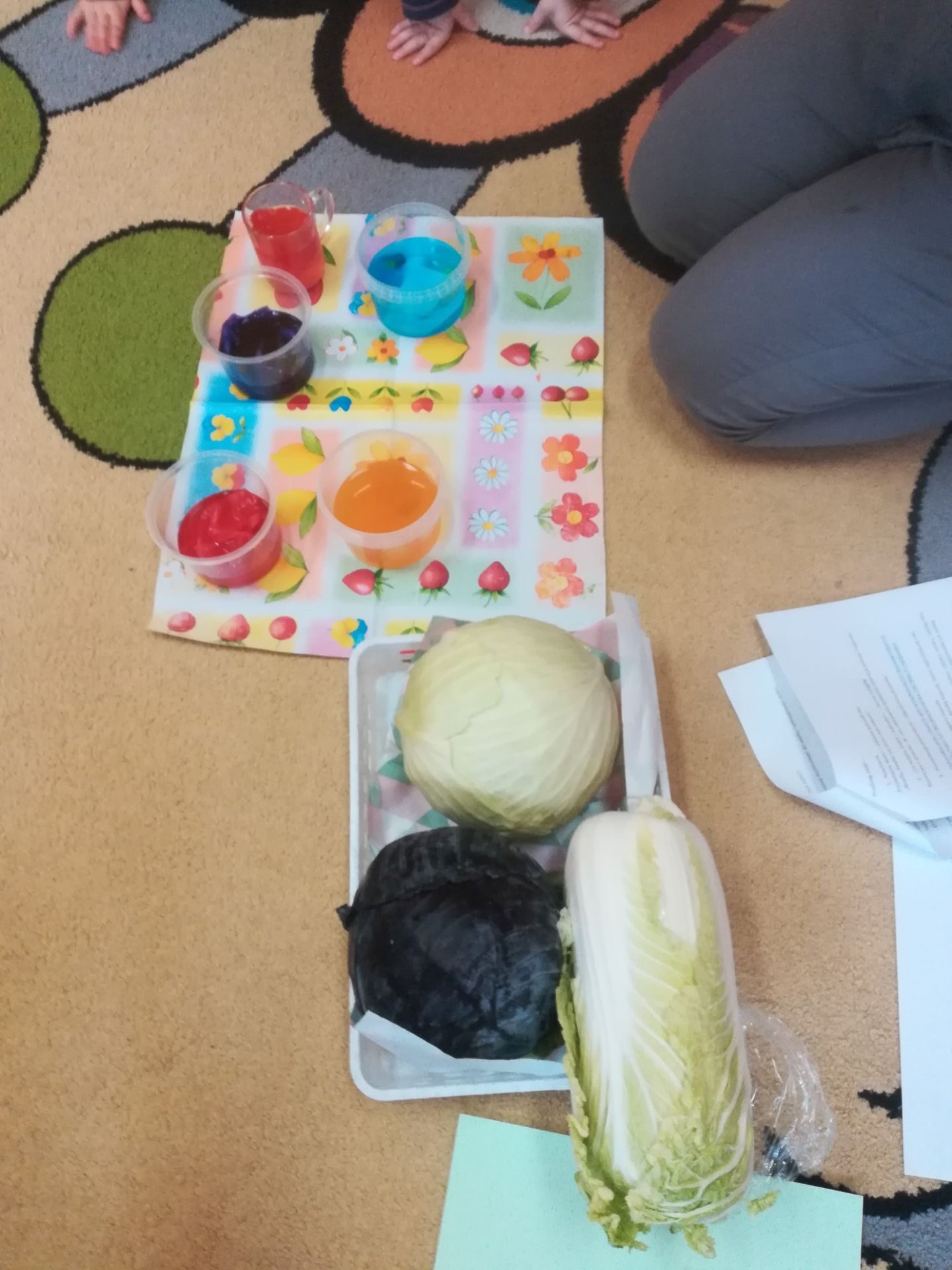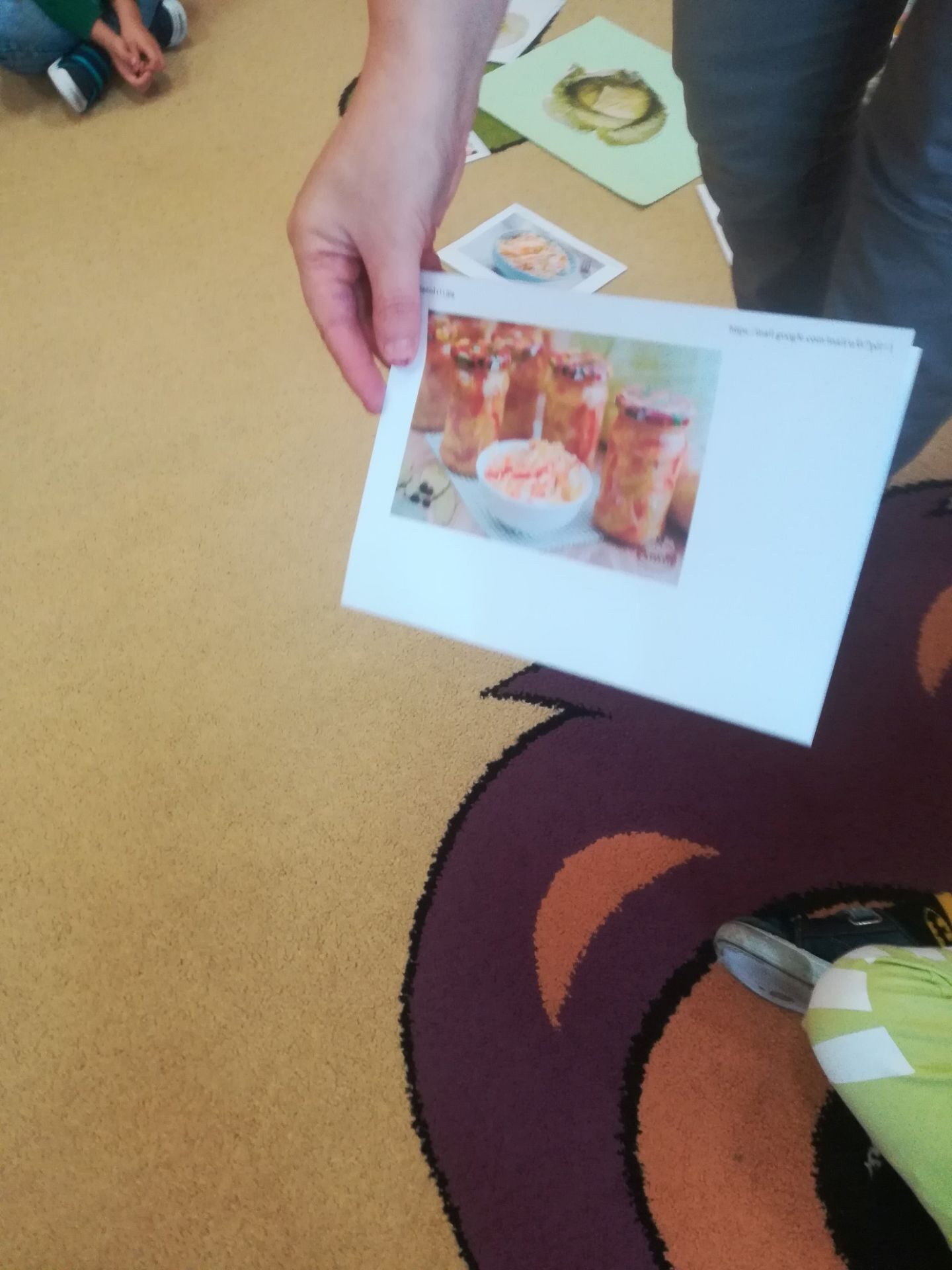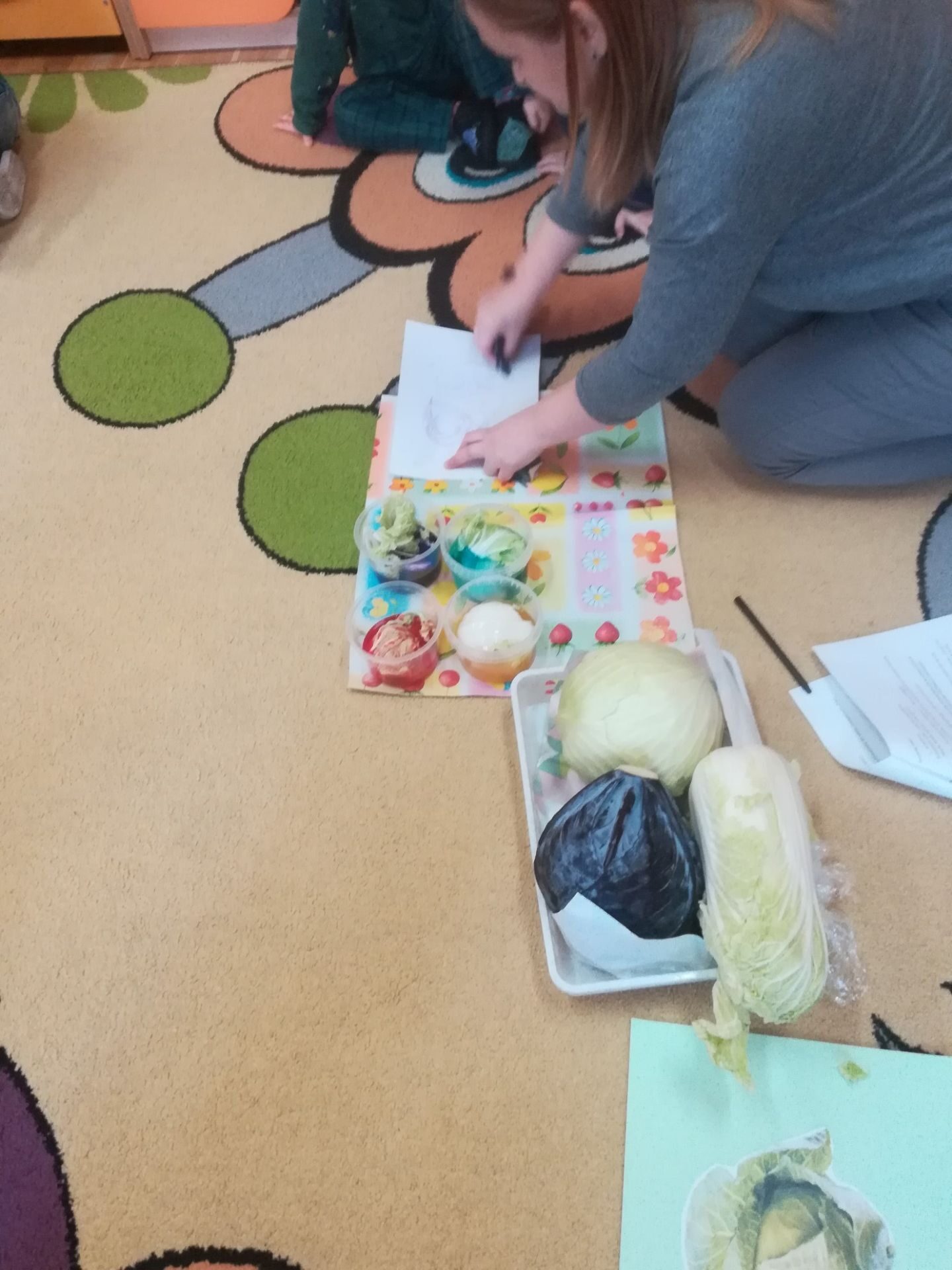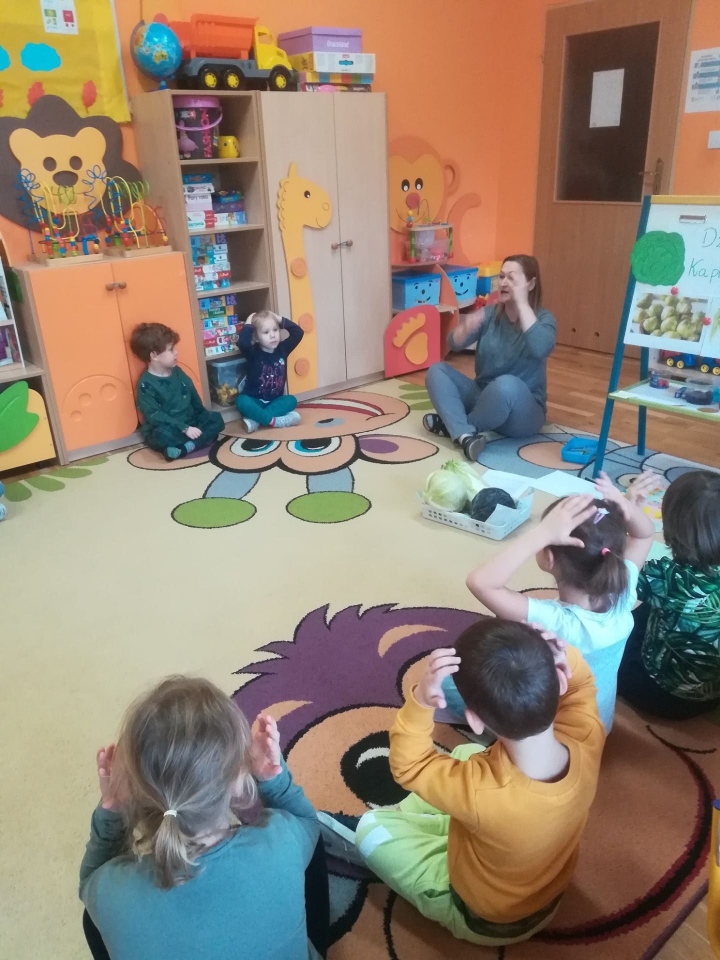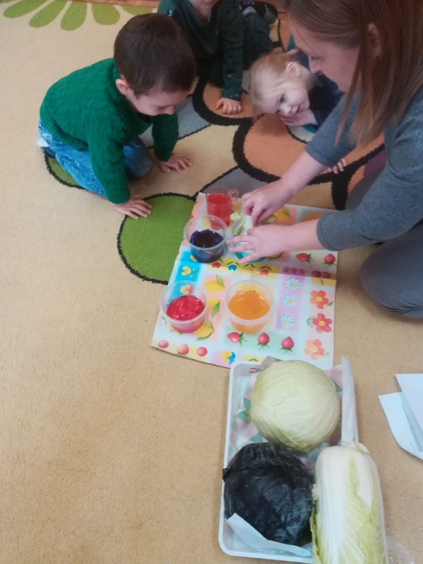 24.11. 2021 w naszym przedszkolu obchodziliśmy „Dzień Kapusty”. W tym dniu wszystkie dzieci ubrały się na zielono. Przedszkolaki z niecierpliwością wyczekiwały tego, co się wydarzy. Nadszedł wreszcie czas na poznanie niespodzianki – kapusty. Dzieci miały okazję zobaczyć i dotknąć kapustę białą, czerwoną, włoską, pekińską a także brukselkę. Następnie przedszkolaki rozpoznawały dania jakie można przygotować z kapusty. Bardzo pomocne okazały się przygotowane ilustracje potraw. Przedszkolaki z wielkim zainteresowaniem obserwowały eksperyment przewodzenia kolorowej wody przez kapustę pekińską „Jak kapusta pije wodę”.  Dzieci poznały wartości odżywcze kapusty, utrwaliły  wiadomości o cechach i walorach zdrowotnych kapusty surowej i kiszonej,  wzięły również udział w zabawach ruchowych przy piosence  „Kapuściana piosenka”, a także bawiły się w „Kiszenie kapusty”, naśladowały czynności, o których  była mowa w rymowance. Kulminacyjnym punktem tego dnia było wykonanie kulinarnego zadania z zachowaniem zasad bezpieczeństwa i higieny podczas przygotowywania posiłków. Jedne grupy przedszkolaków przygotowały samodzielnie sałatkę z kapusty i dodatków, którą ze smakiem zjadły. W innych grupach odbyło się przygotowanie kapusty do kiszenia w słoikach. Dzieci samodzielnie próbowały szatkować kapustę, którą wkładały do słoików, soli, dodawały marchewkę i ubijały. Teraz pozostało czekać na ukiszenie kapusty i obserwację tego co się dzieje w słoikach. Przedszkolaki z niecierpliwością czekają aby z ukiszonej kapusty przygotować surówkę.