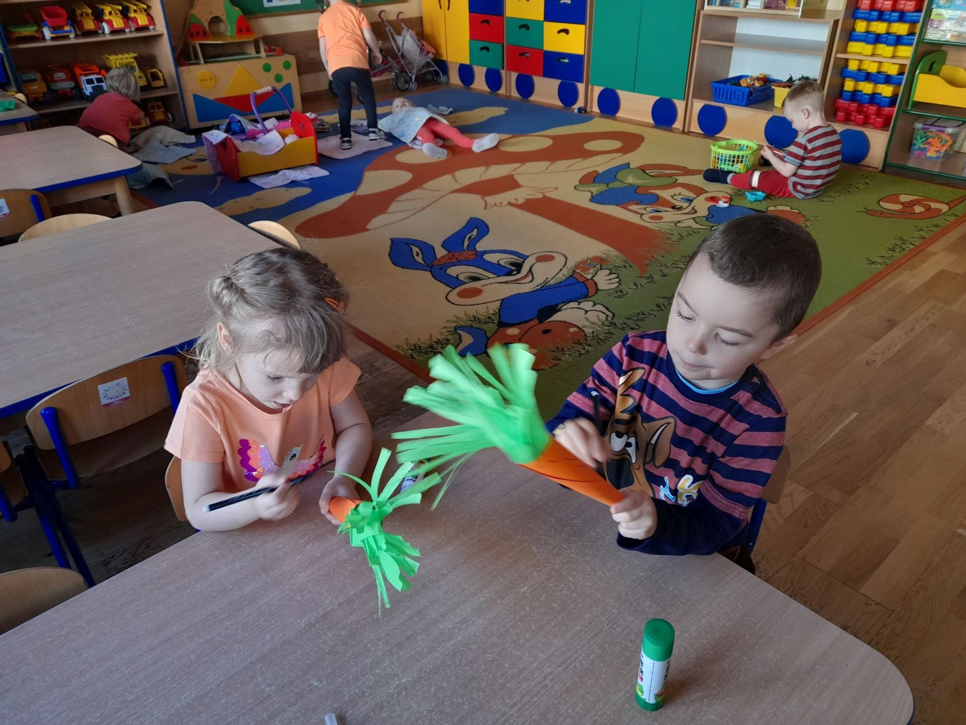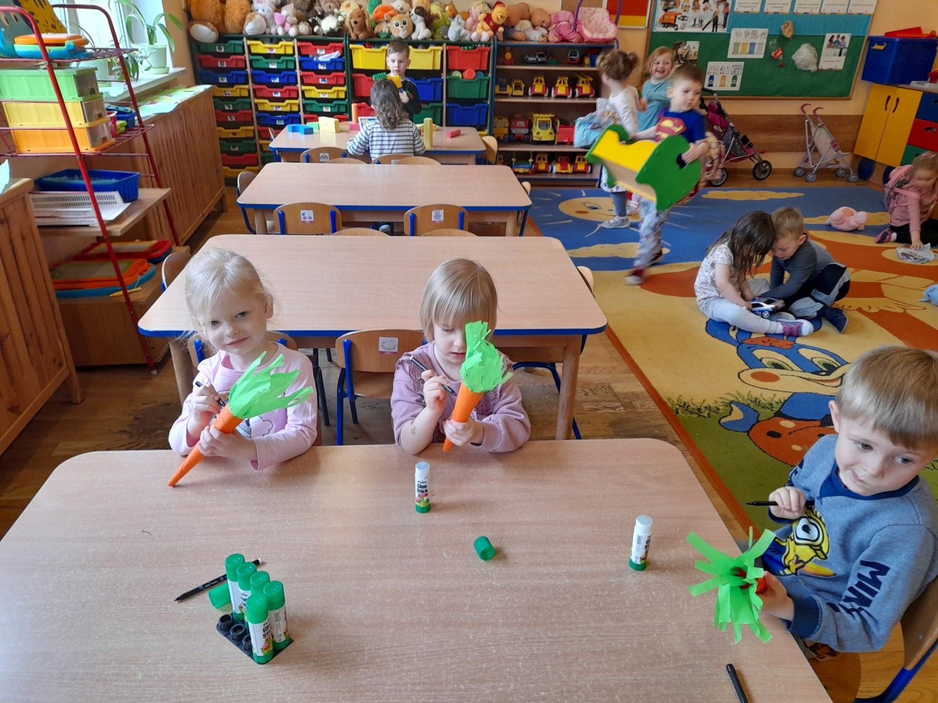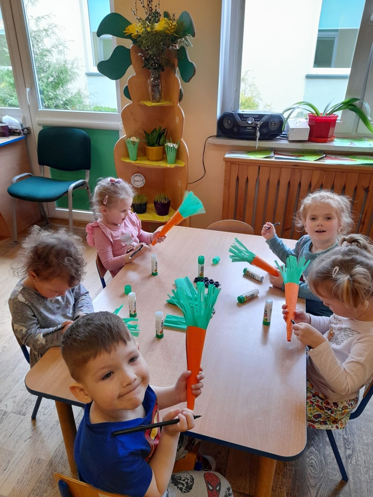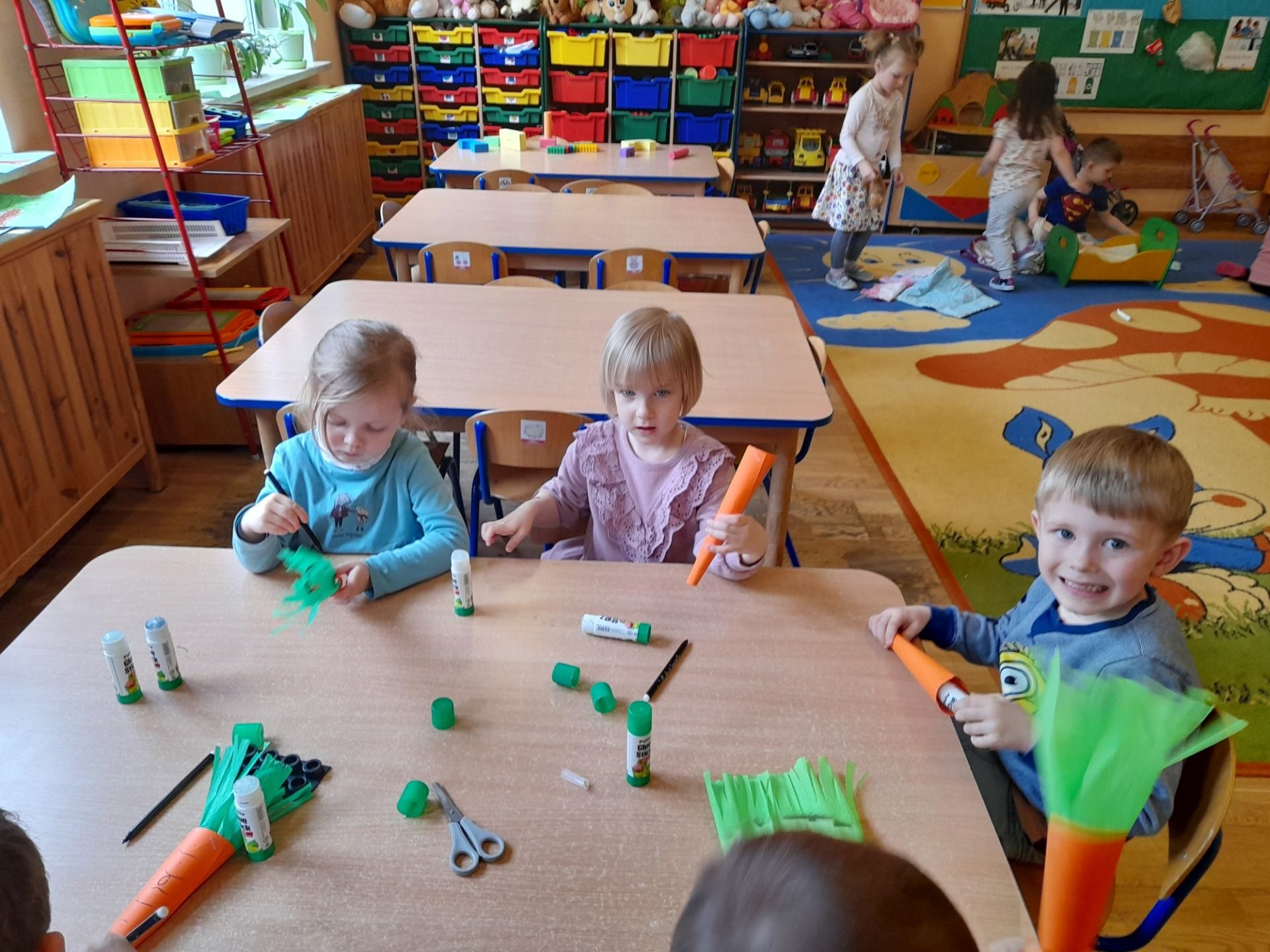 Dzień 27.04.2022r w naszym przedszkolu był dniem wyjątkowym- pomarańczowym, marchewkowym, zdrowym i witaminowym. W tym dniu dzieci przyszły do przedszkola ubrane na pomarańczowo. Realizując program edukacji żywieniowej przedszkolaki poznały zalety i walory marchewki. Dzieci mogły się dowiedzieć wiele ciekawych rzeczy: jak bardzo jest zdrowa , zawiera wiele cennych witamin i składników odżywczych, korzystnie wpływa na skórę, włosy oraz wzrok.  Warto go pić, bo to witaminowa „bomba”. Przedszkolaki dowiedziały się, że z marchewki można zrobić też dżem, sok i upiec marchewkowe ciasto. Ten „bardzo zdrowy dzień pomarańczowy” wypełniony był zabawami przy piosenkach o marchewce, pracami plastycznymi oczywiście o marchewce, chrupaniem surowych marchewek, próbowaniem marchewkowego soku a także degustacją surówki z marchewki.