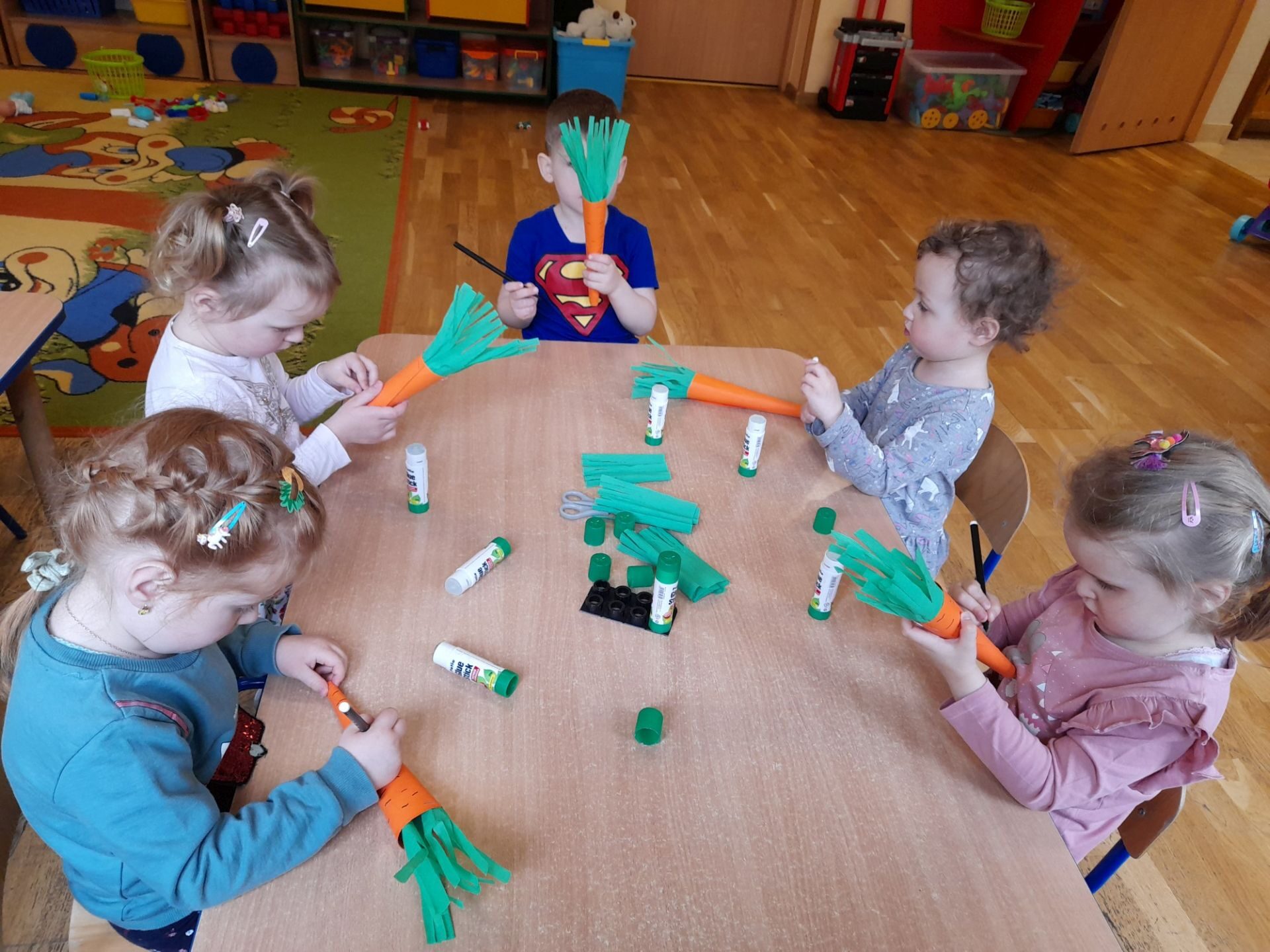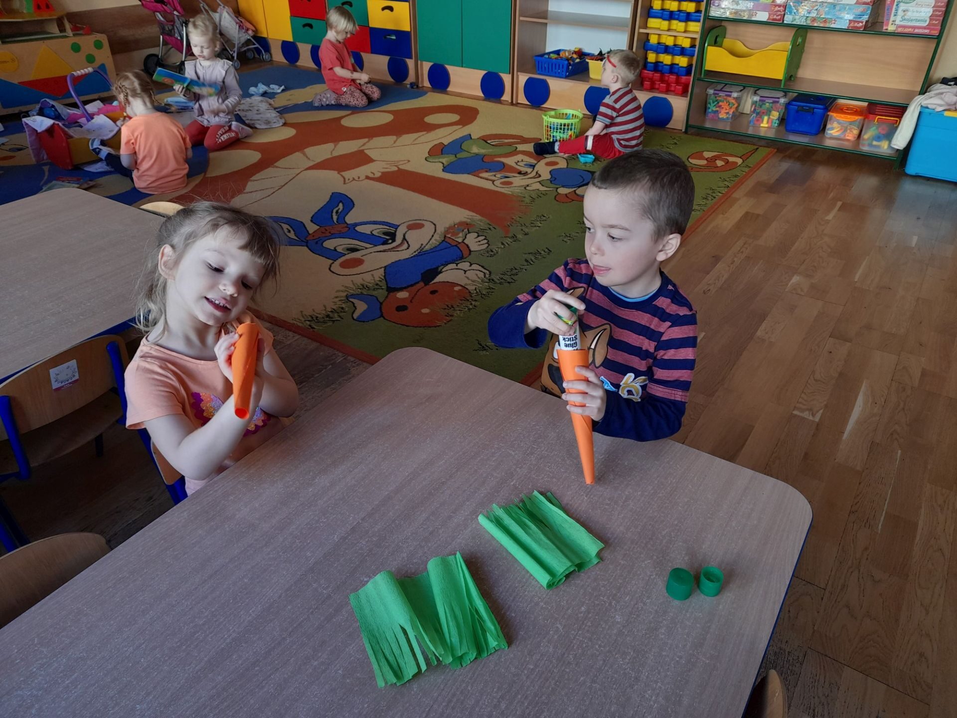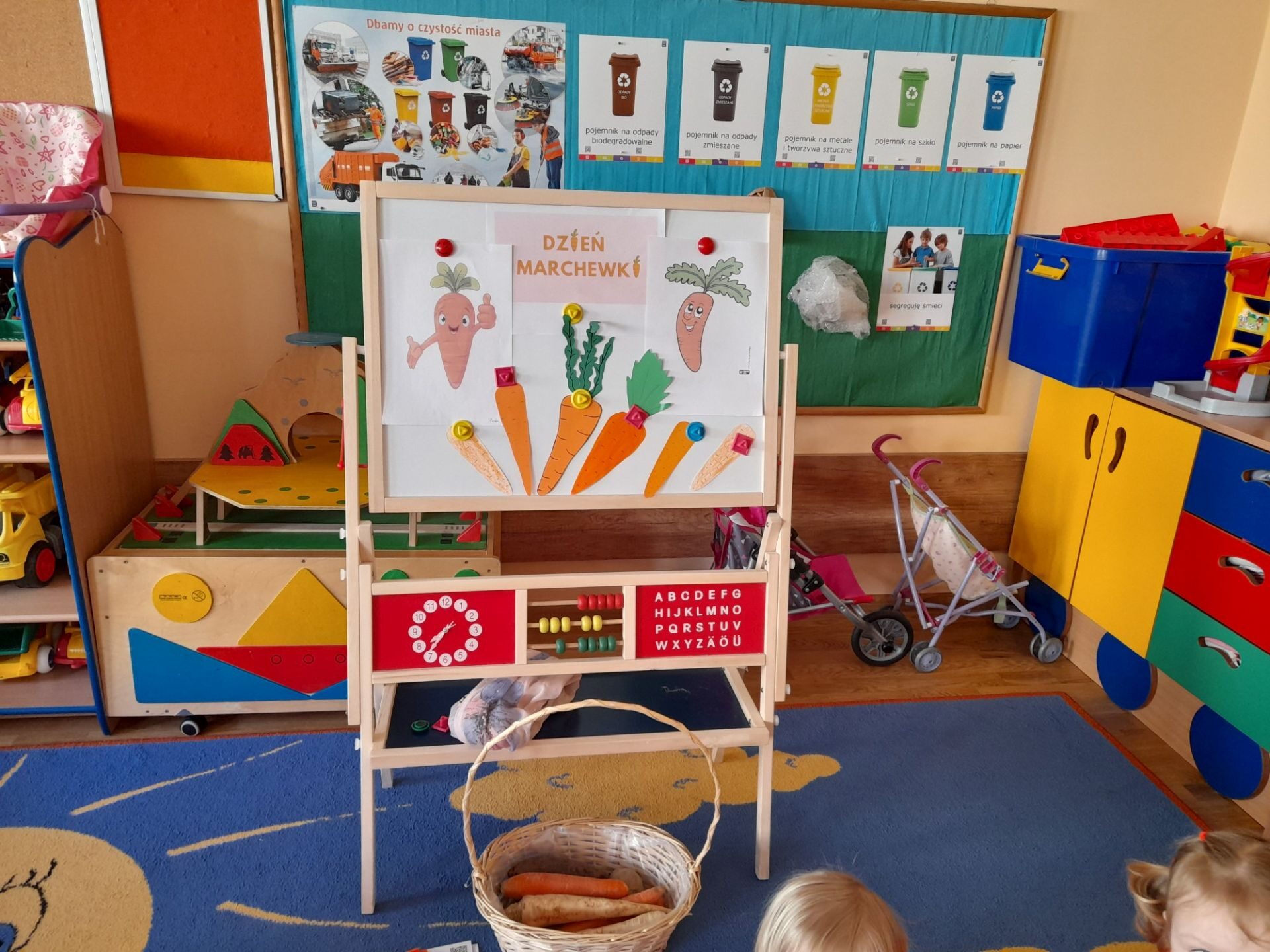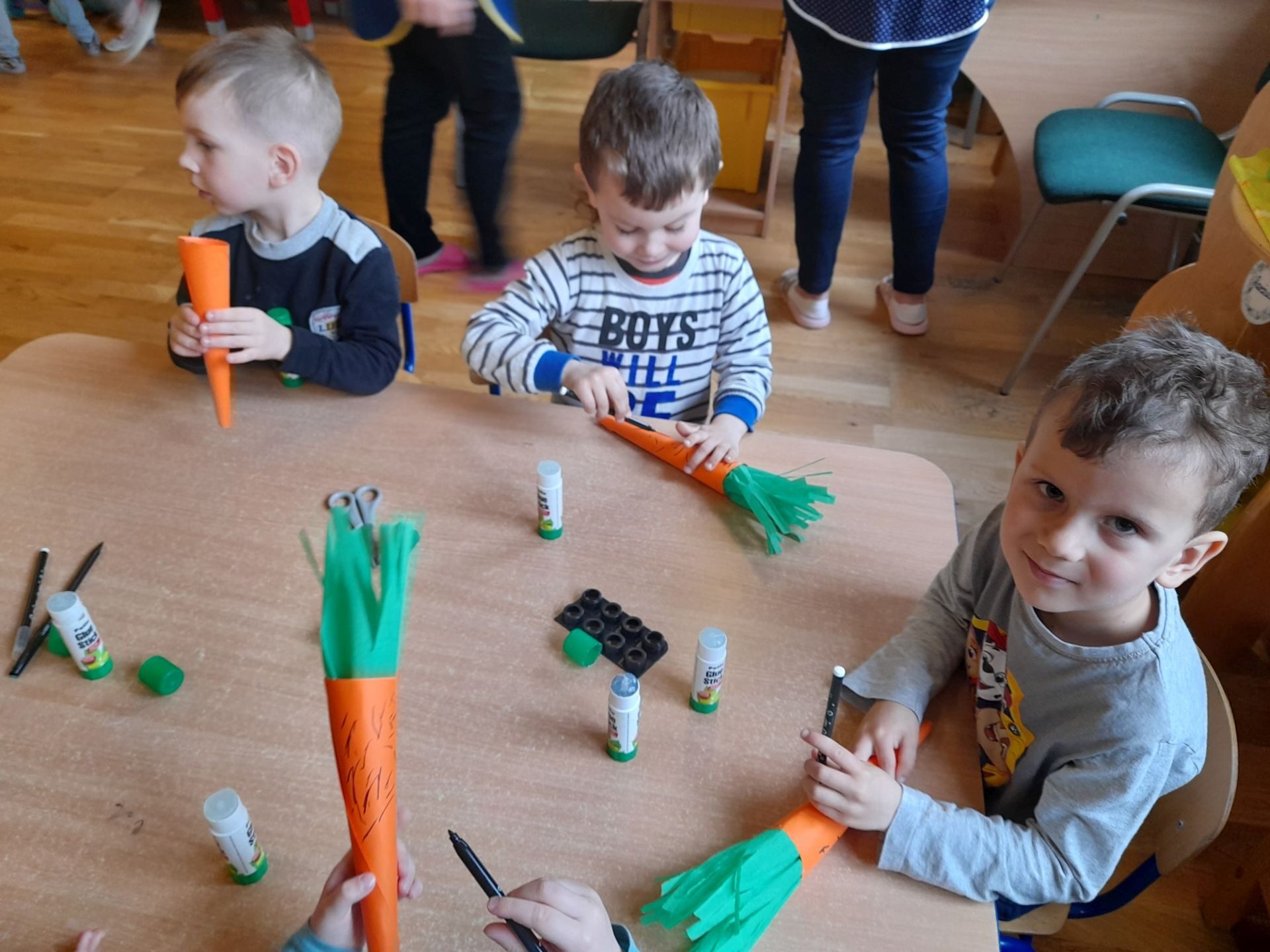 Dzień 27.04.2022r w naszym przedszkolu był dniem wyjątkowym- pomarańczowym, marchewkowym, zdrowym i witaminowym. W tym dniu dzieci przyszły do przedszkola ubrane na pomarańczowo. Realizując program edukacji żywieniowej przedszkolaki poznały zalety i walory marchewki. Dzieci mogły się dowiedzieć wiele ciekawych rzeczy: jak bardzo jest zdrowa , zawiera wiele cennych witamin i składników odżywczych, korzystnie wpływa na skórę, włosy oraz wzrok.  Warto go pić, bo to witaminowa „bomba”. Przedszkolaki dowiedziały się, że z marchewki można zrobić też dżem, sok i upiec marchewkowe ciasto. Ten „bardzo zdrowy dzień pomarańczowy” wypełniony był zabawami przy piosenkach o marchewce, pracami plastycznymi oczywiście o marchewce, chrupaniem surowych marchewek, próbowaniem marchewkowego soku a także degustacją surówki z marchewki.