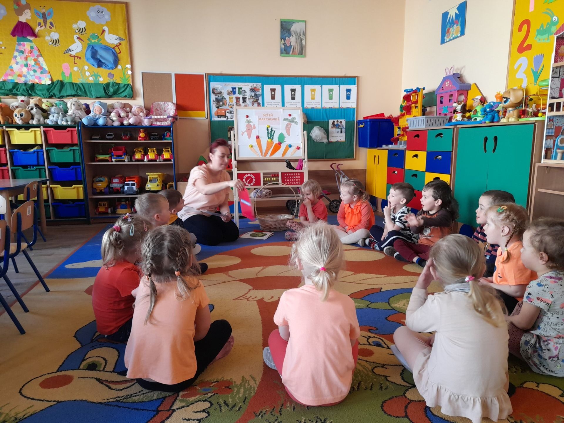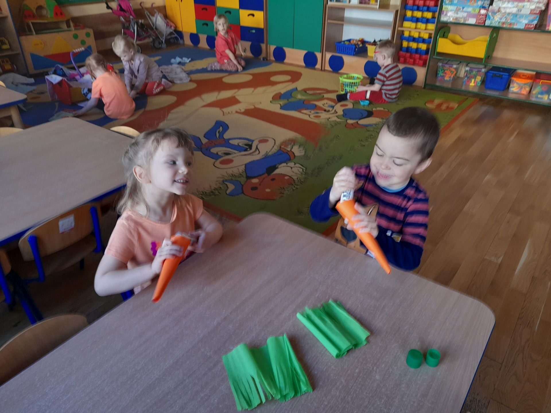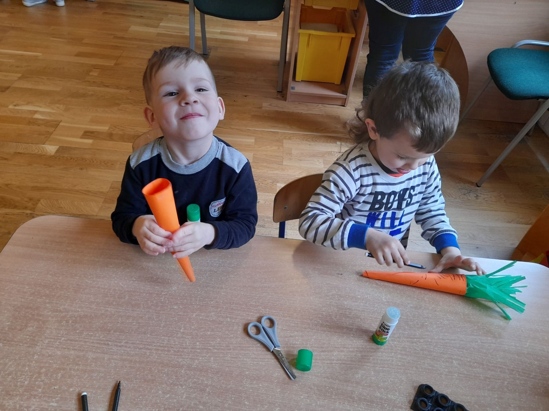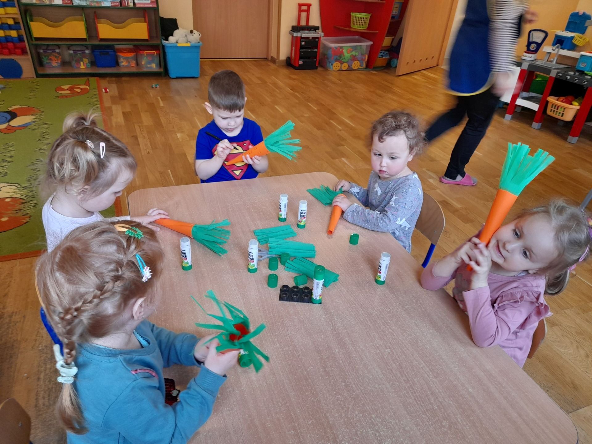 Dzień 27.04.2022r w naszym przedszkolu był dniem wyjątkowym- pomarańczowym, marchewkowym, zdrowym i witaminowym. W tym dniu dzieci przyszły do przedszkola ubrane na pomarańczowo. Realizując program edukacji żywieniowej przedszkolaki poznały zalety i walory marchewki. Dzieci mogły się dowiedzieć wiele ciekawych rzeczy: jak bardzo jest zdrowa , zawiera wiele cennych witamin i składników odżywczych, korzystnie wpływa na skórę, włosy oraz wzrok.  Warto go pić, bo to witaminowa „bomba”. Przedszkolaki dowiedziały się, że z marchewki można zrobić też dżem, sok i upiec marchewkowe ciasto. Ten „bardzo zdrowy dzień pomarańczowy” wypełniony był zabawami przy piosenkach o marchewce, pracami plastycznymi oczywiście o marchewce, chrupaniem surowych marchewek, próbowaniem marchewkowego soku a także degustacją surówki z marchewki.