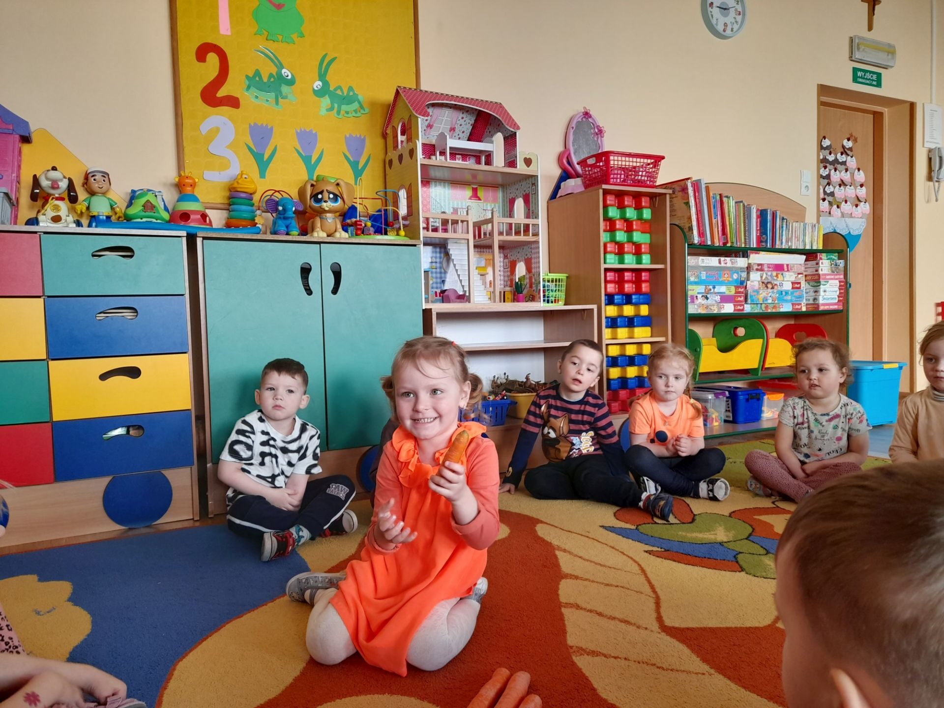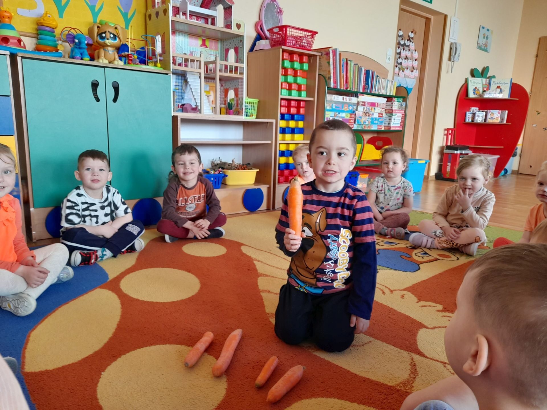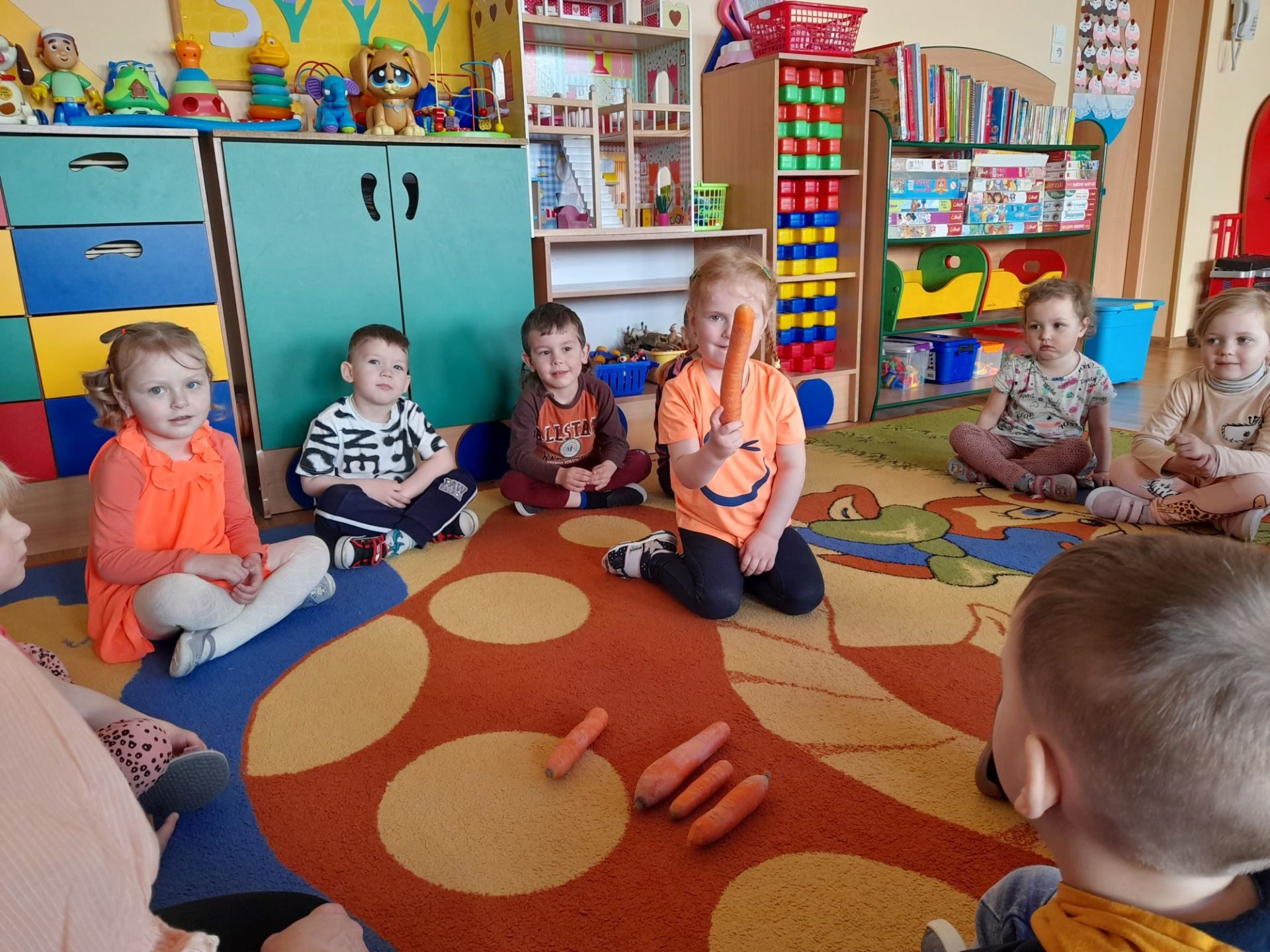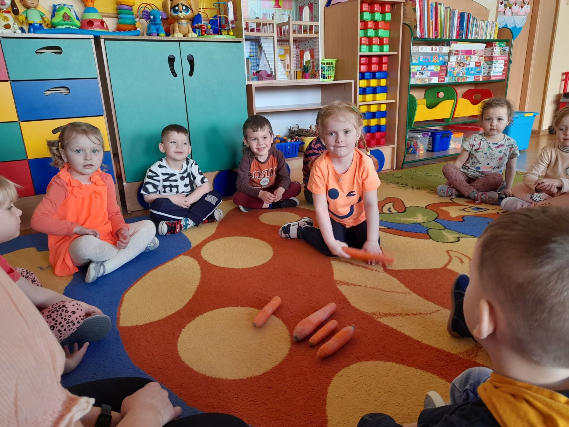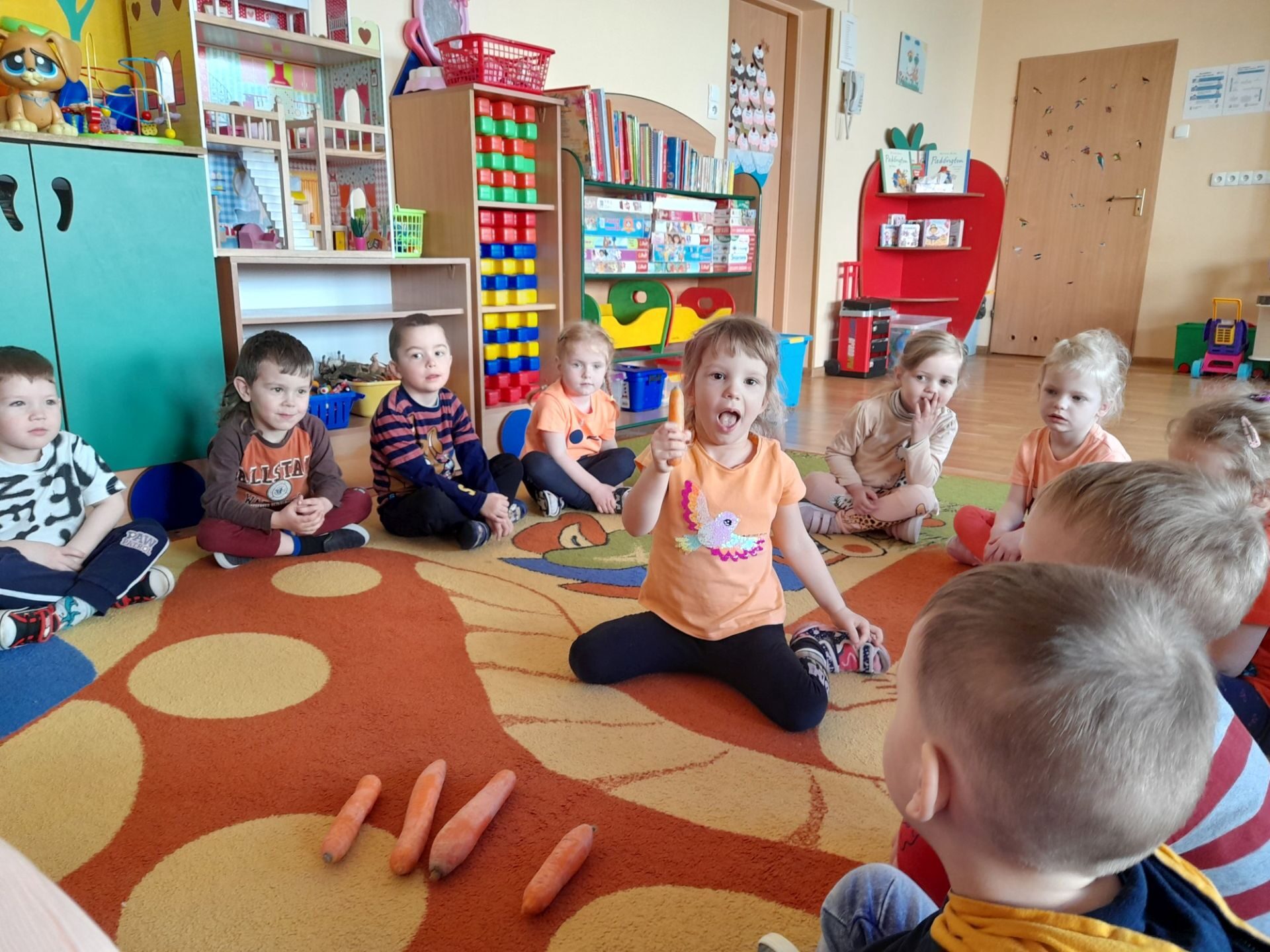 Dzień 27.04.2022r w naszym przedszkolu był dniem wyjątkowym- pomarańczowym, marchewkowym, zdrowym i witaminowym. W tym dniu dzieci przyszły do przedszkola ubrane na pomarańczowo. Realizując program edukacji żywieniowej przedszkolaki poznały zalety i walory marchewki. Dzieci mogły się dowiedzieć wiele ciekawych rzeczy: jak bardzo jest zdrowa , zawiera wiele cennych witamin i składników odżywczych, korzystnie wpływa na skórę, włosy oraz wzrok. Warto go pić, bo to witaminowa „bomba”. Przedszkolaki dowiedziały się, że z marchewki można zrobić też dżem, sok i upiec marchewkowe ciasto. Ten „bardzo zdrowy dzień pomarańczowy” wypełniony był zabawami przy piosenkach o marchewce, pracami plastycznymi oczywiście o marchewce, chrupaniem surowych marchewek, próbowaniem marchewkowego soku a także degustacją surówki z marchewki.