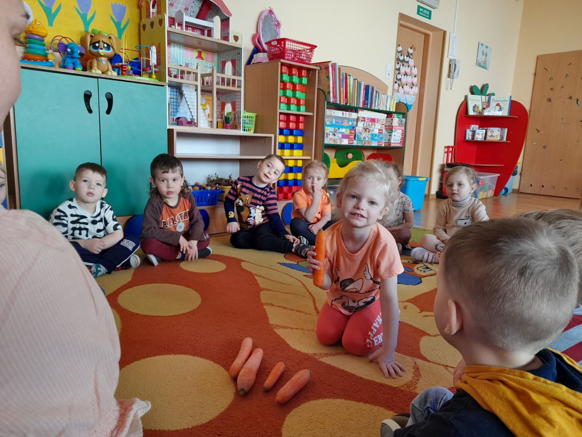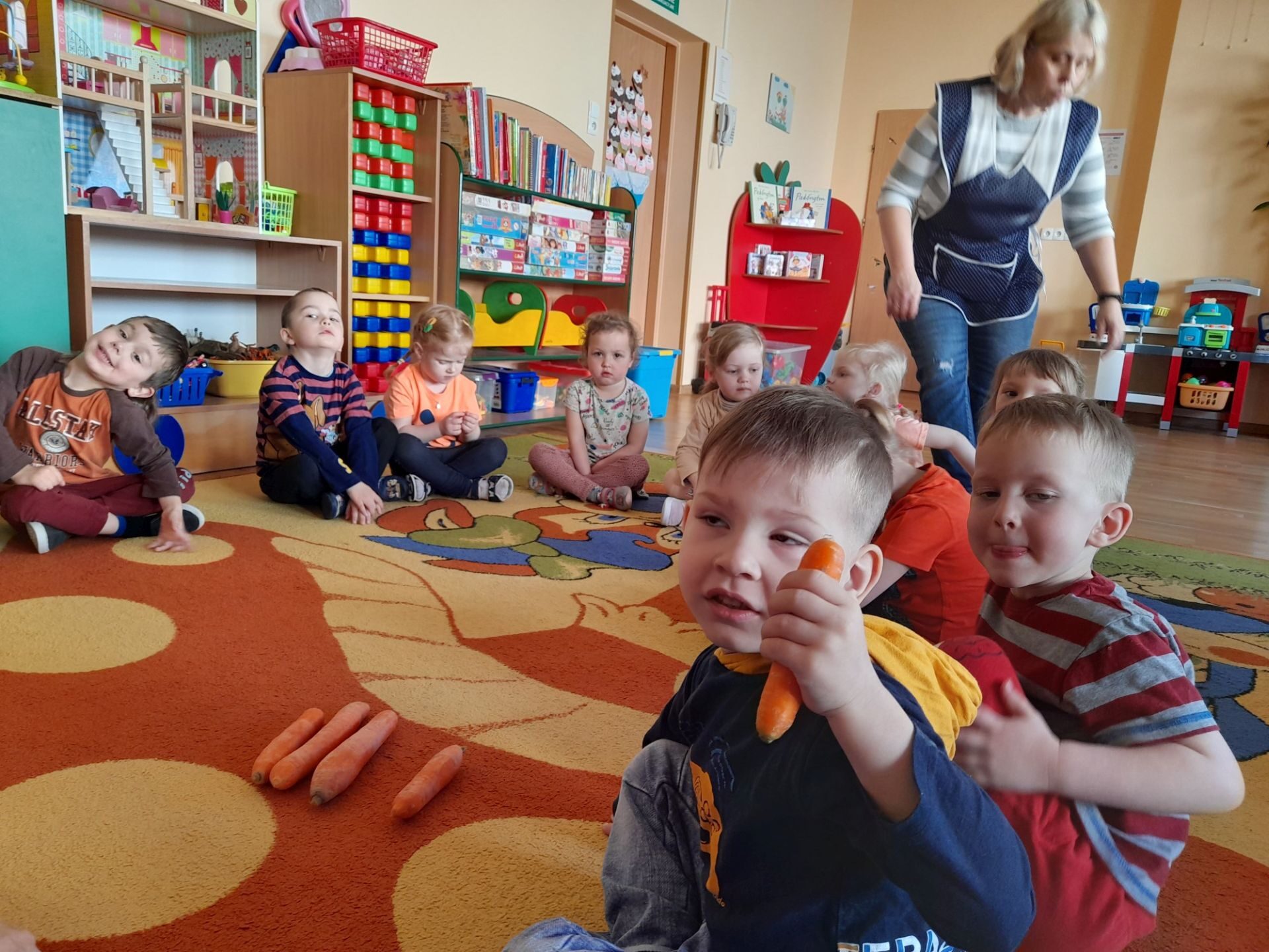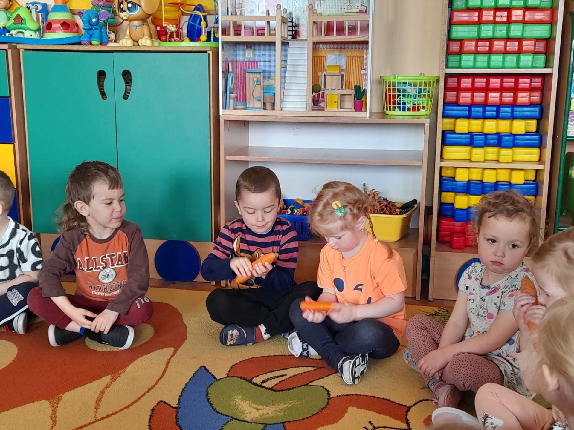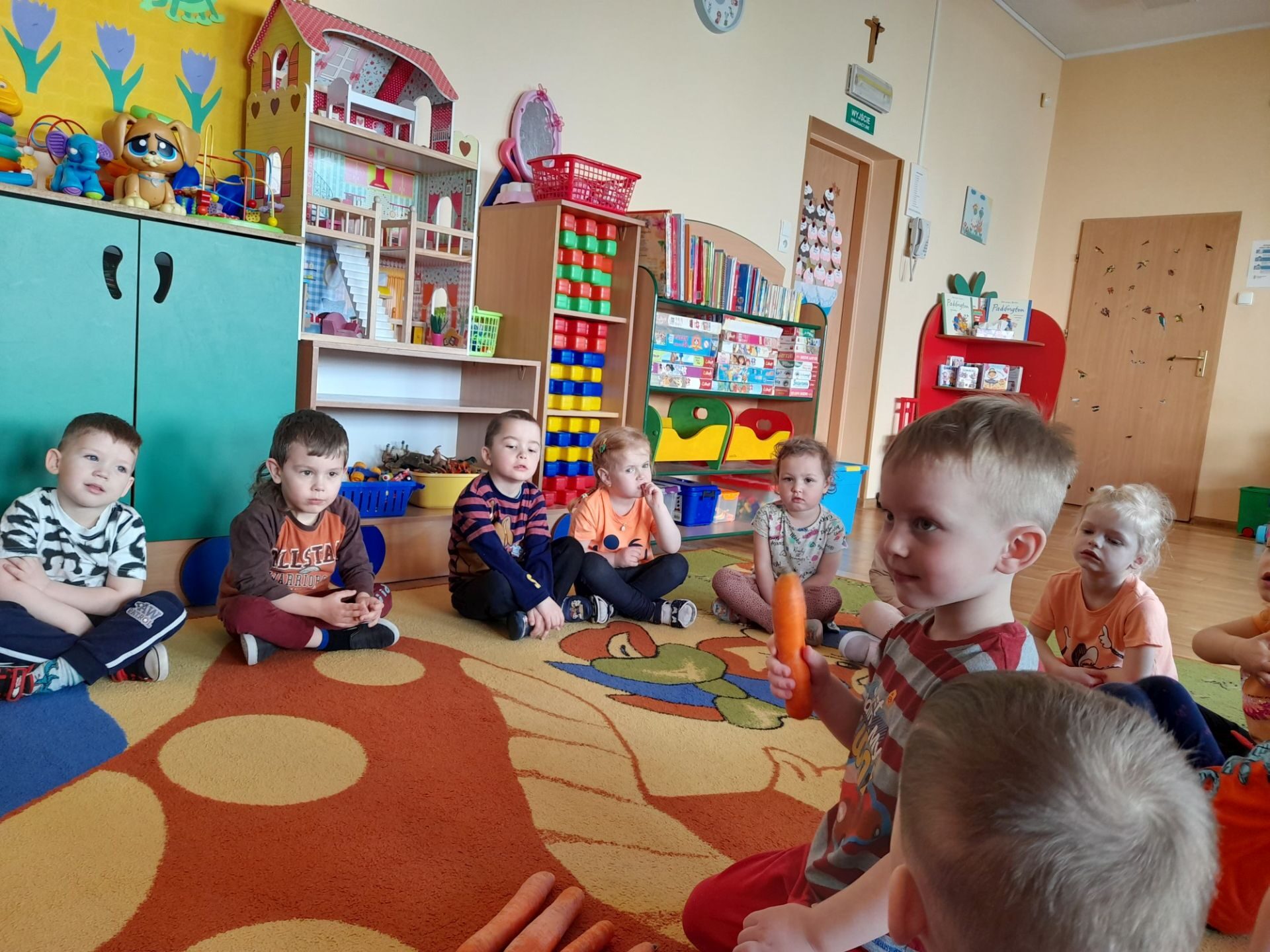 Dzień 27.04.2022r w naszym przedszkolu był dniem wyjątkowym- pomarańczowym, marchewkowym, zdrowym i witaminowym. W tym dniu dzieci przyszły do przedszkola ubrane na pomarańczowo. Realizując program edukacji żywieniowej przedszkolaki poznały zalety i walory marchewki. Dzieci mogły się dowiedzieć wiele ciekawych rzeczy: jak bardzo jest zdrowa , zawiera wiele cennych witamin i składników odżywczych, korzystnie wpływa na skórę, włosy oraz wzrok. Warto go pić, bo to witaminowa „bomba”. Przedszkolaki dowiedziały się, że z marchewki można zrobić też dżem, sok i upiec marchewkowe ciasto. Ten „bardzo zdrowy dzień pomarańczowy” wypełniony był zabawami przy piosenkach o marchewce, pracami plastycznymi oczywiście o marchewce, chrupaniem surowych marchewek, próbowaniem marchewkowego soku a także degustacją surówki z marchewki.