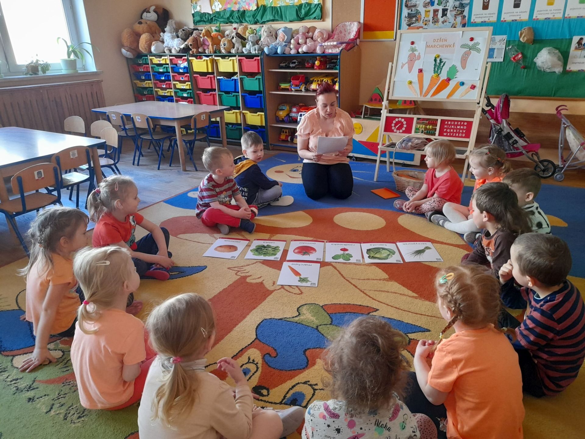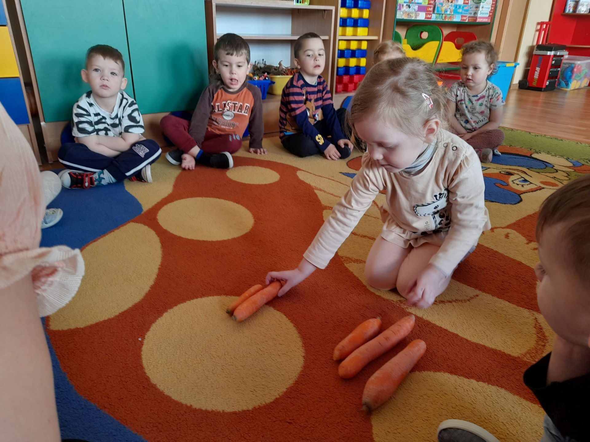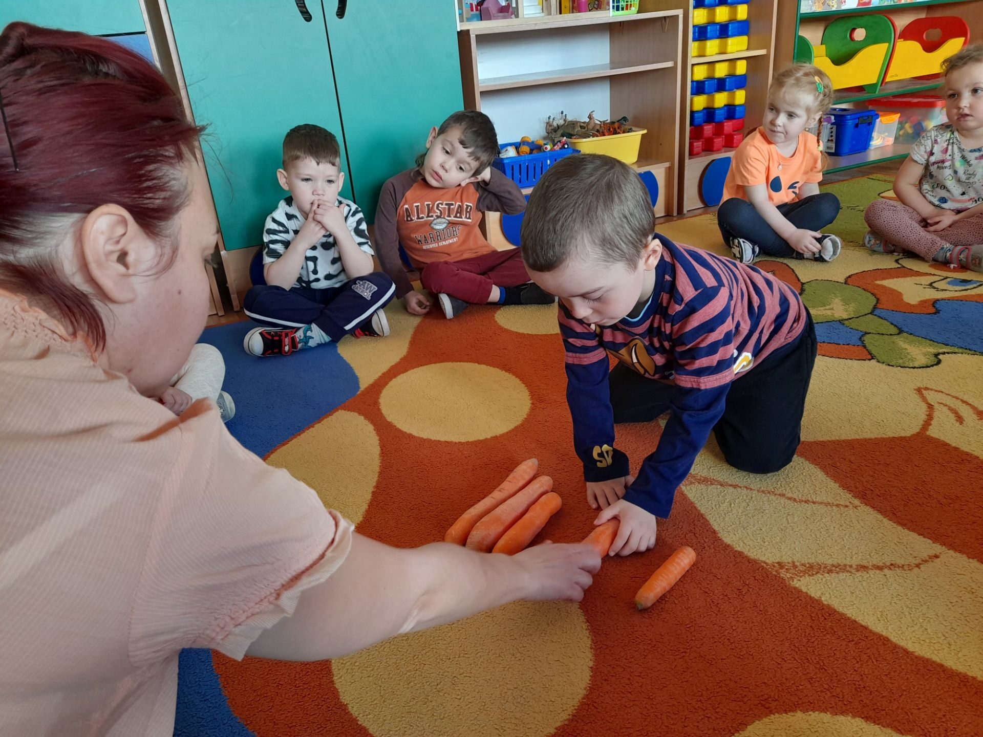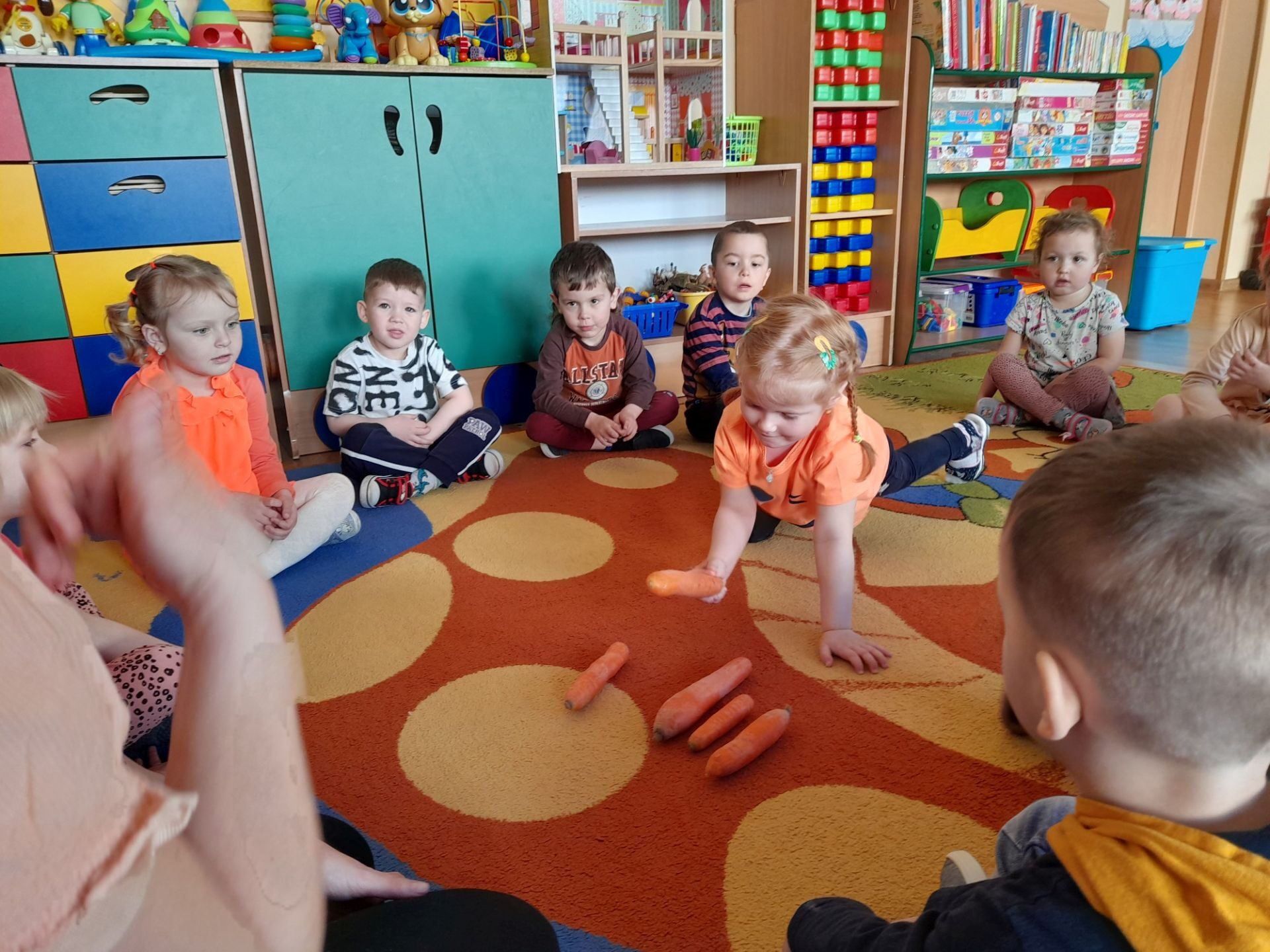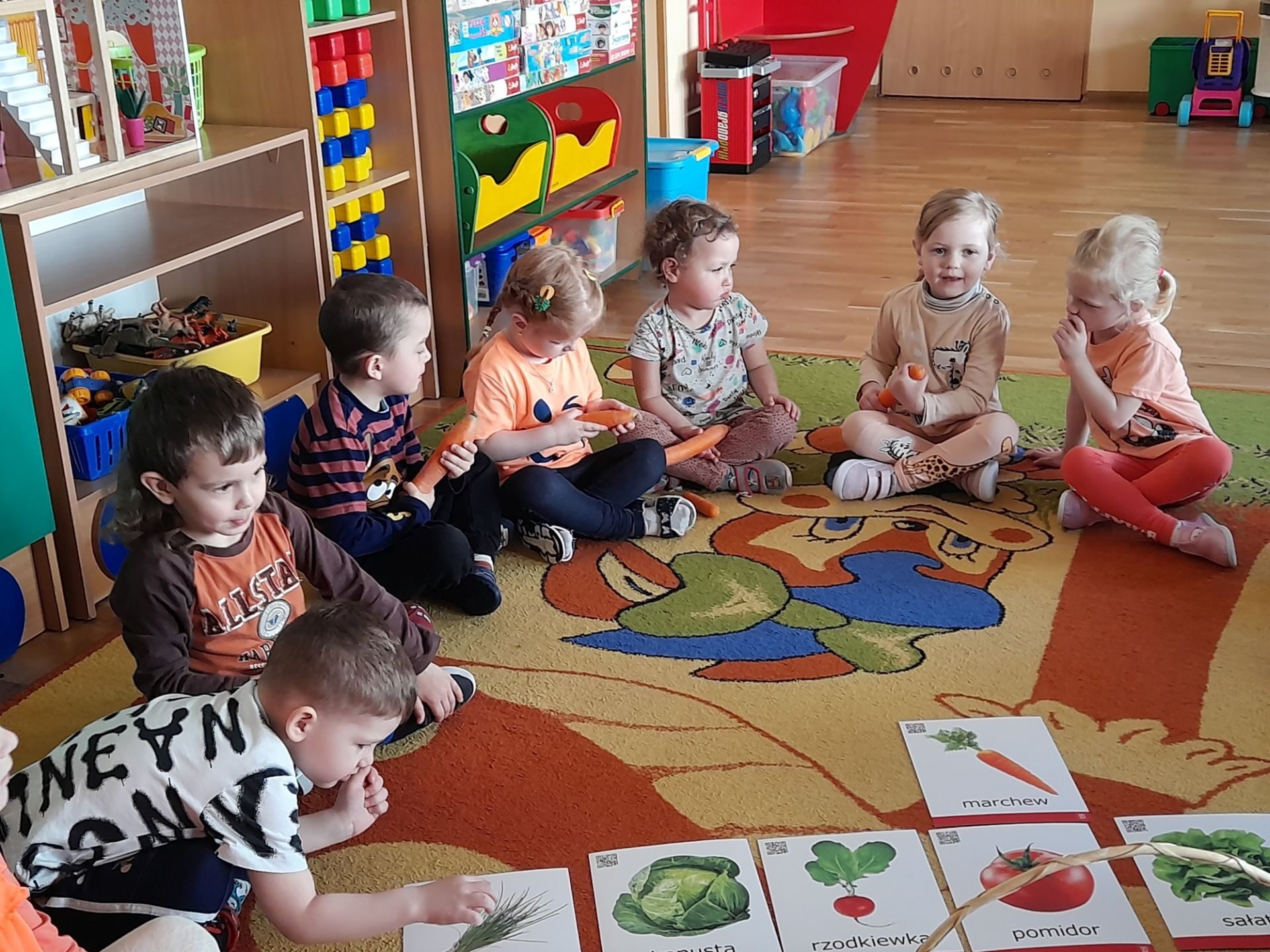 Dzień 27.04.2022r w naszym przedszkolu był dniem wyjątkowym- pomarańczowym, marchewkowym, zdrowym i witaminowym. W tym dniu dzieci przyszły do przedszkola ubrane na pomarańczowo. Realizując program edukacji żywieniowej przedszkolaki poznały zalety i walory marchewki. Dzieci mogły się dowiedzieć wiele ciekawych rzeczy: jak bardzo jest zdrowa , zawiera wiele cennych witamin i składników odżywczych, korzystnie wpływa na skórę, włosy oraz wzrok. Warto go pić, bo to witaminowa „bomba”. Przedszkolaki dowiedziały się, że z marchewki można zrobić też dżem, sok i upiec marchewkowe ciasto. Ten „bardzo zdrowy dzień pomarańczowy” wypełniony był zabawami przy piosenkach o marchewce, pracami plastycznymi oczywiście o marchewce, chrupaniem surowych marchewek, próbowaniem marchewkowego soku a także degustacją surówki z marchewki.