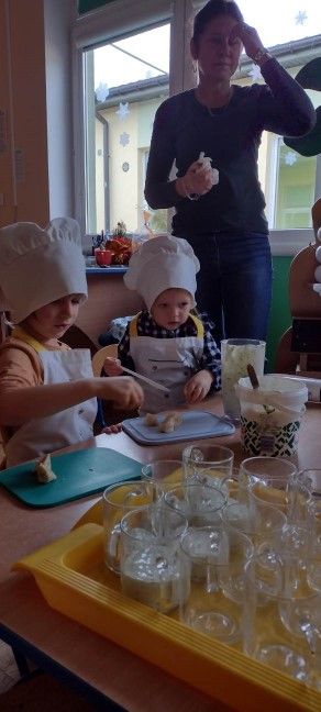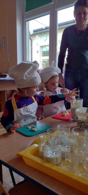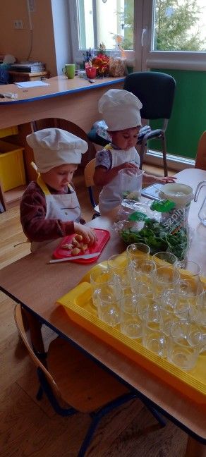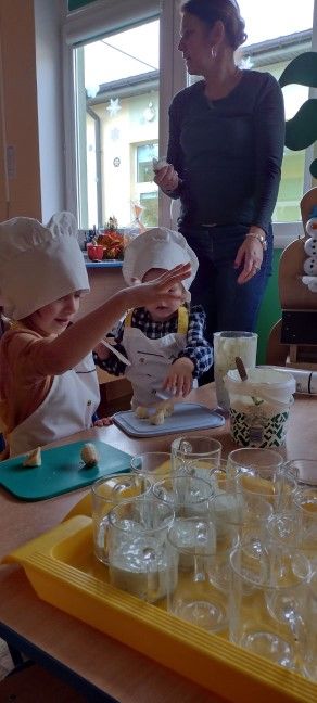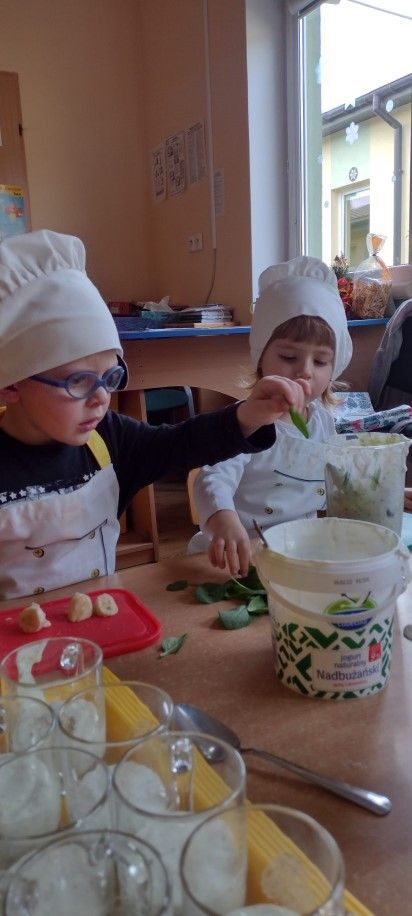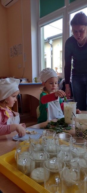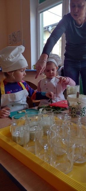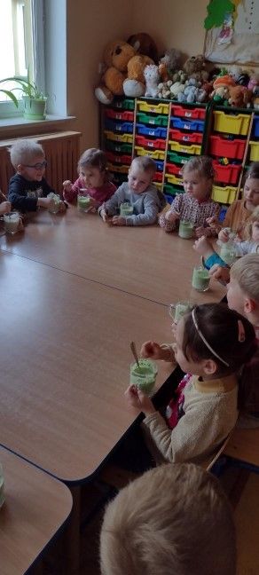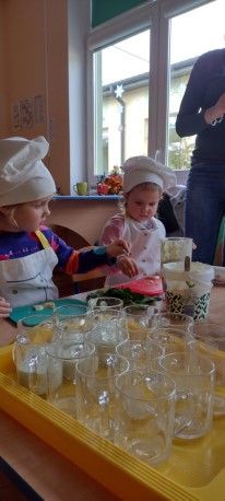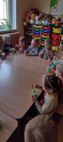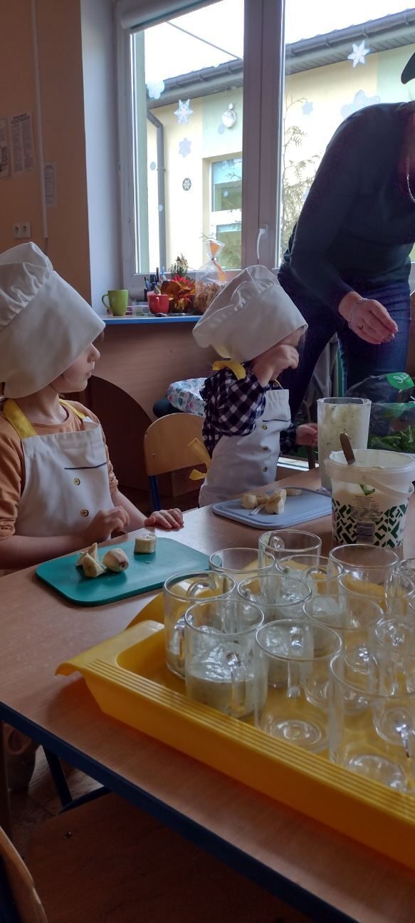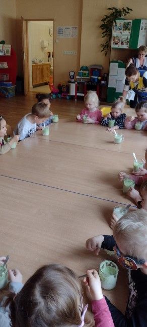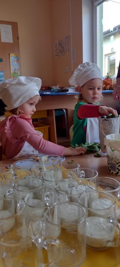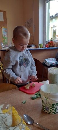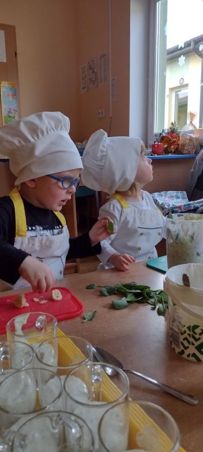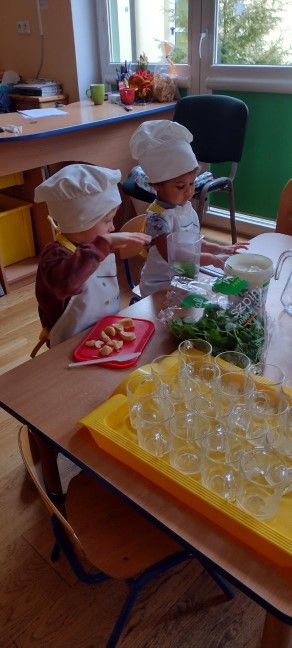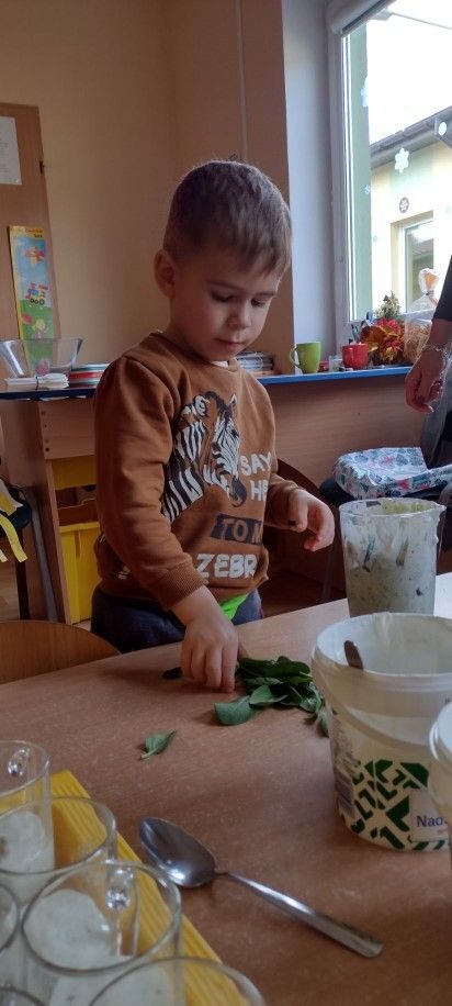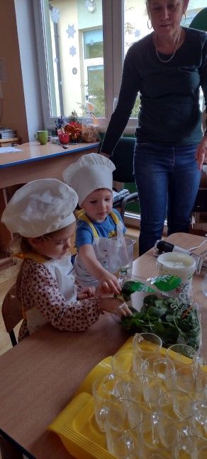 Dzieci wzięły również udział w zajęciach kulinarnych. Samodzielnie wykonały koktajl szpinakowo-bananowy lub sałatkę ze szpinaku.. Uczyły się w bezpieczny sposób korzystać z urządzenia elektrycznego jakim był blender.