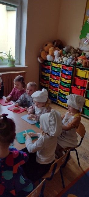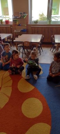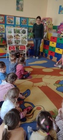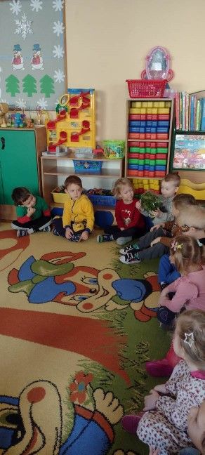 Przedszkolaki zostały wprowadzone w tematykę zajęć zagadką, ilustrowały ruchem treść utworu „Jarzynowa piosenka”, rozmawiały na temat treści piosenki, przeliczały zwierzęta występujące w piosence przy pomocy zielonych liczmanów ( klocki, mozaika geometryczna, guziki, pomponiki, woreczki itp.). Zapoznały się z wyglądem szpinaku, jego wartościami odżywczymi oraz poznały ciekawostki na jego temat. Oglądały ilustracje dotyczące potraw ze szpinaku. Bawiły się przy piosence „Witaminki” trzymając w ręku paski zielonej bibuły.