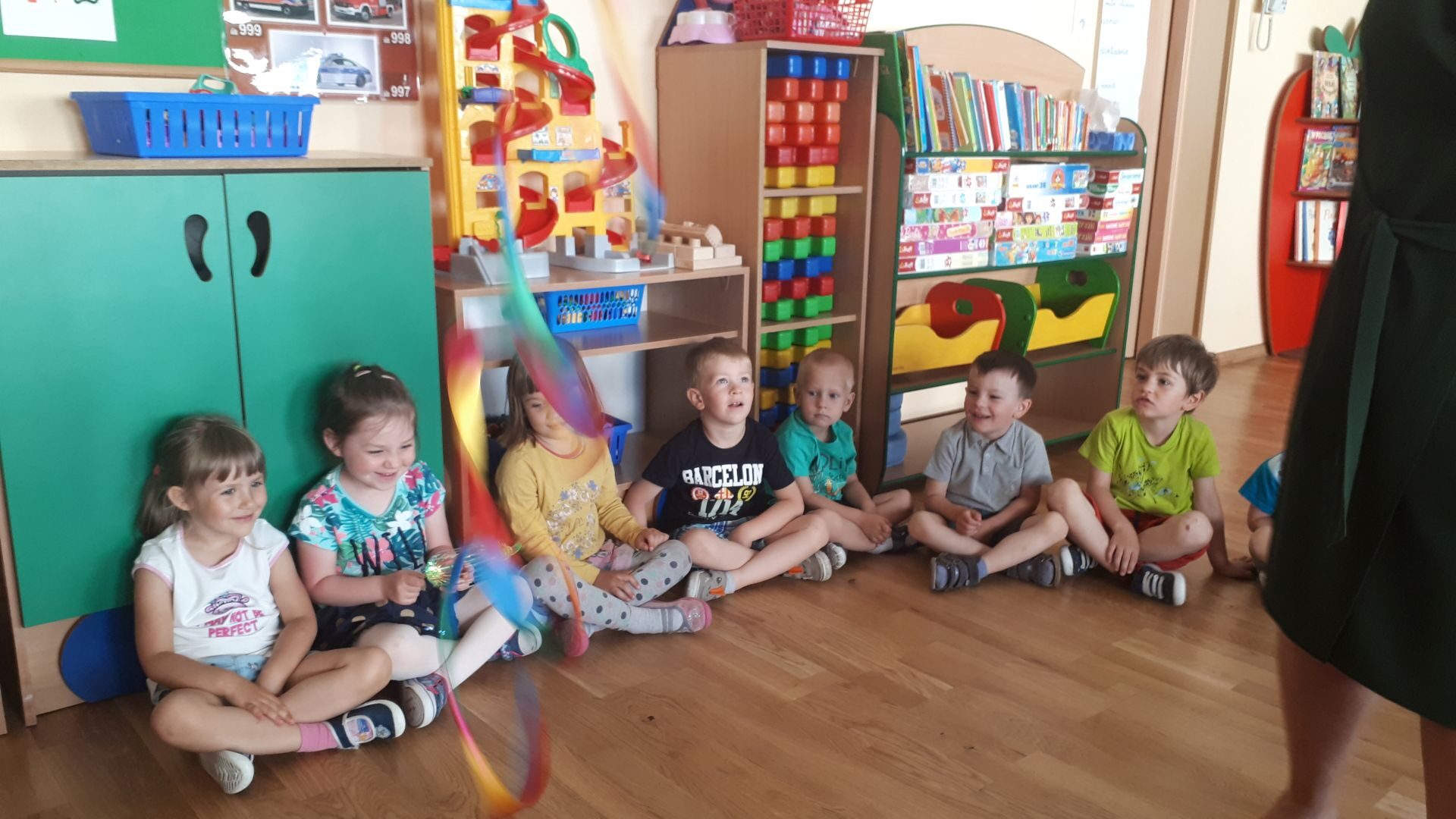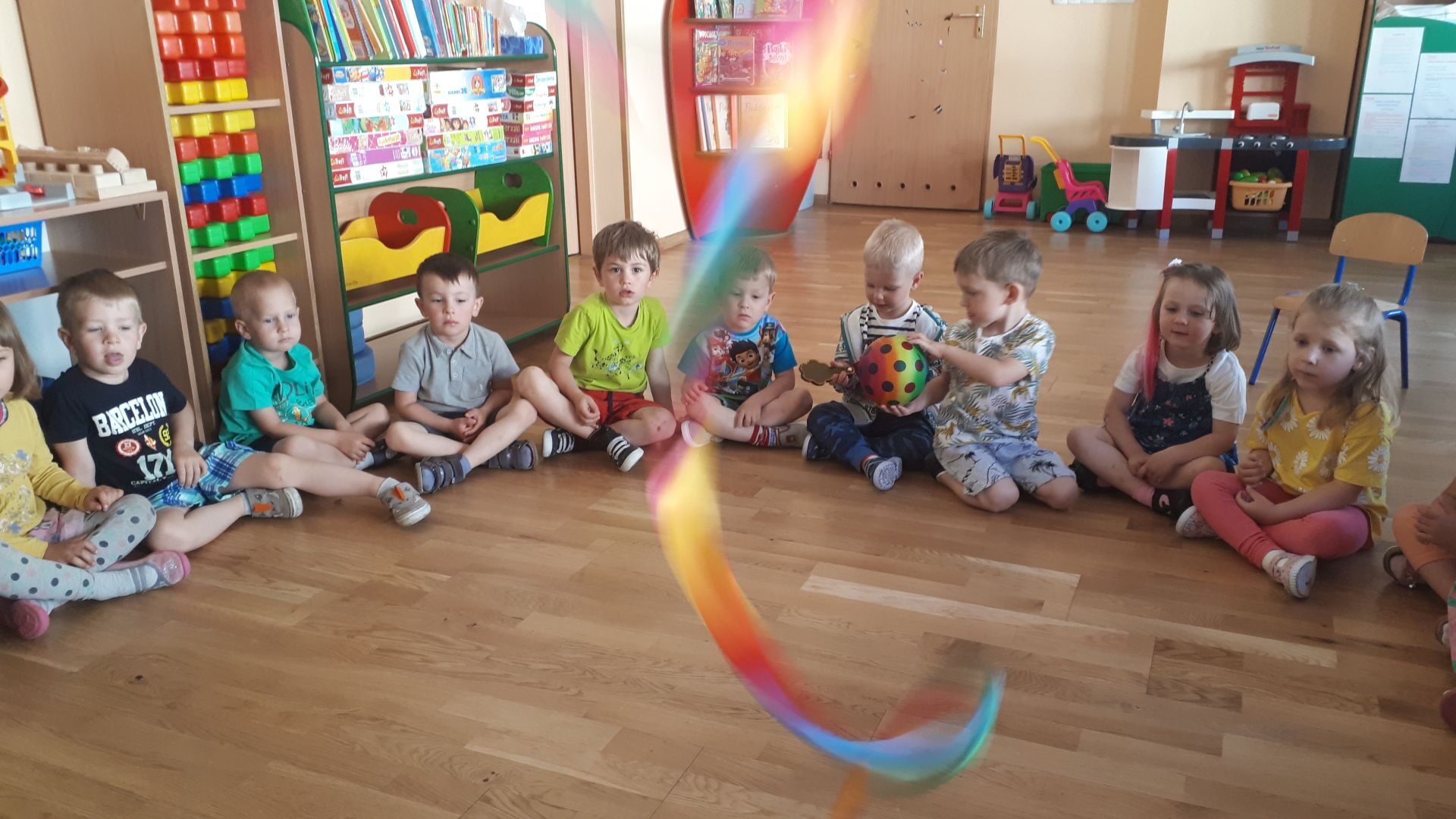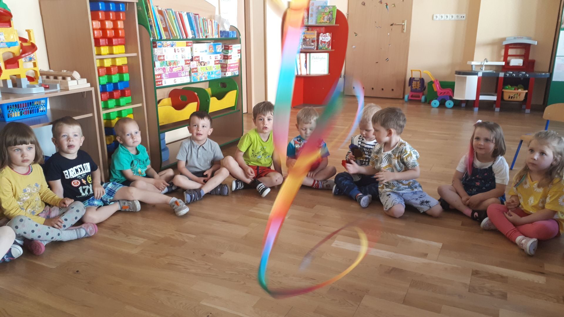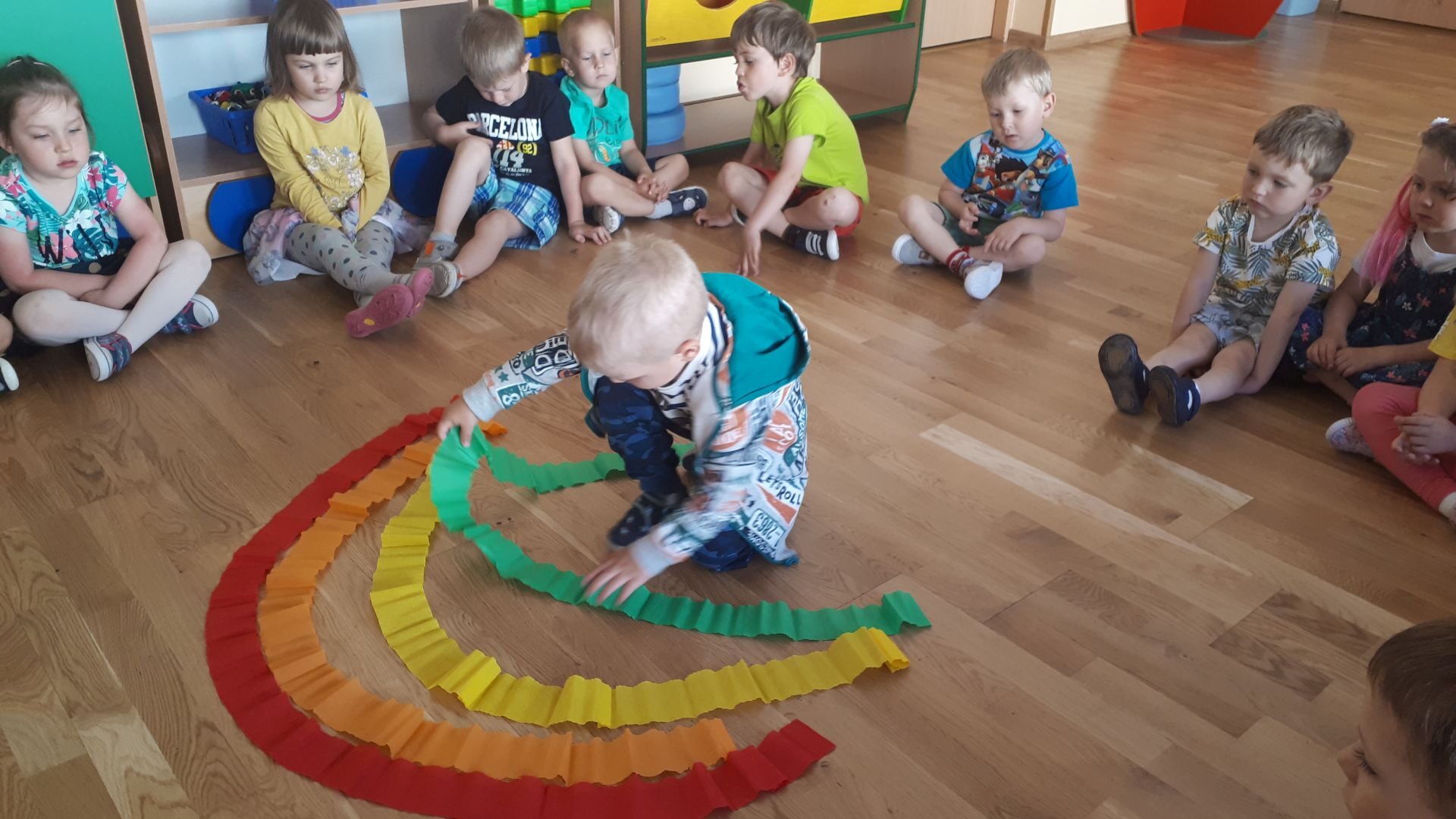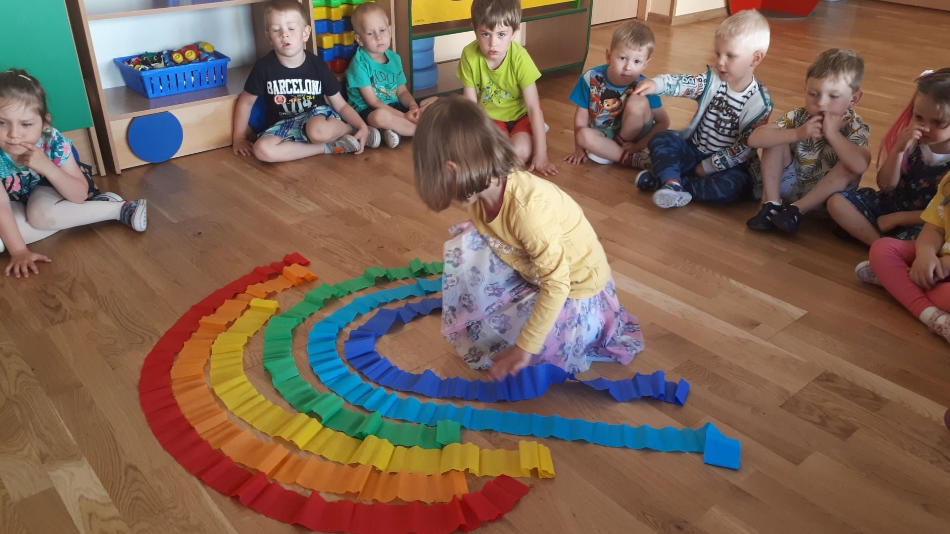 - „Tęczowe podchody” – szukanie kolorowych przedmiotów w Sali.
