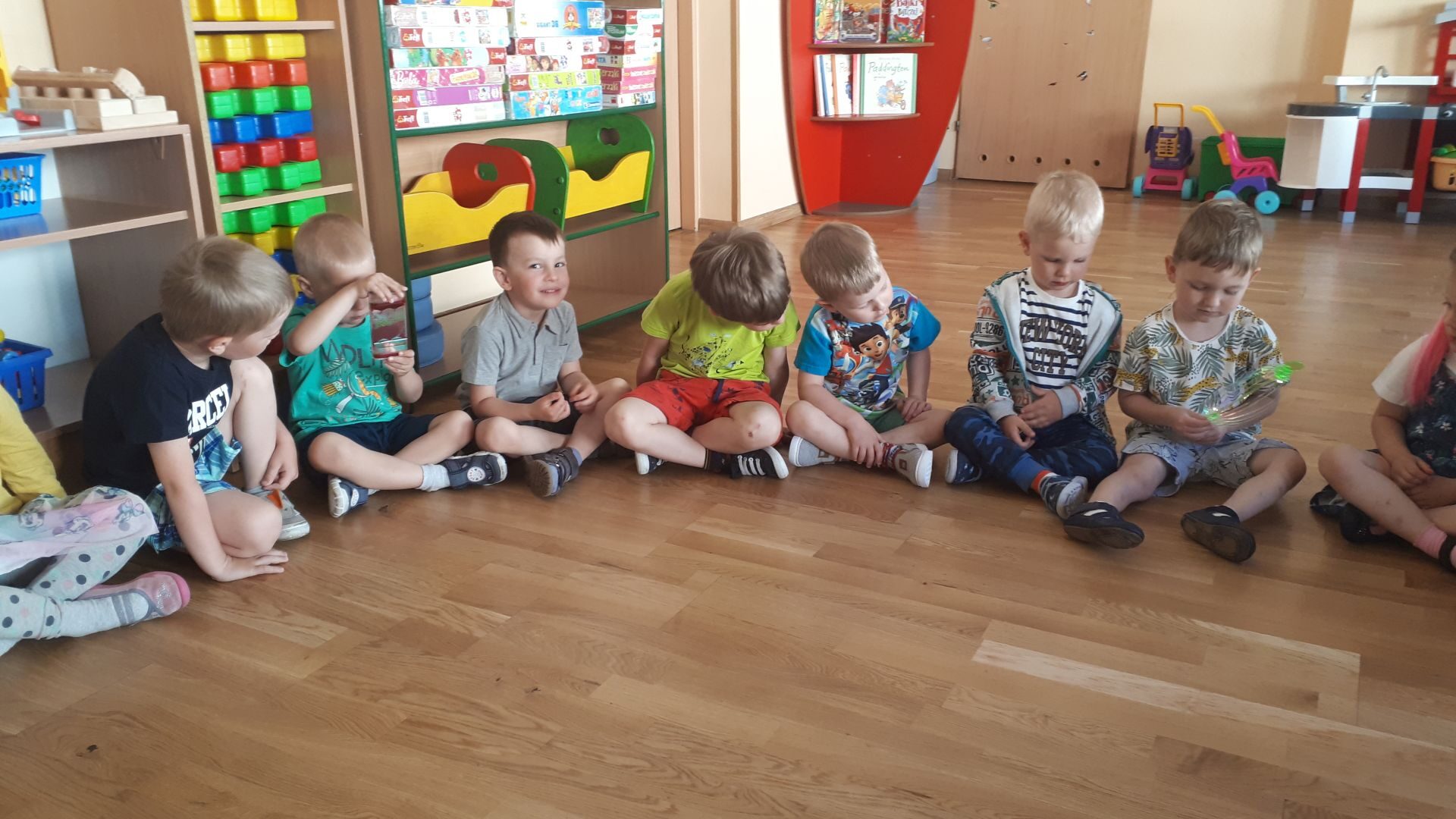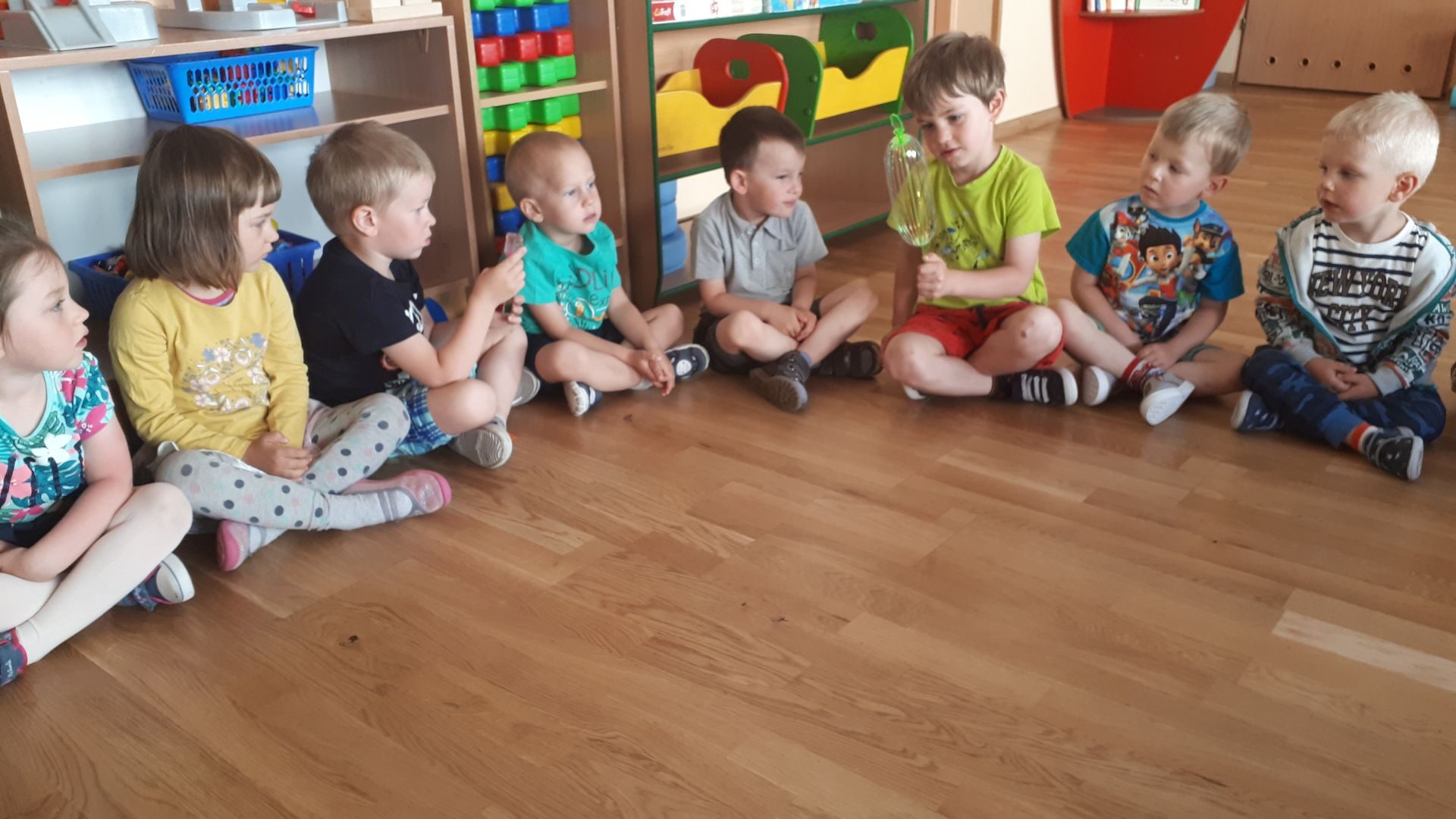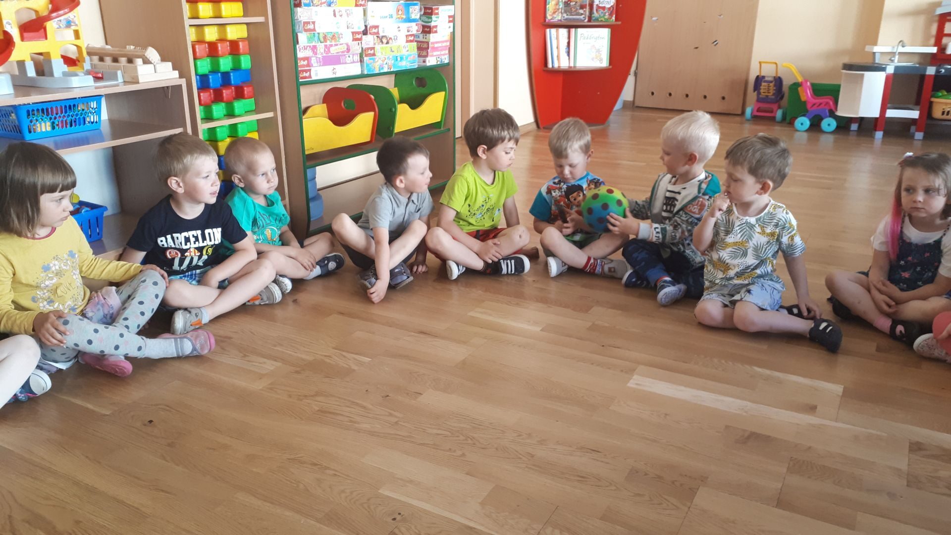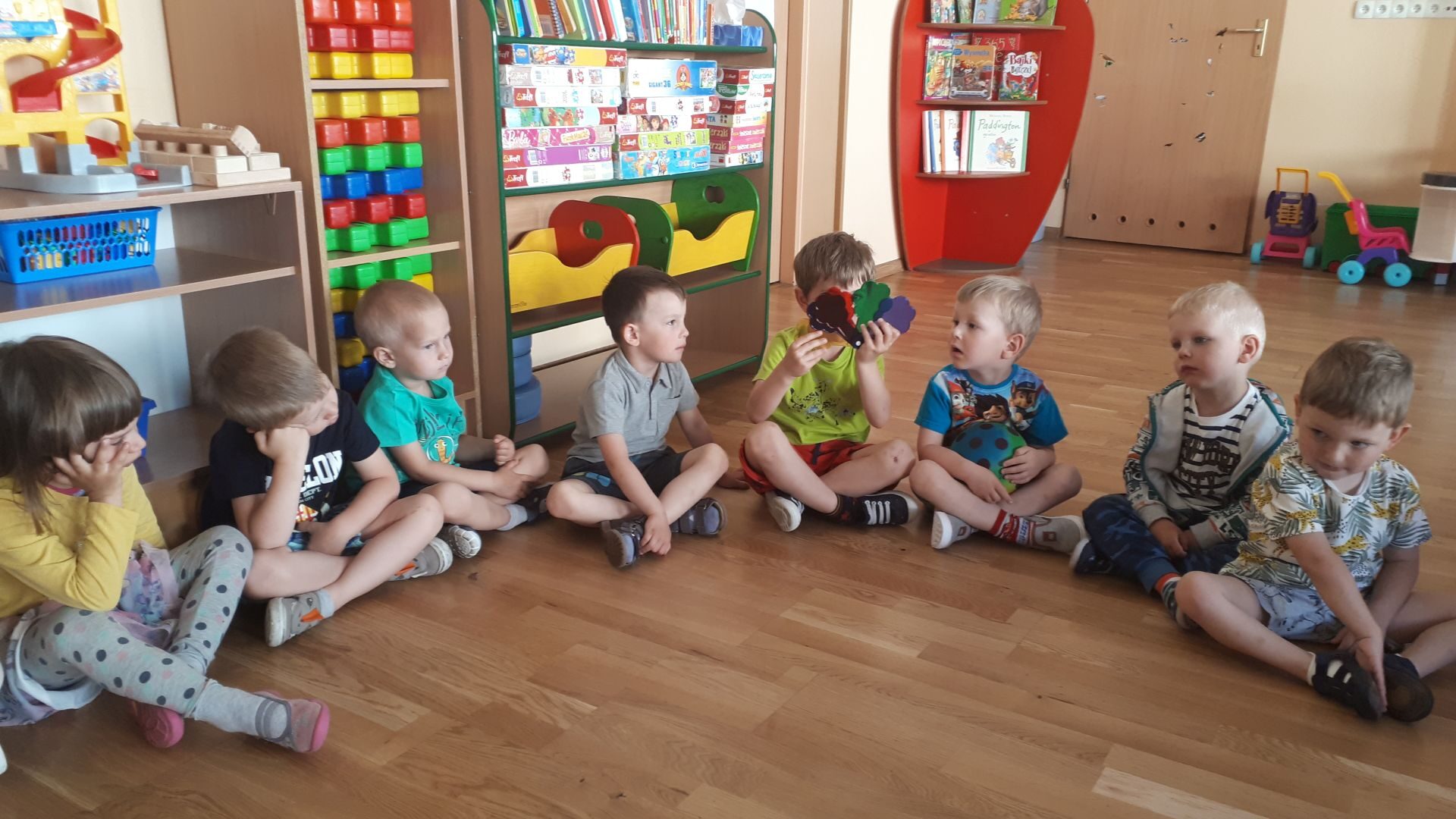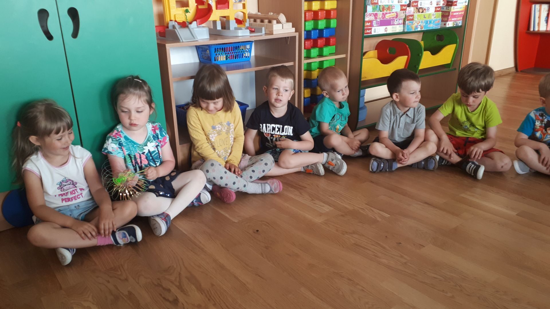 - „Tęczowe podchody” – szukanie kolorowych przedmiotów w Sali.