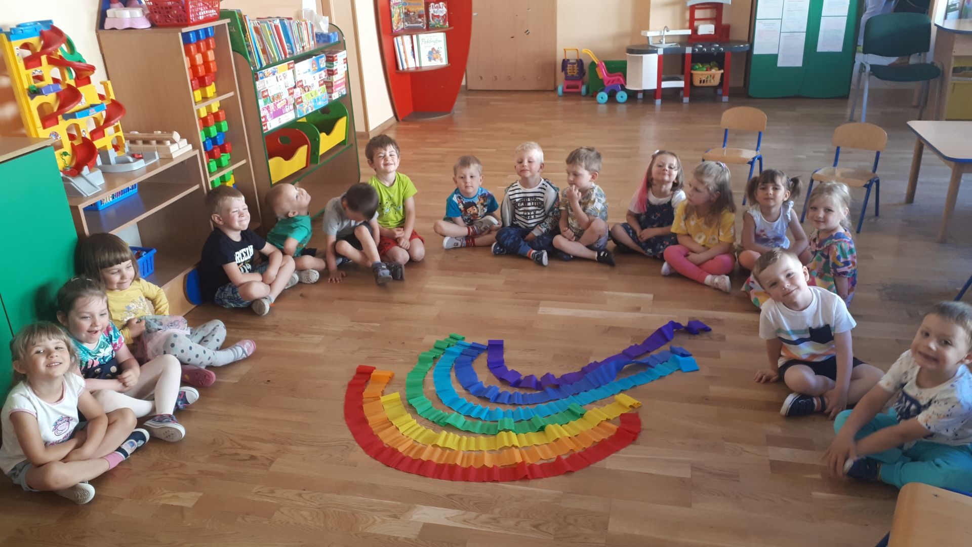 Dzień tęczowy”, odbył się 8.06 .2021r , w każdej grupie przedszkolnej.Tego dnia dzieci, nauczyciele oraz pracownicy przedszkola ubrani byli w kolory tęczy. Nauczycielki z każdej grupy przygotowały zajęcia i zabawy związane z kolorami tęczy . Przygotowano dla dzieci następujące zadania: