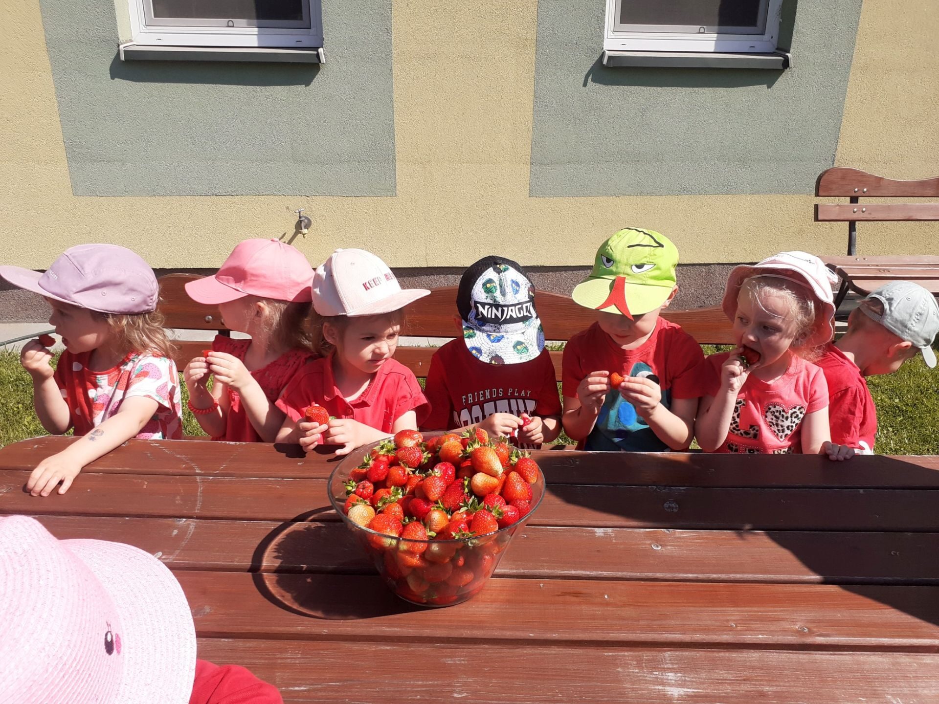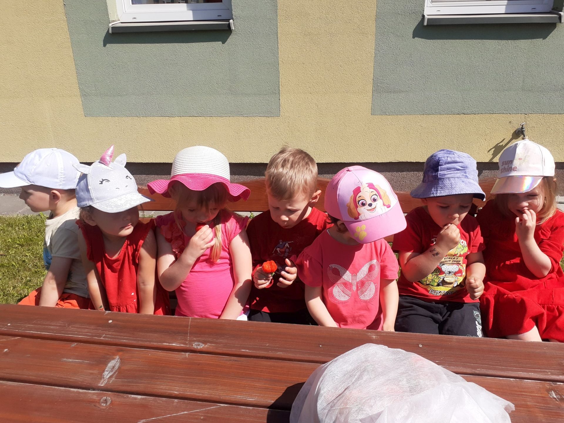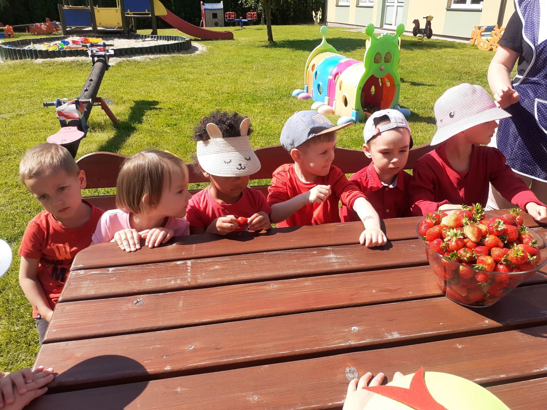 Dnia 05.06.2023r. w naszym przedszkolu obchodziliśmy dzień truskawki. Przedszkolaki wysłuchały wiersza D. Strzemińskiej-Więckowiak pt.: „Truskawka”, rozmawiały na temat wykorzystania owoców w kuchni, rozpoznawały truskawkę na ilustracjach. W ogrodzie przedszkolnym szukały ukrytych owoców, ważyły plastikowe truskawki na zabawkowej wadze, doskonaliły koordynację wzrokowo ruchową podczas zabaw ruchowych. Na zakończenie degustowały te soczyste owoce.