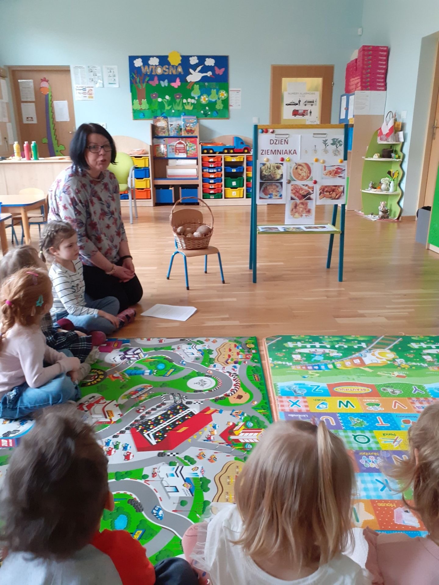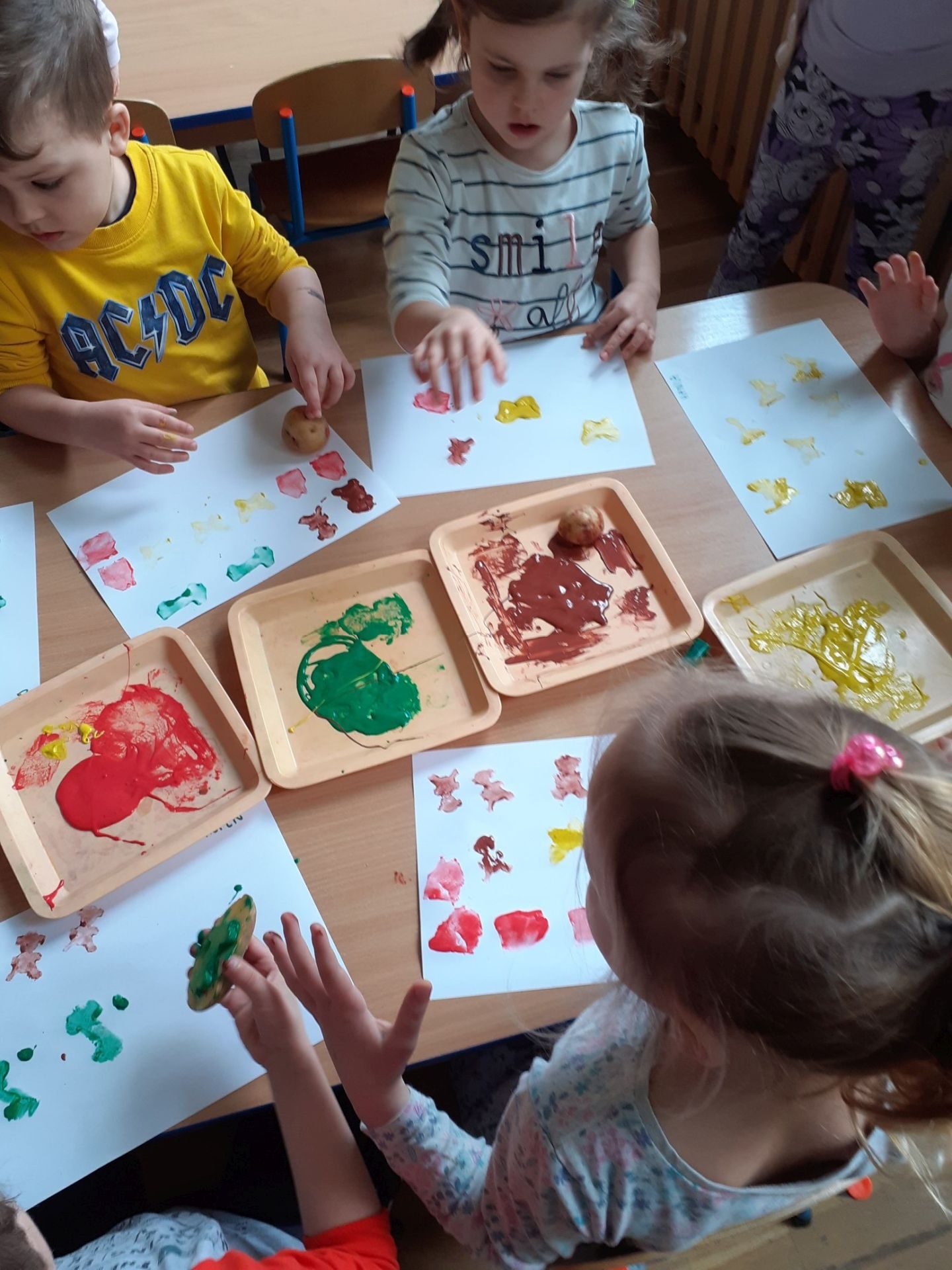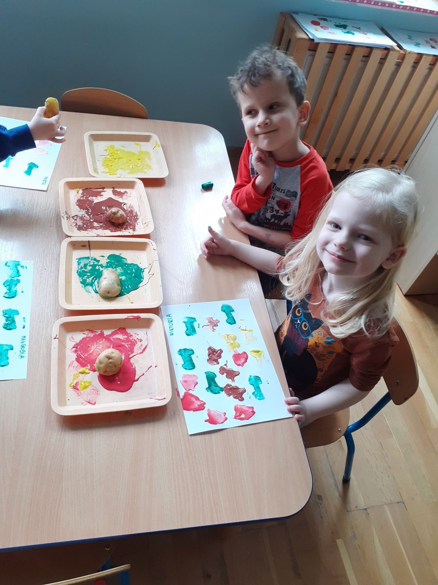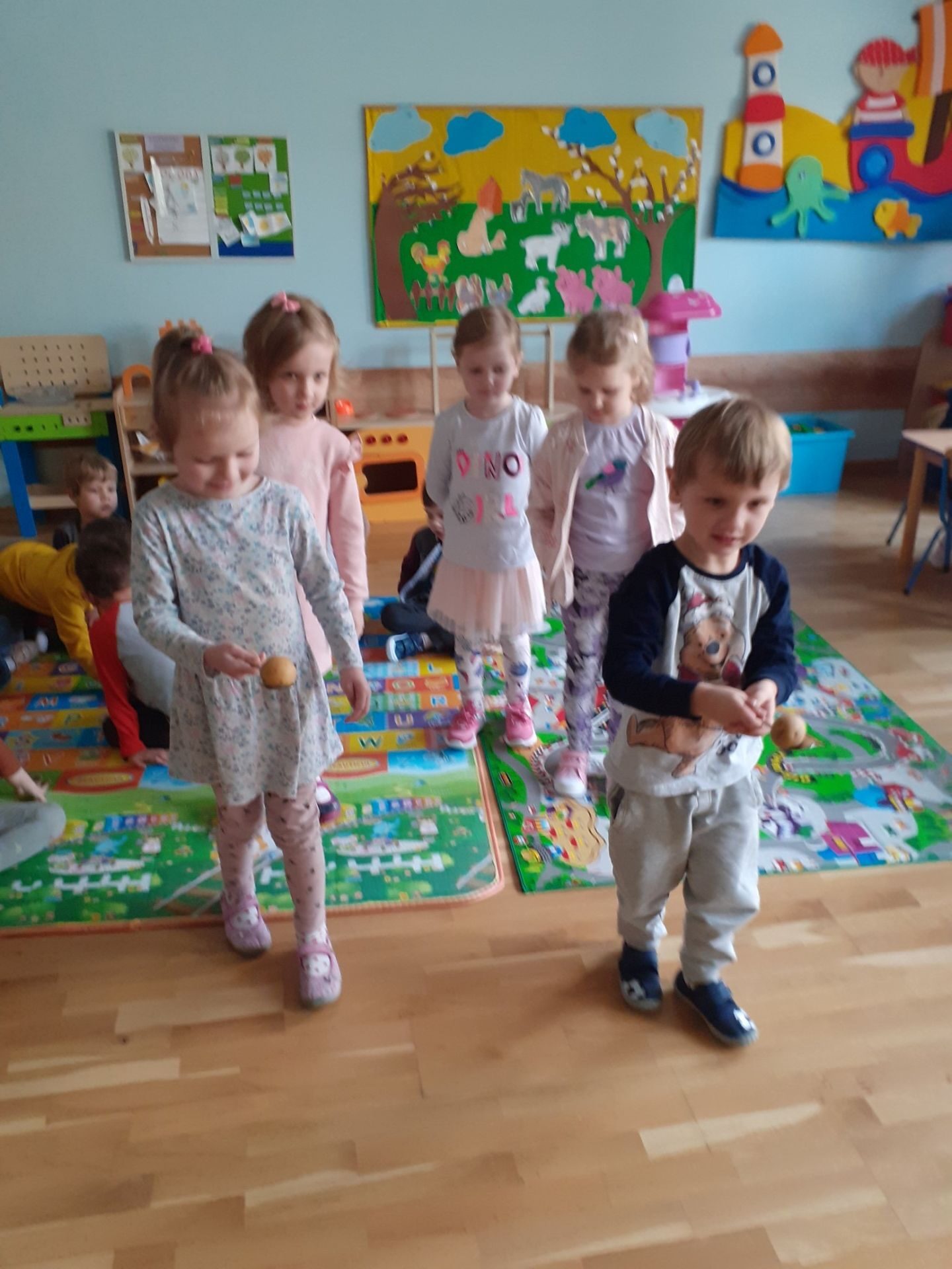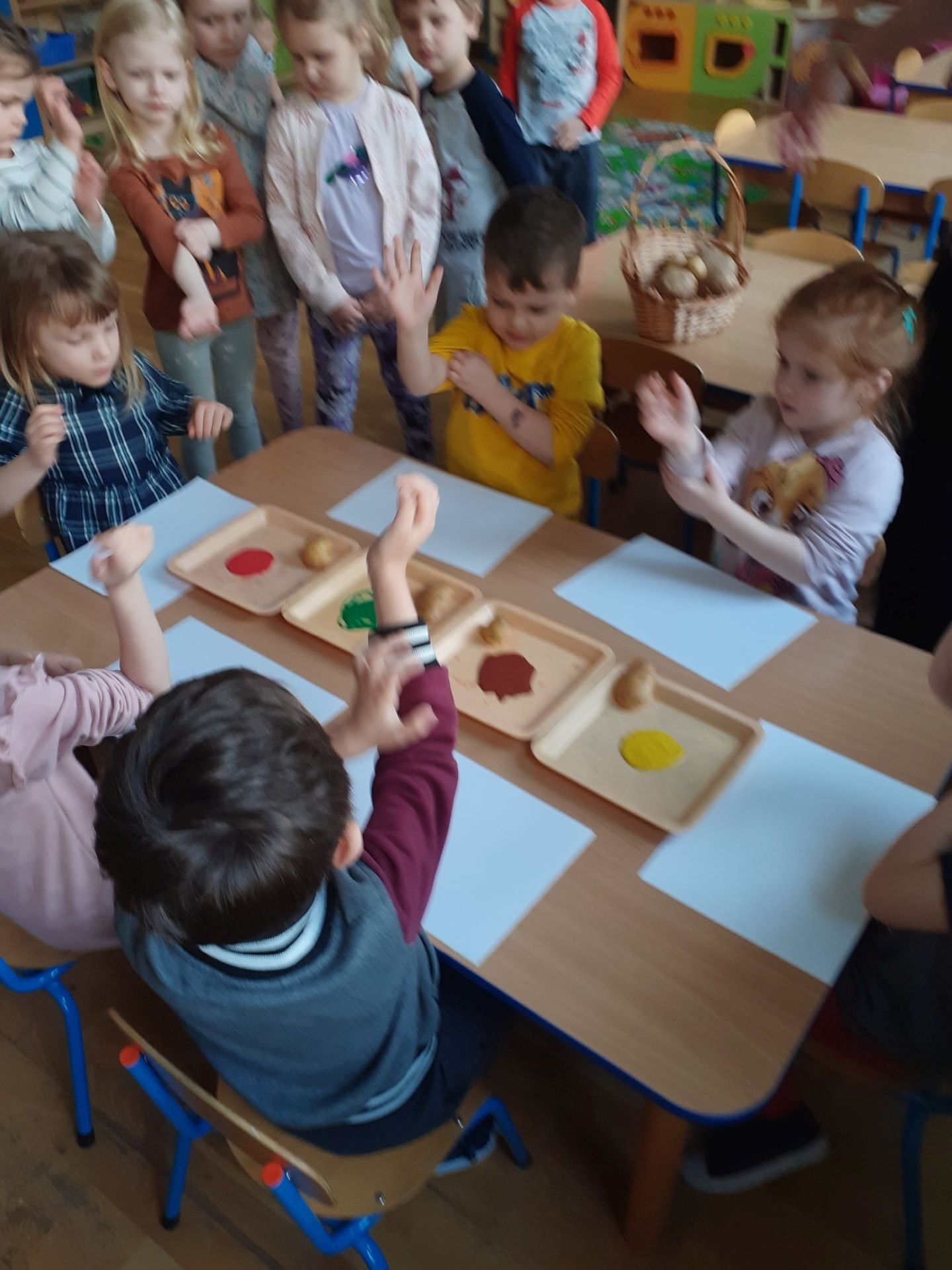Dnia 28 marca w grupie Pszczółek obchodziliśmy Dzień Ziemniaka, z tej okazji każdy przedszkolak był ubrany na brązowo i przyniósł z domu wspomniane wyżej warzywo. Zajęcia rozpoczęliśmy od zagadki dotyczącej bohatera dzisiejszego dnia .Dzieci zostały zapoznane z „Krótką bajką o ziemniaku”, obejrzały film edukacyjny “Częstujcie się – ziemniak poznały ciekawostki na temat ziemniaków, wzięły udział w ziemniaczanych dyscyplinach sportowych m.in. bieg z ziemniakiem na łyżce, rzucanie ziemniakiem do celu. Przedszkolaki doskonale wiedziały, jakie potrawy robi się z ziemniaków i ochoczo je wymieniły. Uwieńczeniem zabaw była praca plastyczna- wykonanie obrazu za pomocą stempli ziemniaczanych