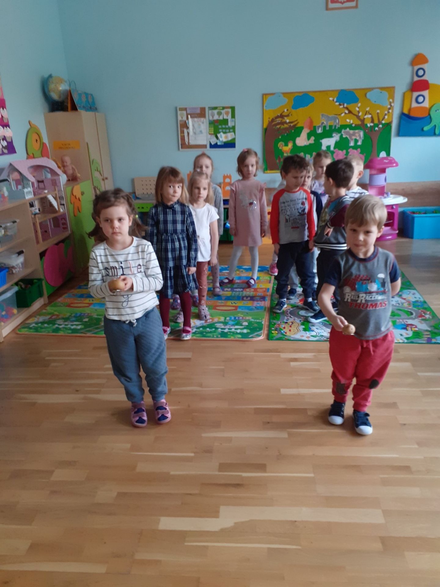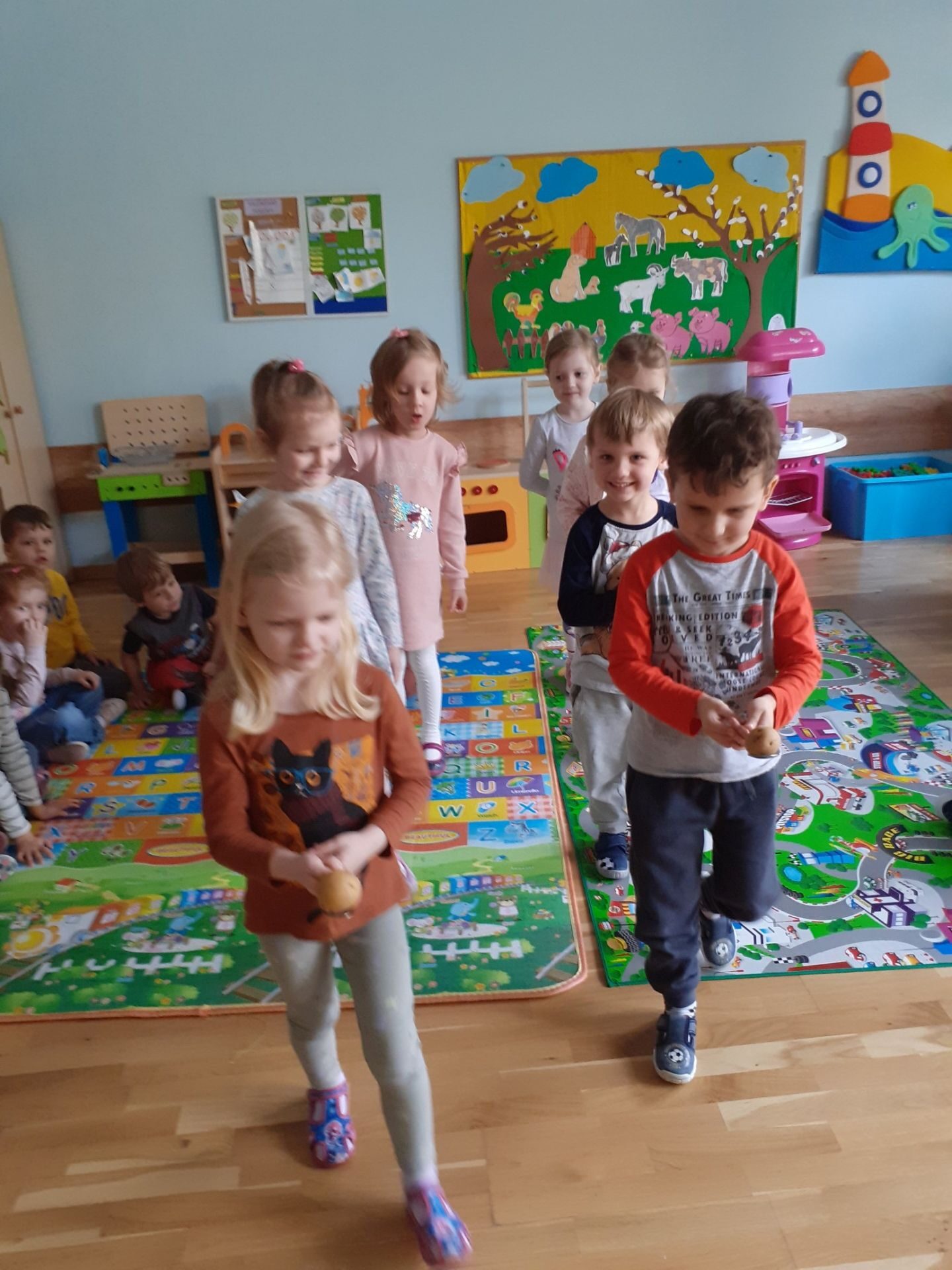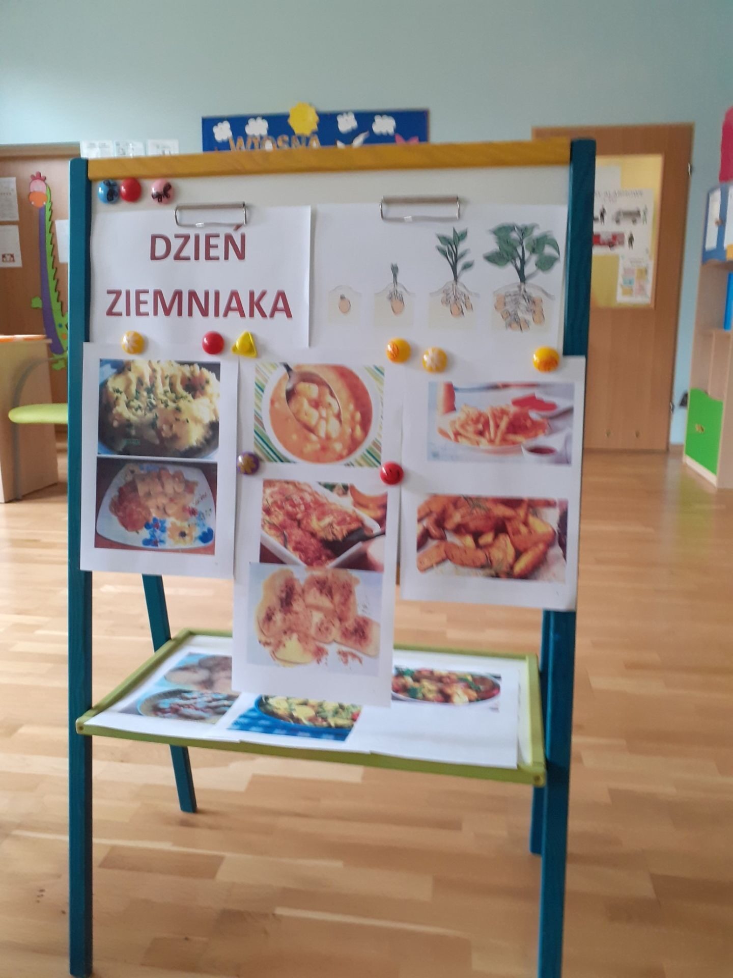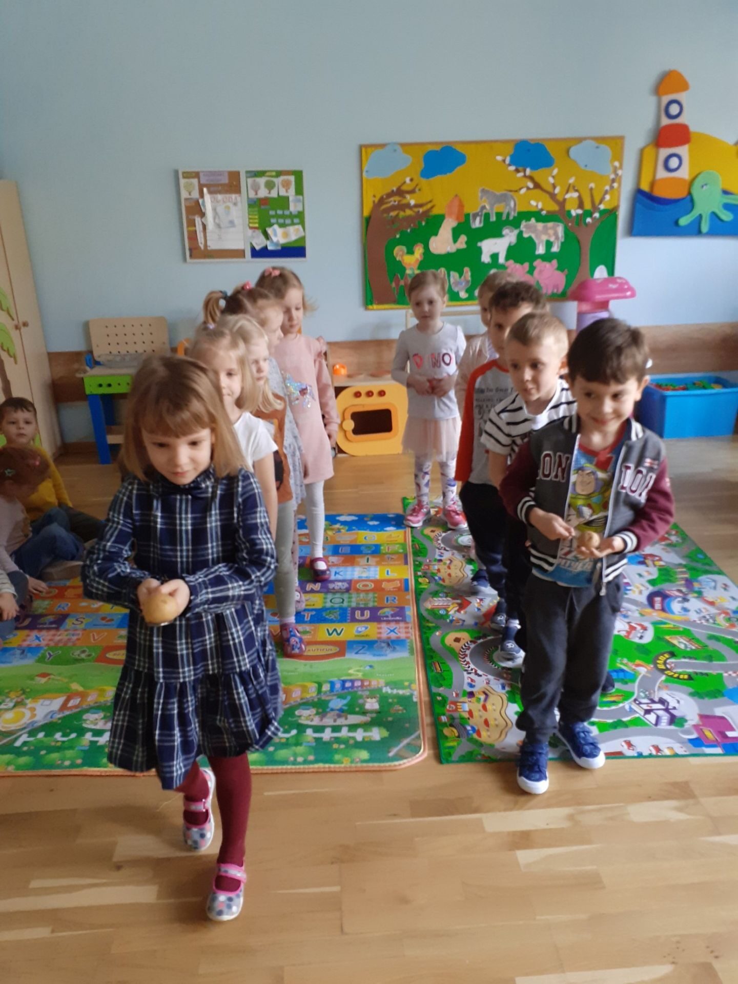 Dnia 28 marca w grupie Pszczółek obchodziliśmy Dzień Ziemniaka, z tej okazji każdy przedszkolak był ubrany na brązowo i przyniósł z domu wspomniane wyżej warzywo. Zajęcia rozpoczęliśmy od zagadki dotyczącej bohatera dzisiejszego dnia .Dzieci zostały zapoznane z „Krótką bajką o ziemniaku”, obejrzały film edukacyjny “Częstujcie się – ziemniak poznały ciekawostki na temat ziemniaków, wzięły udział w ziemniaczanych dyscyplinach sportowych m.in. bieg z ziemniakiem na łyżce, rzucanie ziemniakiem do celu. Przedszkolaki doskonale wiedziały, jakie potrawy robi się z ziemniaków i ochoczo je wymieniły. Uwieńczeniem zabaw była praca plastyczna- wykonanie obrazu za pomocą stempli ziemniaczanych