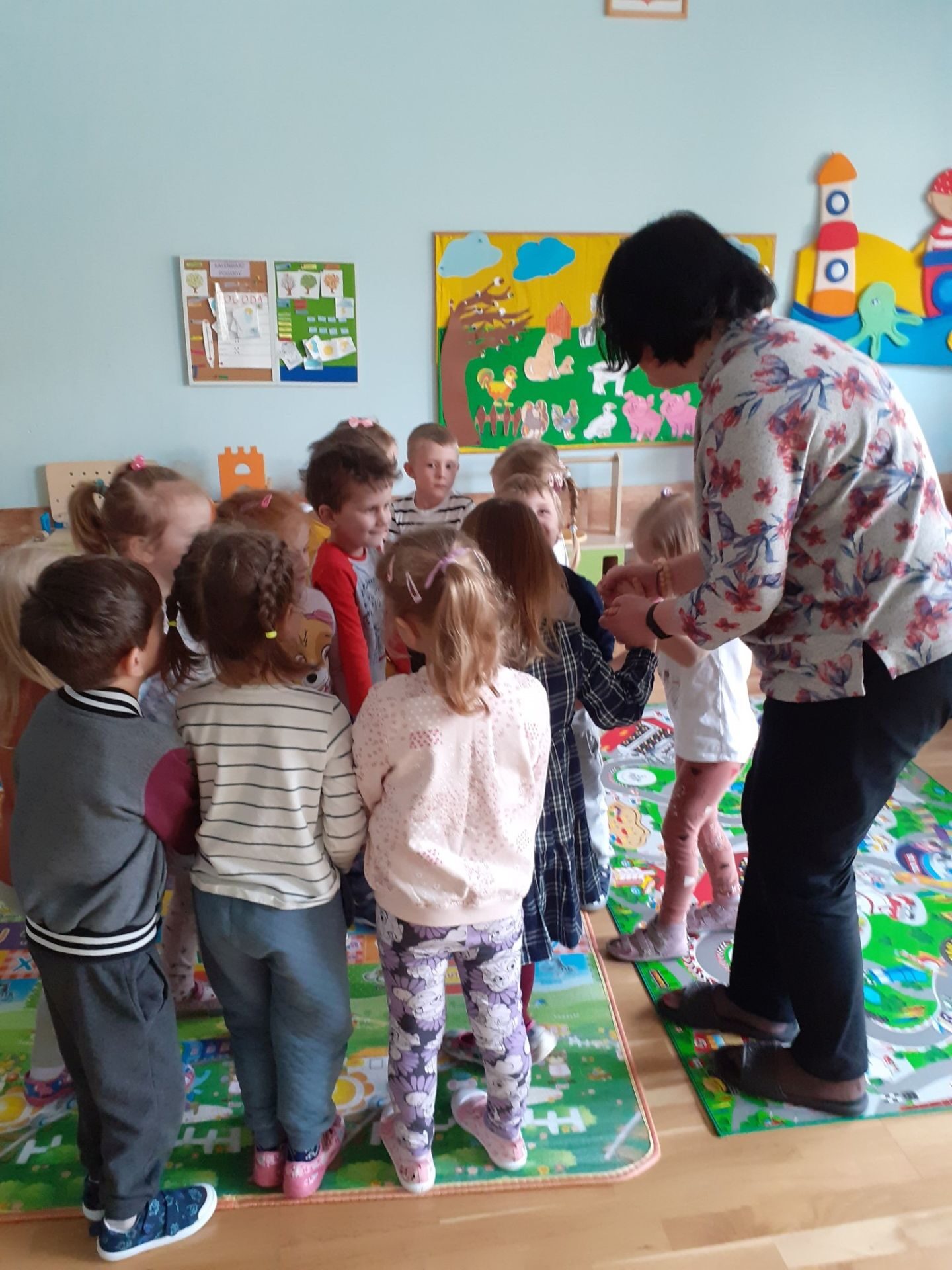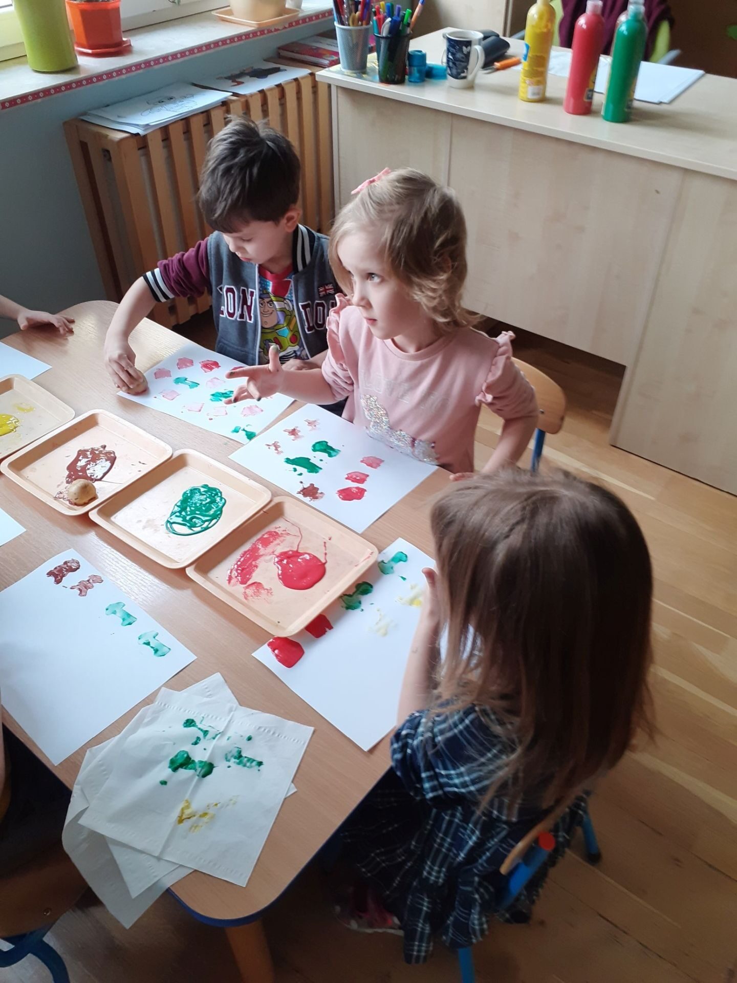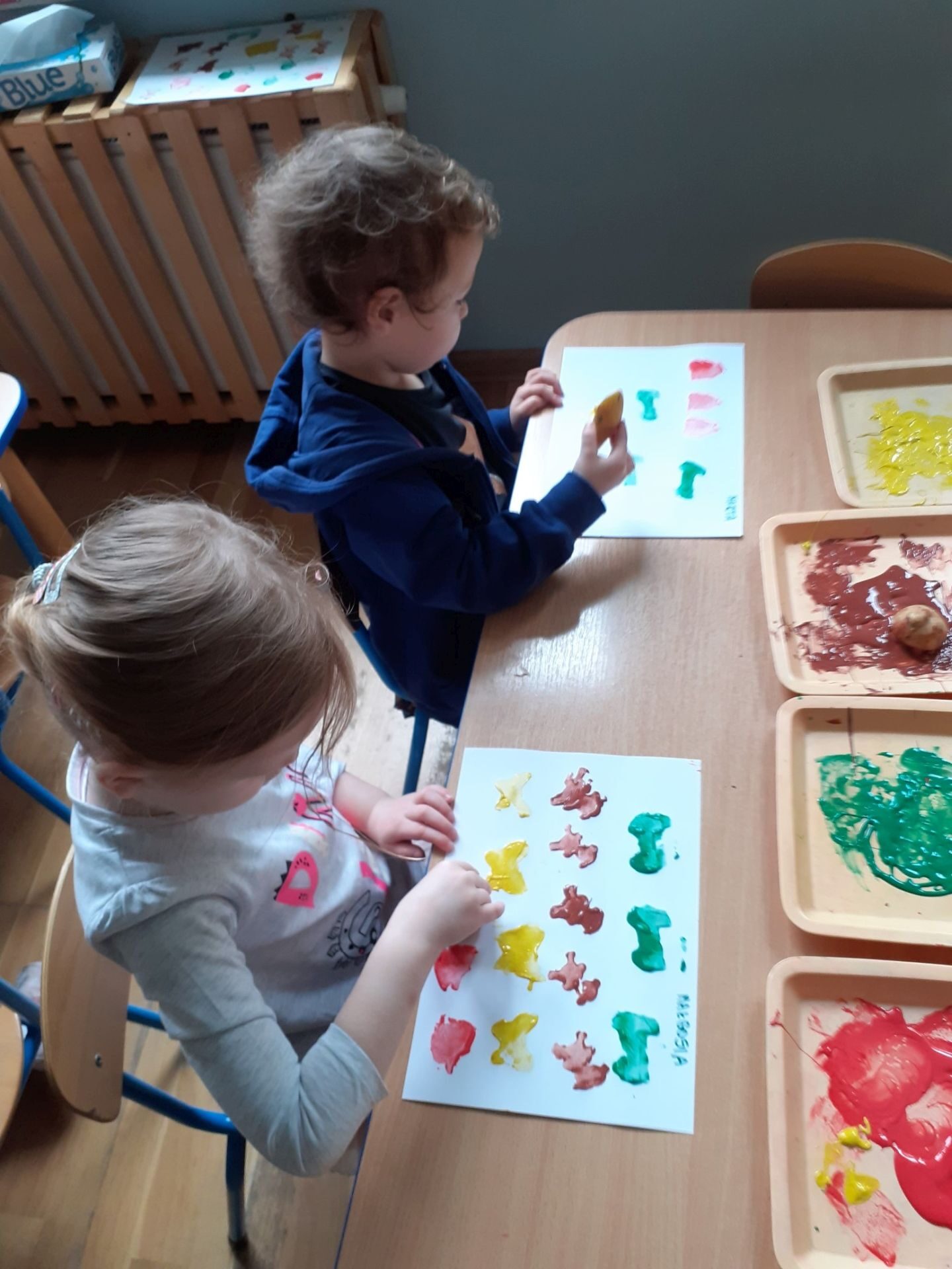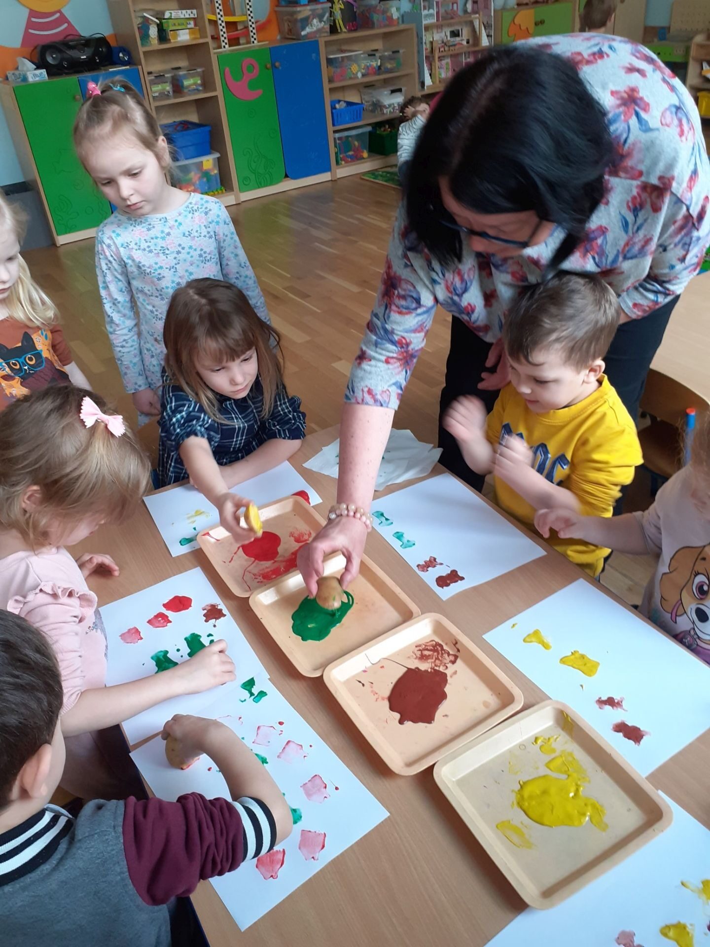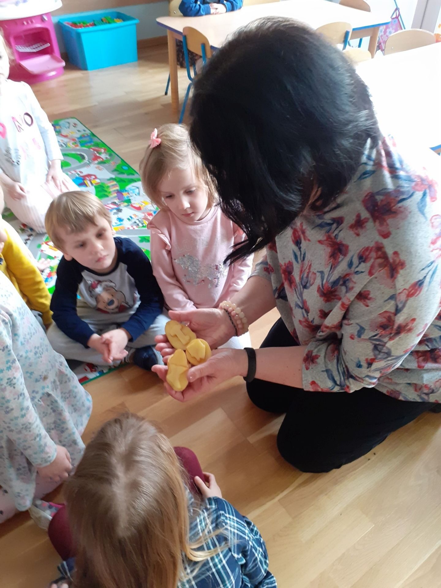 Dnia 28 marca w grupie Pszczółek obchodziliśmy Dzień Ziemniaka, z tej okazji każdy przedszkolak był ubrany na brązowo i przyniósł z domu wspomniane wyżej warzywo. Zajęcia rozpoczęliśmy od zagadki dotyczącej bohatera dzisiejszego dnia .Dzieci zostały zapoznane z „Krótką bajką o ziemniaku”, obejrzały film edukacyjny “Częstujcie się – ziemniak poznały ciekawostki na temat ziemniaków, wzięły udział w ziemniaczanych dyscyplinach sportowych m.in. bieg z ziemniakiem na łyżce, rzucanie ziemniakiem do celu. Przedszkolaki doskonale wiedziały, jakie potrawy robi się z ziemniaków i ochoczo je wymieniły. Uwieńczeniem zabaw była praca plastyczna- wykonanie obrazu za pomocą stempli ziemniaczanych