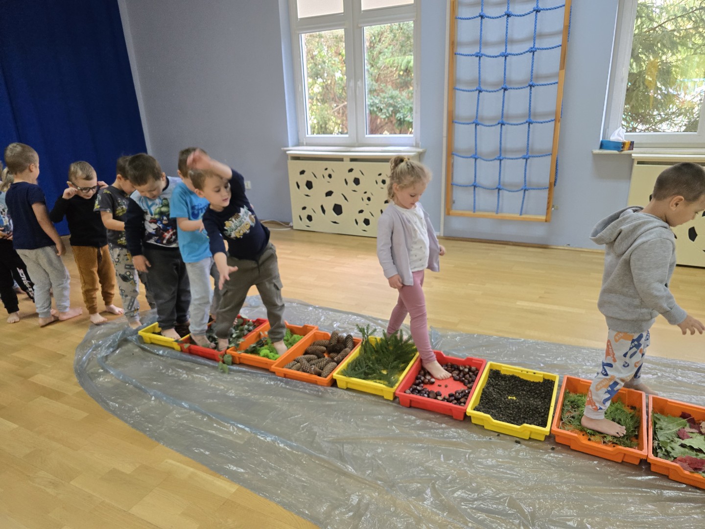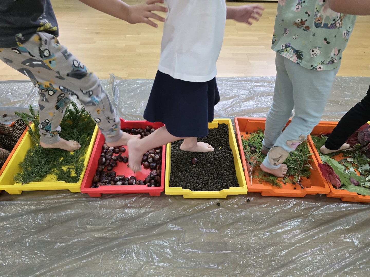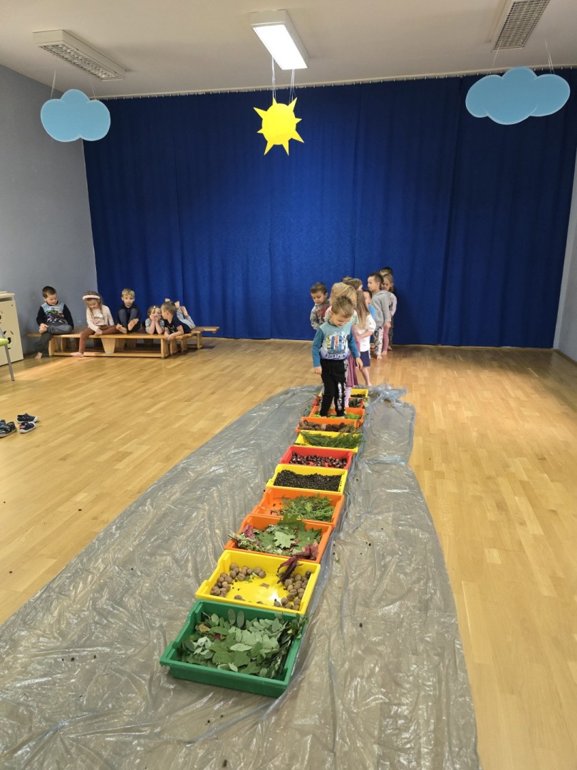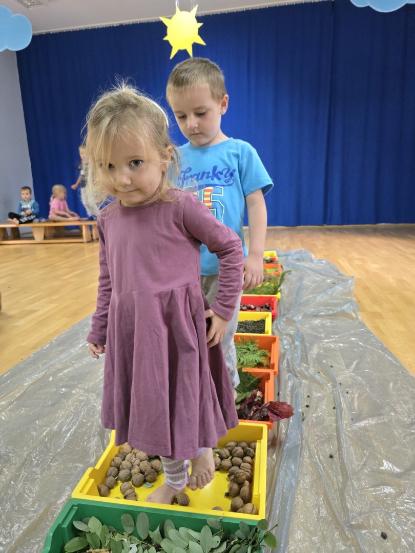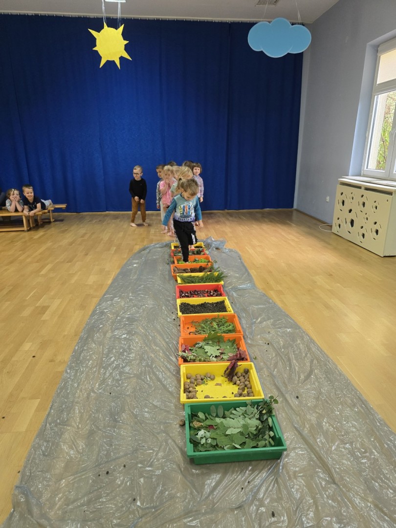 Jesienna ścieżka sensoryczna to utworzona z naturalnych darów jesieni (liści, kasztanów, szyszek, żołędzi, gałązek, kory) trasa, po której dzieci chodzą bosymi stopami, aby stymulować receptory czuciowe. Pomaga to w rozwoju motoryki dużej, poprawia równowagę i koordynację, rozwija wrażenia dotykowe, a także wspiera integrację sensoryczną i poznawanie otoczenia przez zmysły.