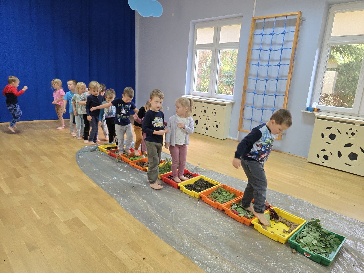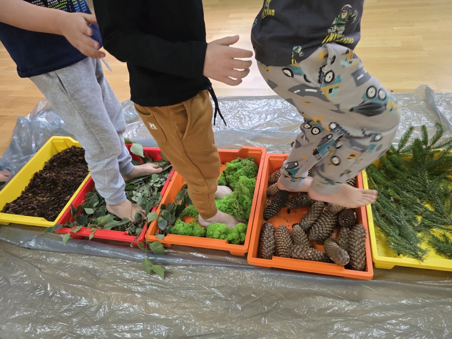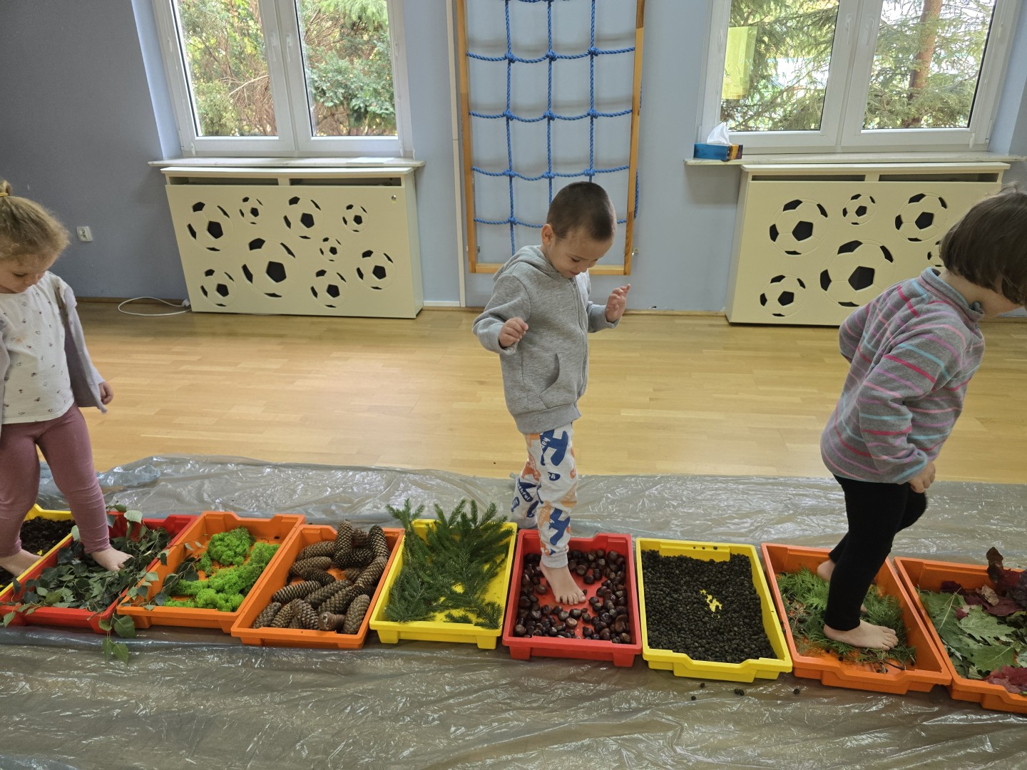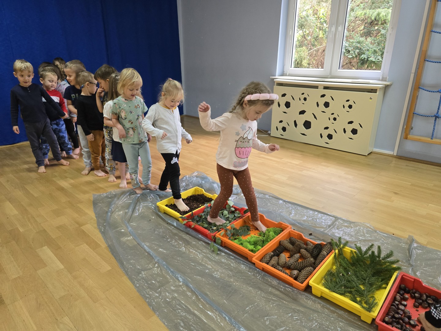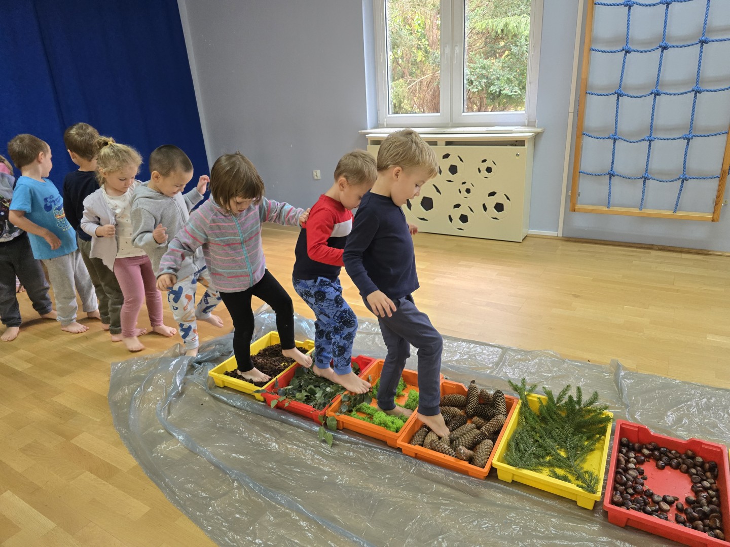 Jesienna ścieżka sensoryczna to utworzona z naturalnych darów jesieni (liści, kasztanów, szyszek, żołędzi, gałązek, kory) trasa, po której dzieci chodzą bosymi stopami, aby stymulować receptory czuciowe. Pomaga to w rozwoju motoryki dużej, poprawia równowagę i koordynację, rozwija wrażenia dotykowe, a także wspiera integrację sensoryczną i poznawanie otoczenia przez zmysły.