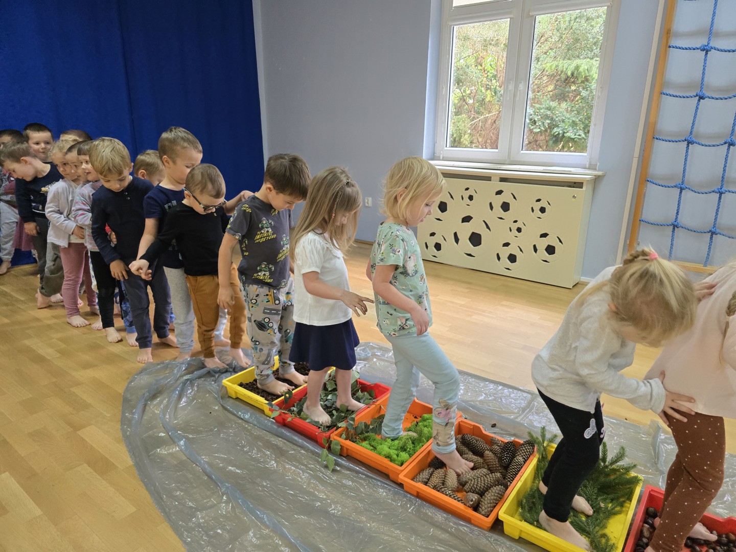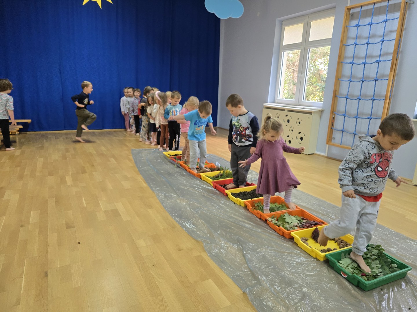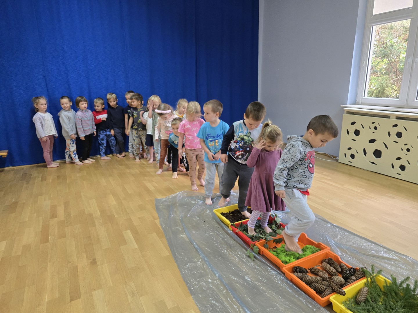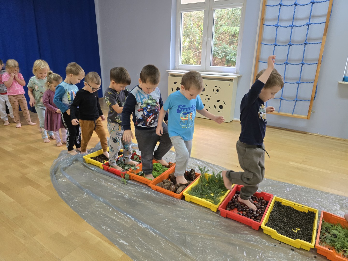 Jesienna ścieżka sensoryczna to utworzona z naturalnych darów jesieni (liści, kasztanów, szyszek, żołędzi, gałązek, kory) trasa, po której dzieci chodzą bosymi stopami, aby stymulować receptory czuciowe. Pomaga to w rozwoju motoryki dużej, poprawia równowagę i koordynację, rozwija wrażenia dotykowe, a także wspiera integrację sensoryczną i poznawanie otoczenia przez zmysły.