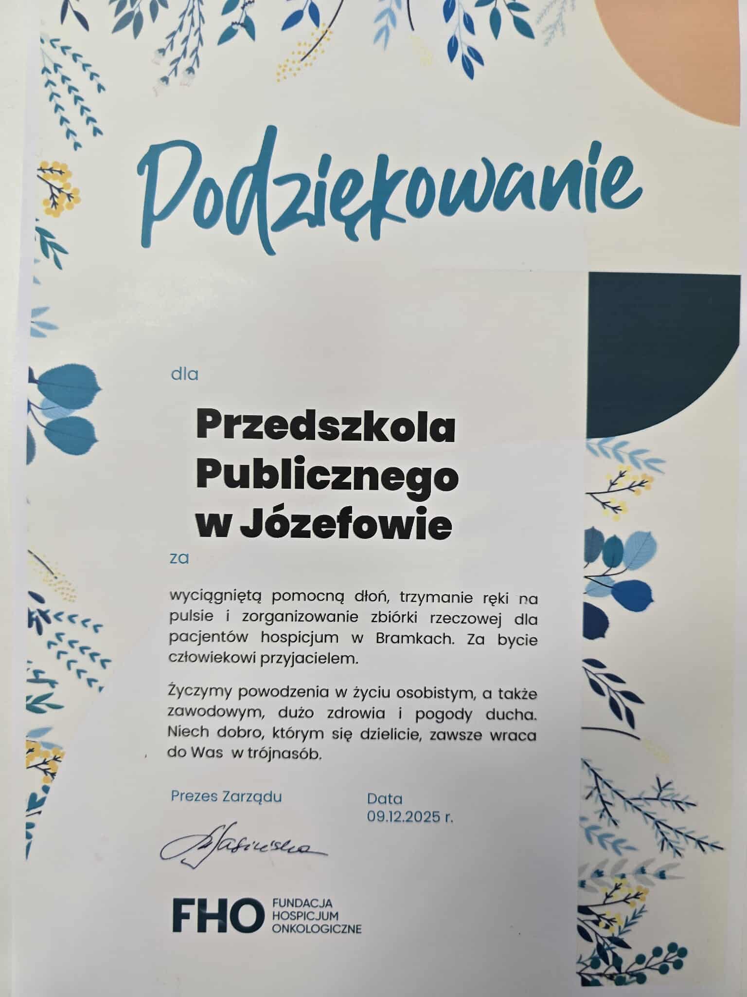 W dniach 14.11-5.12.2025 r. Przedszkole Publiczne w Józefowie organizowało zbiórkę dla Fundacja Hospicjum Onkologiczne św. Krzysztofa w Bramkach podczas , której zbierane były środki czystości, chemia gospodarcza, materiały opatrunkowe oraz żywność.