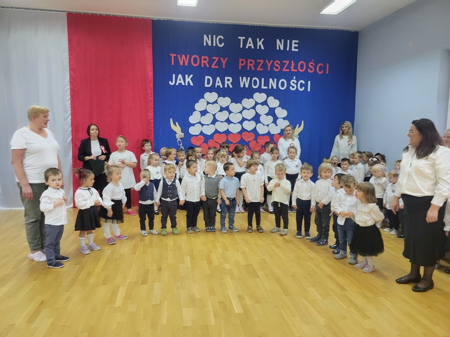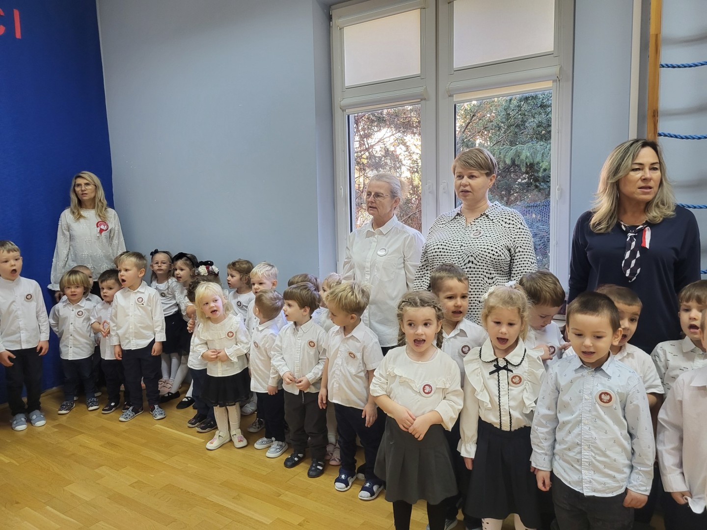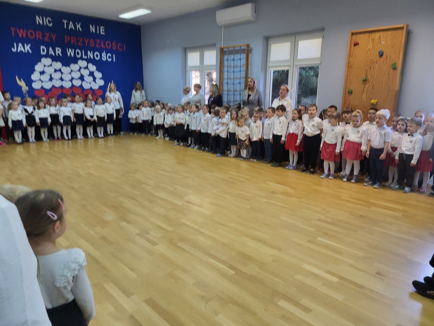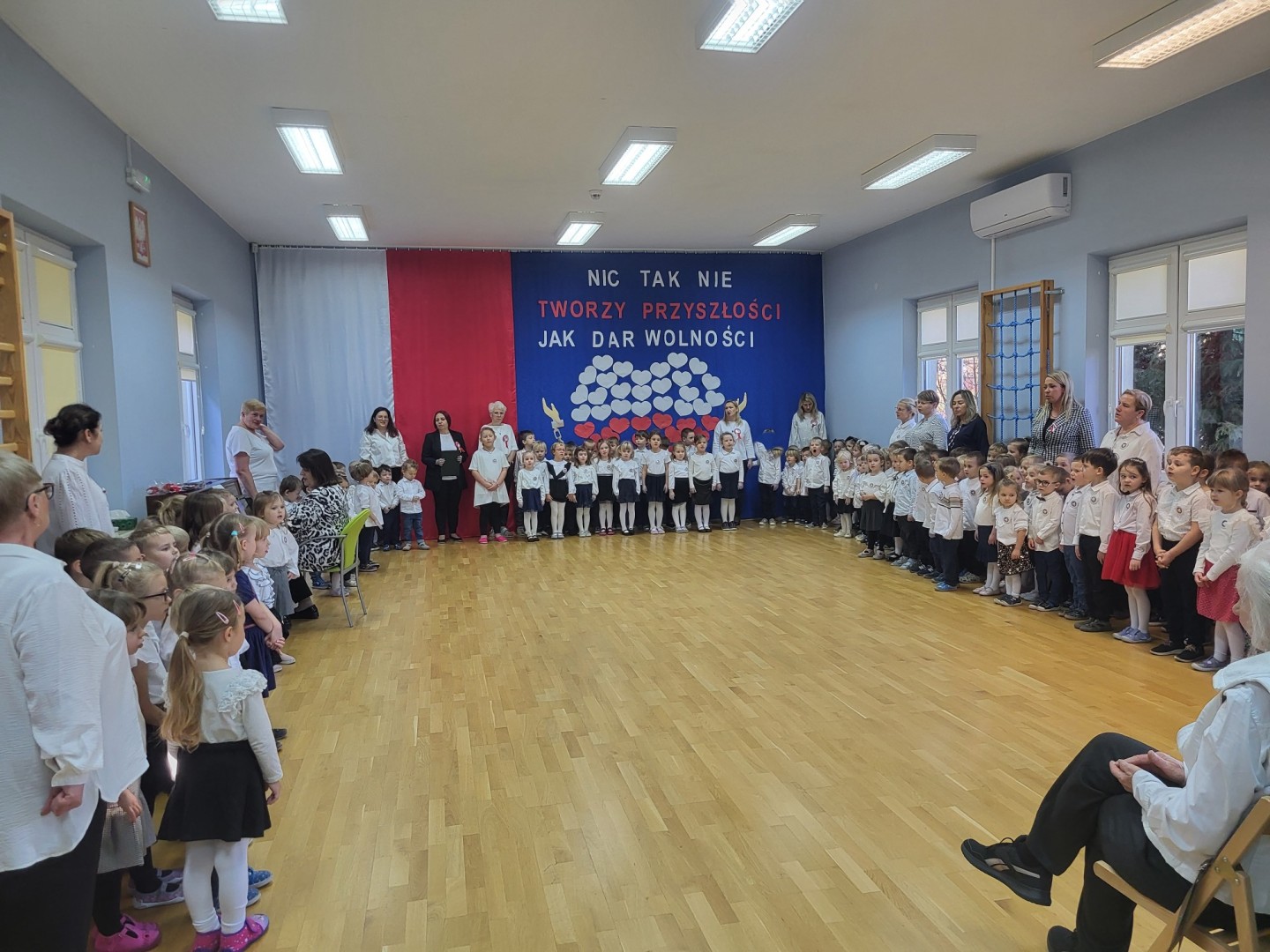 Dnia 13 listopada w naszym przedszkolu odbył się uroczysty Koncert Patriotyczny z okazji rocznicy odzyskania przez Polskę niepodległości. Wydarzenie to stało się piękną okazją do wspólnego świętowania oraz kształtowania postaw patriotycznych wśród najmłodszych. W uroczystości wzięły udział Panie z Klubu Pasjonatów przy Bibliotece Publicznej w Józefowie, wydarzenie miało więc charakter międzypokoleniowy. Rozpoczęliśmy wspólnym odśpiewaniem Hymnu Polski oraz pieśni patriotycznej pt. „Legiony”. Dzieci z poszczególnych grup przygotowały piosenki patriotyczne nawiązujące do historii Polski, symboli narodowych i wartości ważnych dla każdego Polaka. Dzieci 5-letnie dodatkowo tańczyły tańce patriotyczne. Na koniec grupa Żabki przedstawiła zapierający dech w piersiach widowiskowy obraz wolności i dumy narodowej pokazując zachwycający taniec z wykorzystaniem flag Polski. Podczas koncertu mali artyści z ogromnym zaangażowaniem prezentowali swoje umiejętności. Występy były pełne radości, dumy i wzruszeń, a w sali panowała wyjątkowa, podniosła atmosfera. Dziękujemy wszystkim nauczycielom za przygotowanie dzieci do występów, a naszym gościom za wspólne świętowanie oraz obecność. Jesteśmy dumni z naszych przedszkolaków, którzy kolejny raz pokazali, że potrafią pięknie uczyć się i świętować ważne momenty naszej historii.