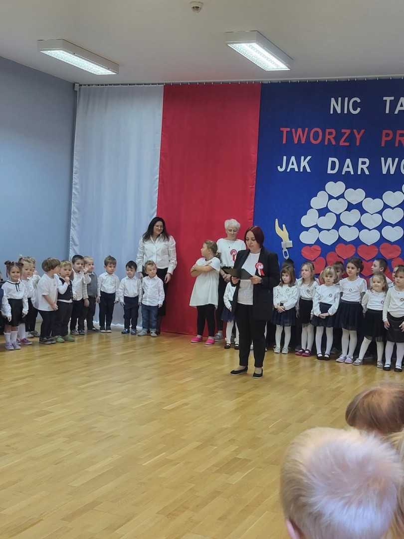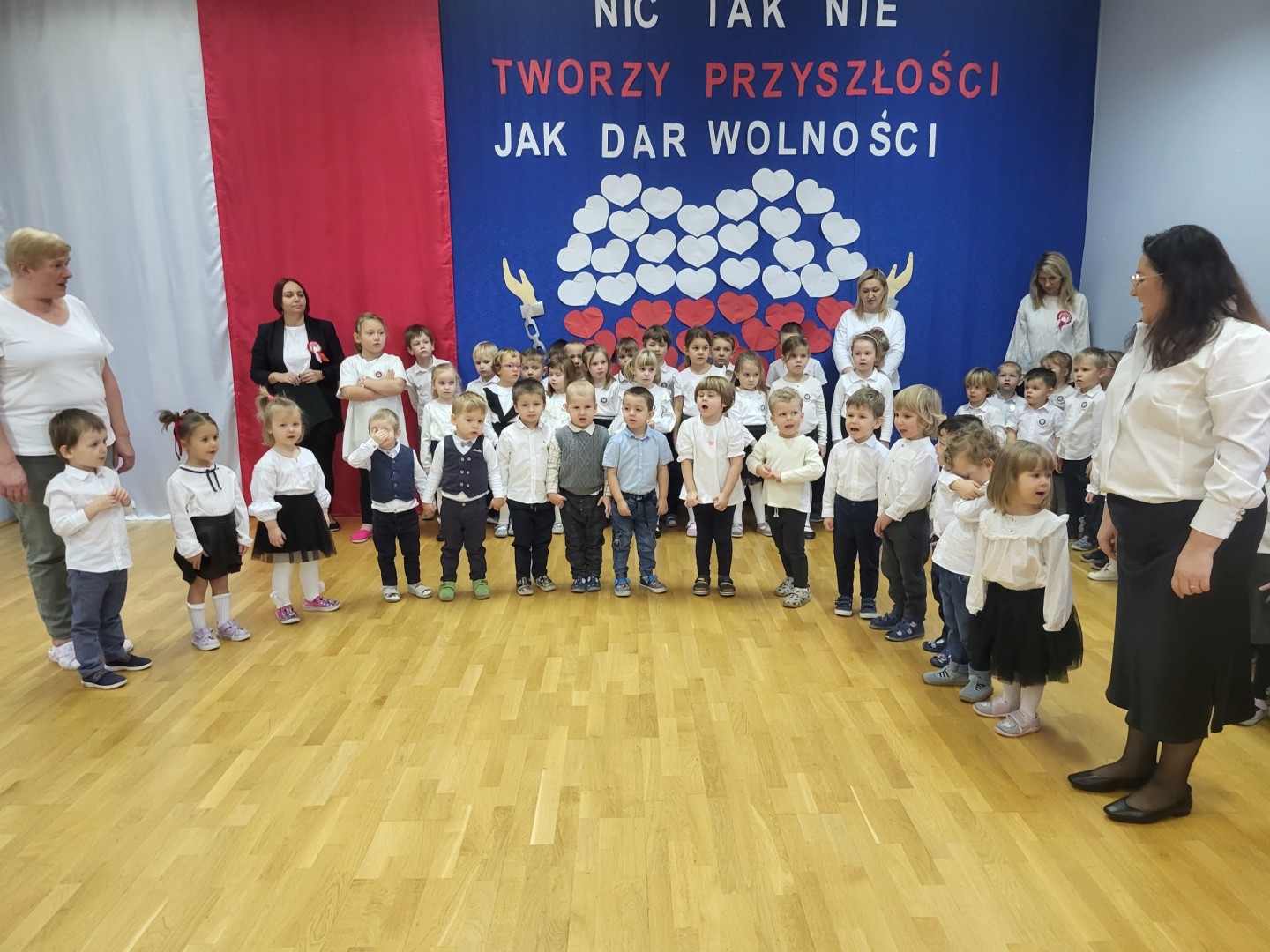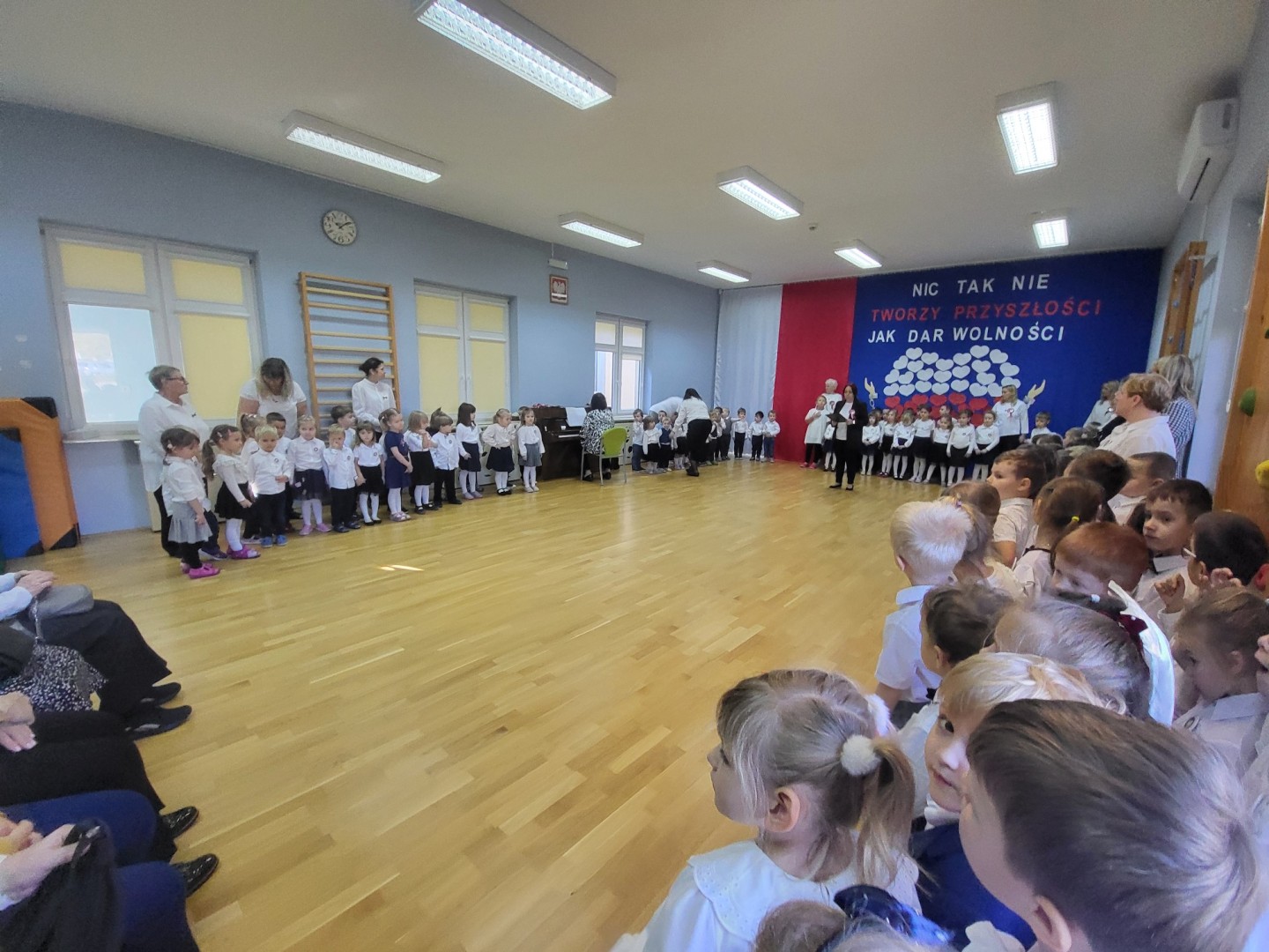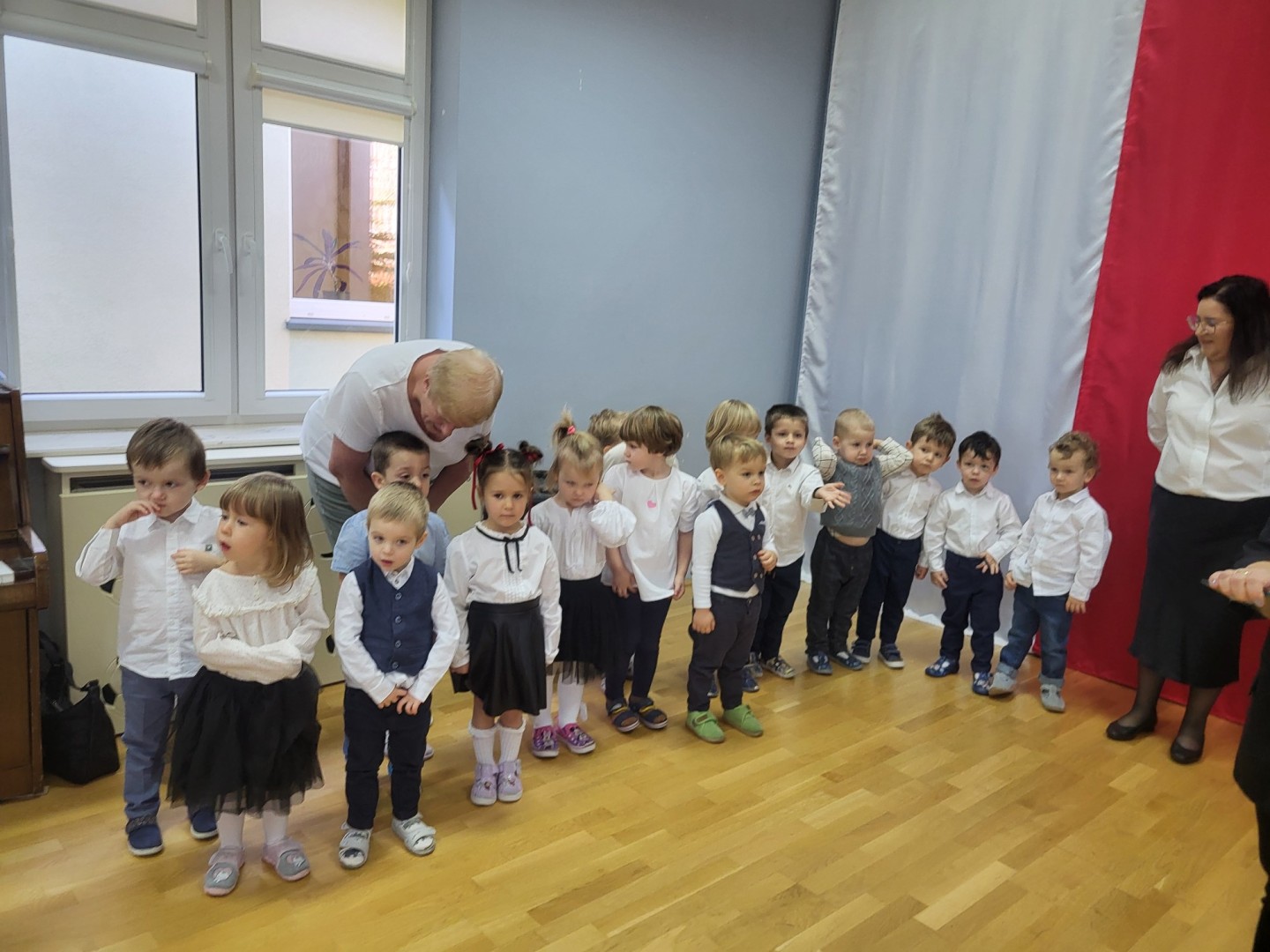 Dnia 13 listopada w naszym przedszkolu odbył się uroczysty Koncert Patriotyczny z okazji rocznicy odzyskania przez Polskę niepodległości. Wydarzenie to stało się piękną okazją do wspólnego świętowania oraz kształtowania postaw patriotycznych wśród najmłodszych. W uroczystości wzięły udział Panie z Klubu Pasjonatów przy Bibliotece Publicznej w Józefowie, wydarzenie miało więc charakter międzypokoleniowy. Rozpoczęliśmy wspólnym odśpiewaniem Hymnu Polski oraz pieśni patriotycznej pt. „Legiony”. Dzieci z poszczególnych grup przygotowały piosenki patriotyczne nawiązujące do historii Polski, symboli narodowych i wartości ważnych dla każdego Polaka. Dzieci 5-letnie dodatkowo tańczyły tańce patriotyczne. Na koniec grupa Żabki przedstawiła zapierający dech w piersiach widowiskowy obraz wolności i dumy narodowej pokazując zachwycający taniec z wykorzystaniem flag Polski. Podczas koncertu mali artyści z ogromnym zaangażowaniem prezentowali swoje umiejętności. Występy były pełne radości, dumy i wzruszeń, a w sali panowała wyjątkowa, podniosła atmosfera. Dziękujemy wszystkim nauczycielom za przygotowanie dzieci do występów, a naszym gościom za wspólne świętowanie oraz obecność. Jesteśmy dumni z naszych przedszkolaków, którzy kolejny raz pokazali, że potrafią pięknie uczyć się i świętować ważne momenty naszej historii.