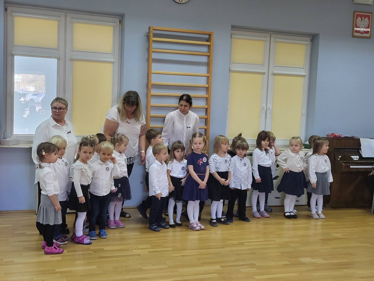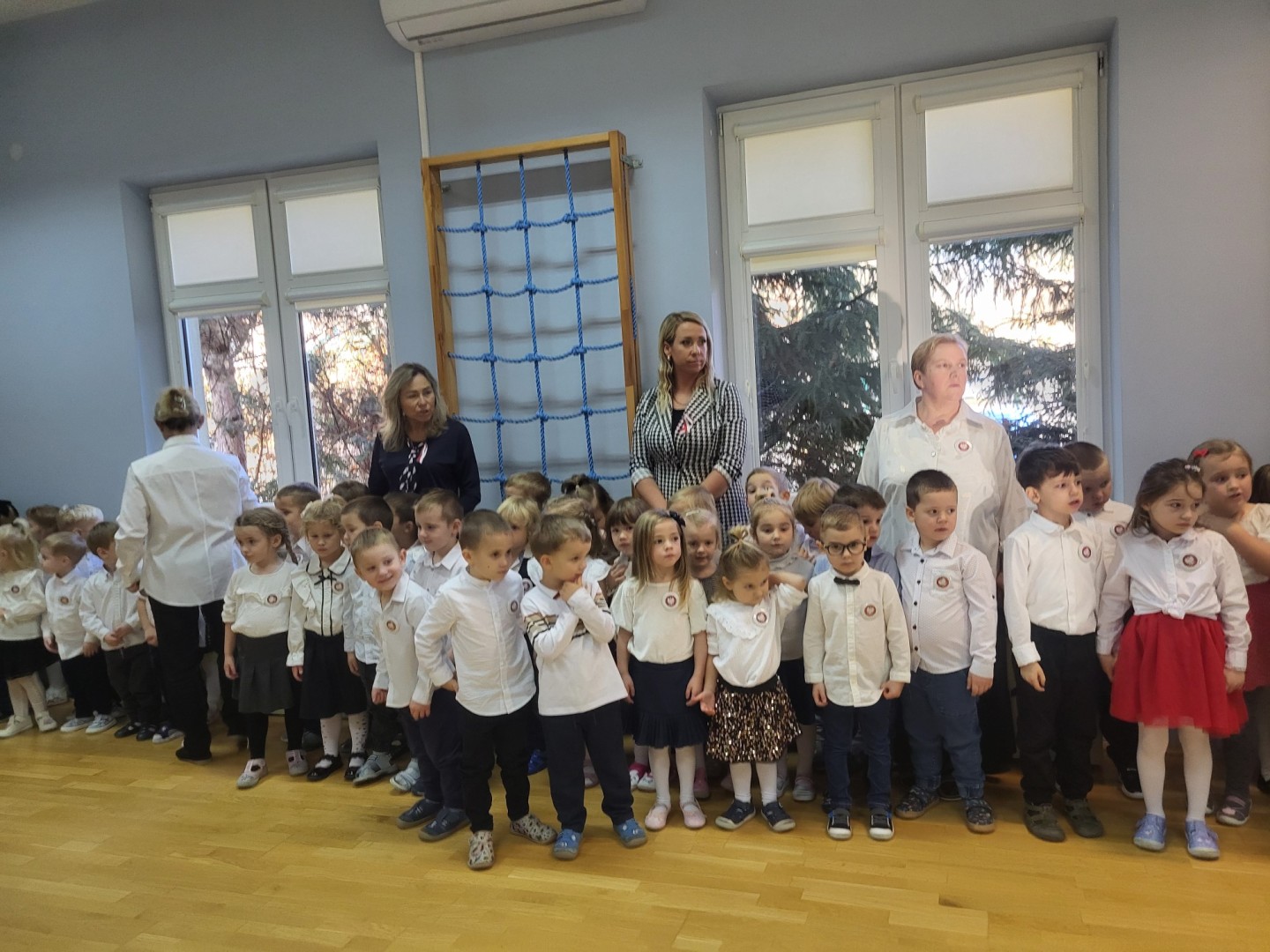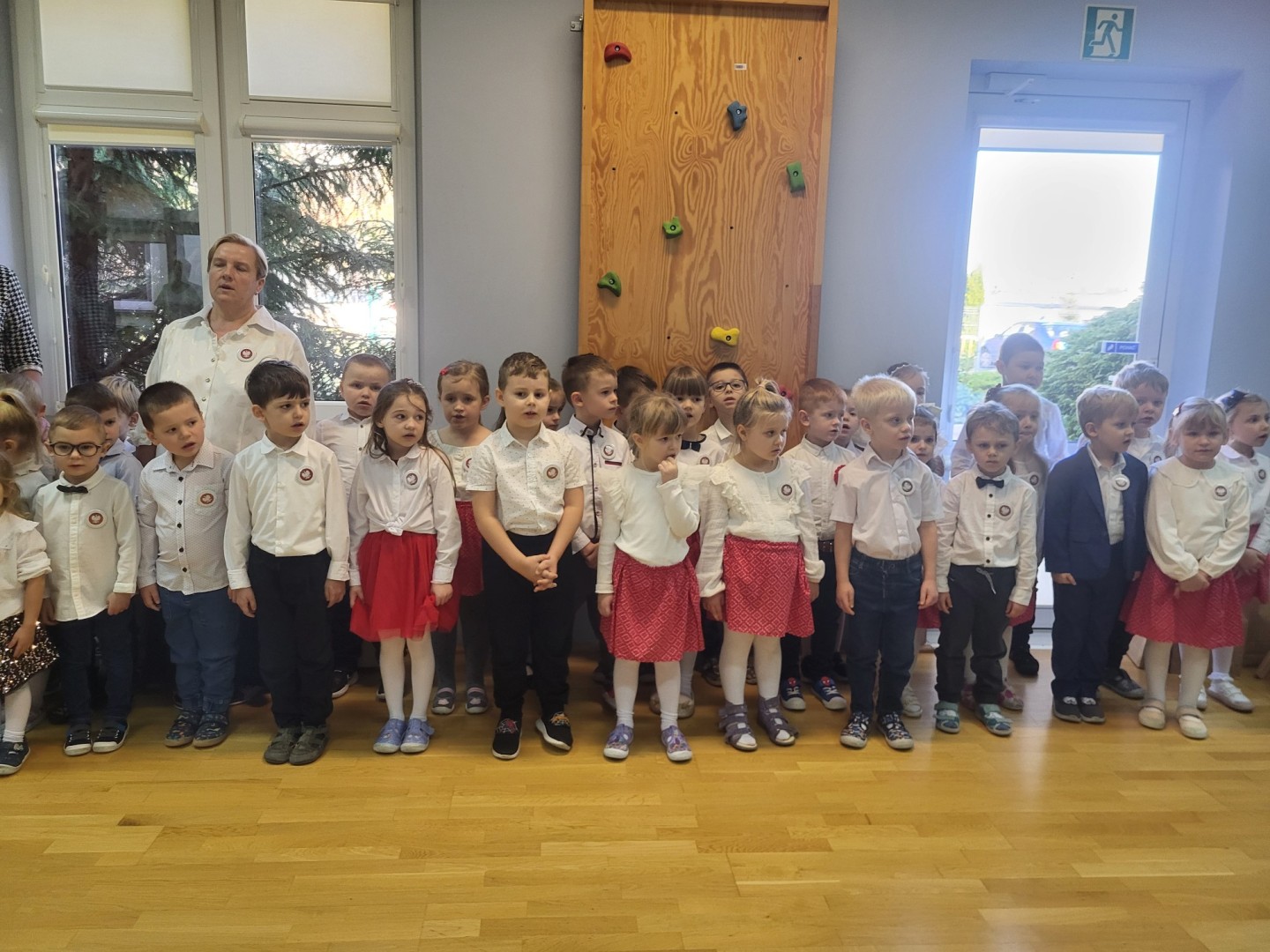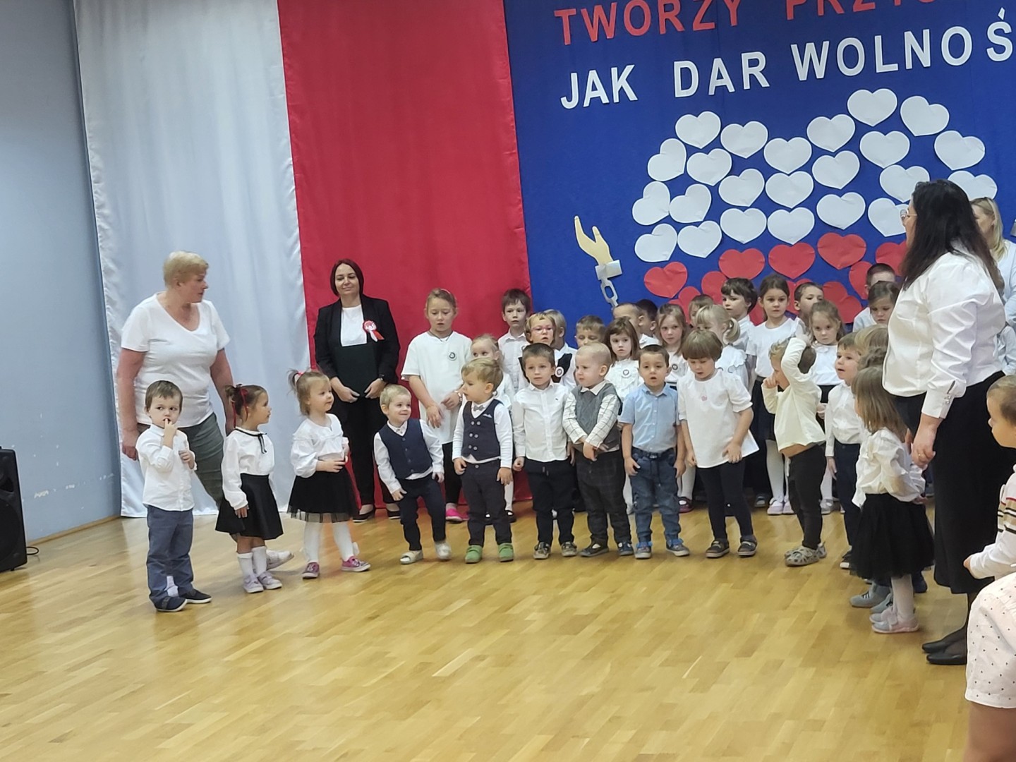 Dnia 13 listopada w naszym przedszkolu odbył się uroczysty Koncert Patriotyczny z okazji rocznicy odzyskania przez Polskę niepodległości. Wydarzenie to stało się piękną okazją do wspólnego świętowania oraz kształtowania postaw patriotycznych wśród najmłodszych. W uroczystości wzięły udział Panie z Klubu Pasjonatów przy Bibliotece Publicznej w Józefowie, wydarzenie miało więc charakter międzypokoleniowy. Rozpoczęliśmy wspólnym odśpiewaniem Hymnu Polski oraz pieśni patriotycznej pt. „Legiony”. Dzieci z poszczególnych grup przygotowały piosenki patriotyczne nawiązujące do historii Polski, symboli narodowych i wartości ważnych dla każdego Polaka. Dzieci 5-letnie dodatkowo tańczyły tańce patriotyczne. Na koniec grupa Żabki przedstawiła zapierający dech w piersiach widowiskowy obraz wolności i dumy narodowej pokazując zachwycający taniec z wykorzystaniem flag Polski. Podczas koncertu mali artyści z ogromnym zaangażowaniem prezentowali swoje umiejętności. Występy były pełne radości, dumy i wzruszeń, a w sali panowała wyjątkowa, podniosła atmosfera. Dziękujemy wszystkim nauczycielom za przygotowanie dzieci do występów, a naszym gościom za wspólne świętowanie oraz obecność. Jesteśmy dumni z naszych przedszkolaków, którzy kolejny raz pokazali, że potrafią pięknie uczyć się i świętować ważne momenty naszej historii.
