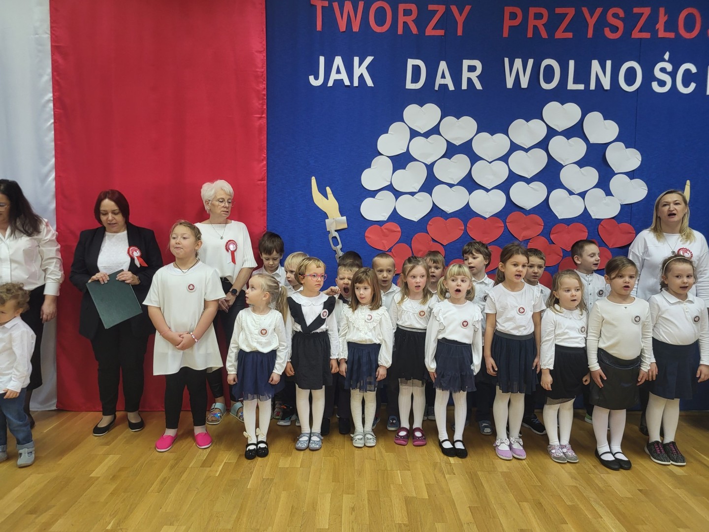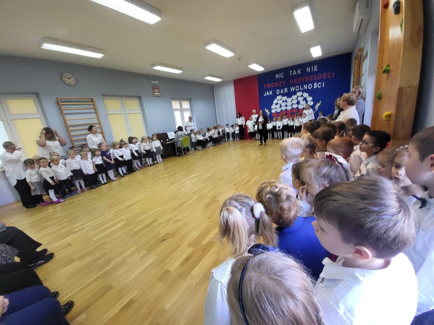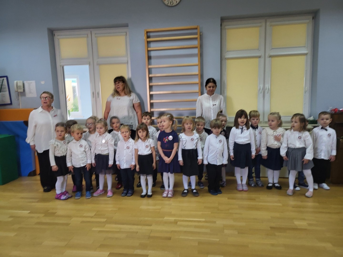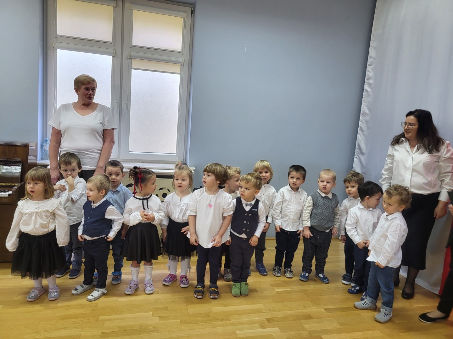 Dnia 13 listopada w naszym przedszkolu odbył się uroczysty Koncert Patriotyczny z okazji rocznicy odzyskania przez Polskę niepodległości. Wydarzenie to stało się piękną okazją do wspólnego świętowania oraz kształtowania postaw patriotycznych wśród najmłodszych. W uroczystości wzięły udział Panie z Klubu Pasjonatów przy Bibliotece Publicznej w Józefowie, wydarzenie miało więc charakter międzypokoleniowy. Rozpoczęliśmy wspólnym odśpiewaniem Hymnu Polski oraz pieśni patriotycznej pt. „Legiony”. Dzieci z poszczególnych grup przygotowały piosenki patriotyczne nawiązujące do historii Polski, symboli narodowych i wartości ważnych dla każdego Polaka. Dzieci 5-letnie dodatkowo tańczyły tańce patriotyczne. Na koniec grupa Żabki przedstawiła zapierający dech w piersiach widowiskowy obraz wolności i dumy narodowej pokazując zachwycający taniec z wykorzystaniem flag Polski. Podczas koncertu mali artyści z ogromnym zaangażowaniem prezentowali swoje umiejętności. Występy były pełne radości, dumy i wzruszeń, a w sali panowała wyjątkowa, podniosła atmosfera. Dziękujemy wszystkim nauczycielom za przygotowanie dzieci do występów, a naszym gościom za wspólne świętowanie oraz obecność. Jesteśmy dumni z naszych przedszkolaków, którzy kolejny raz pokazali, że potrafią pięknie uczyć się i świętować ważne momenty naszej historii.
