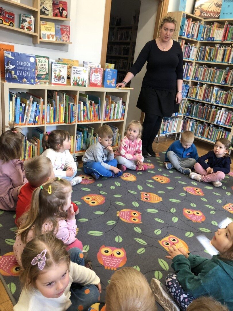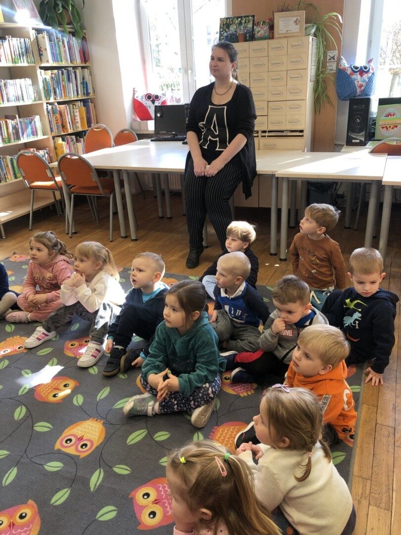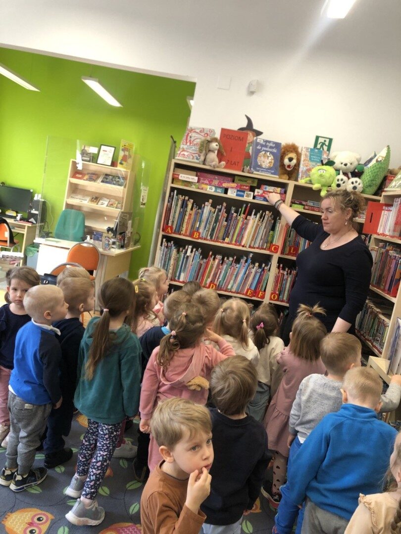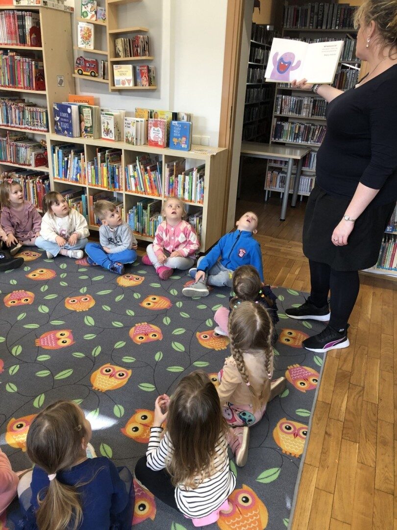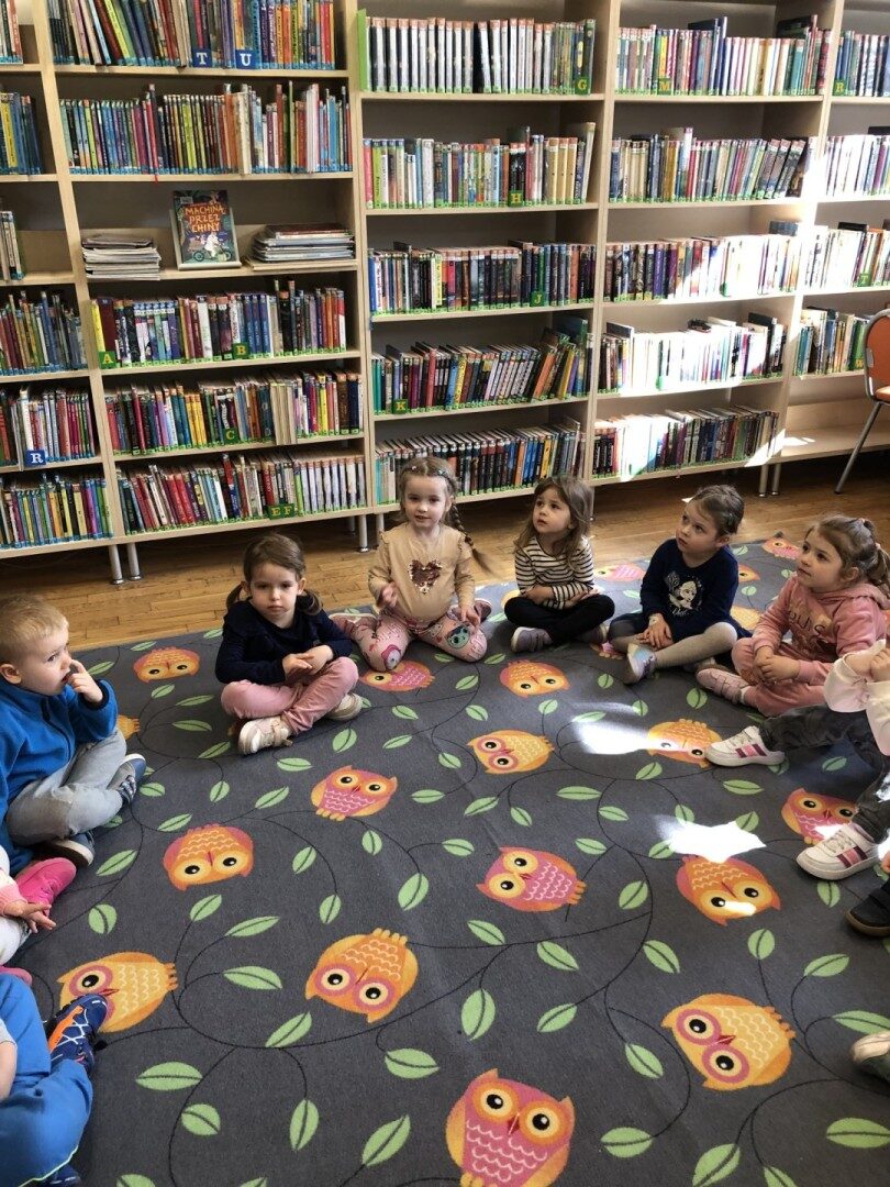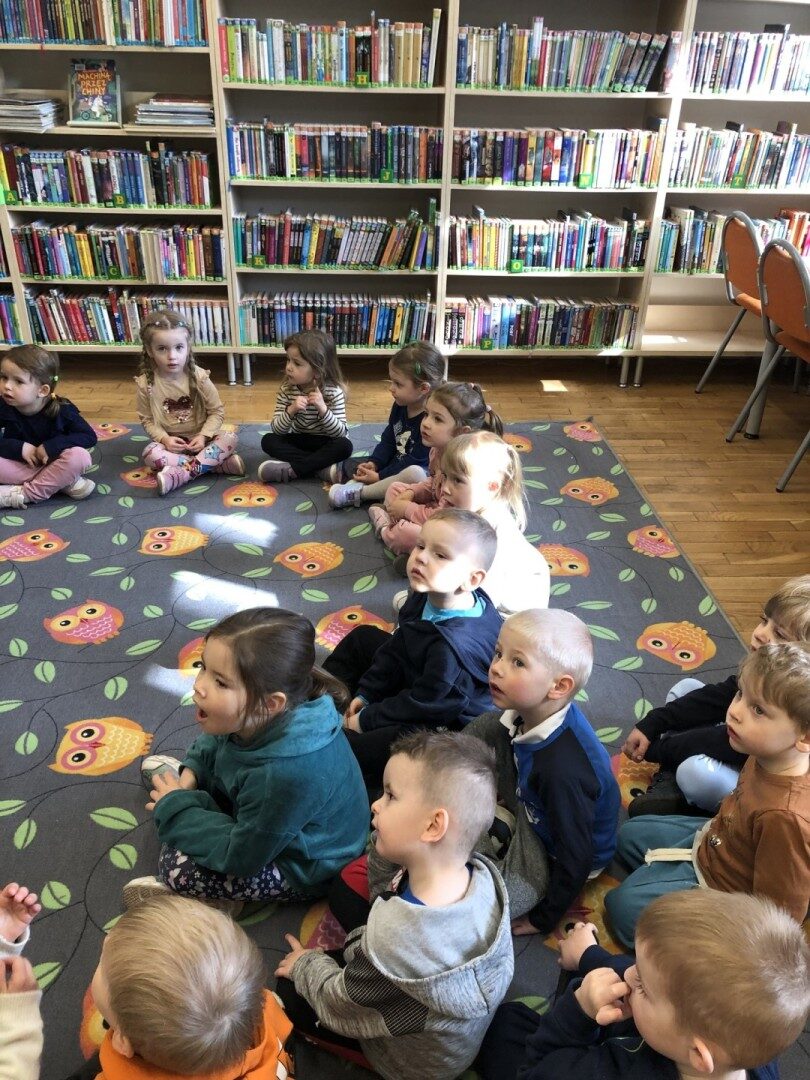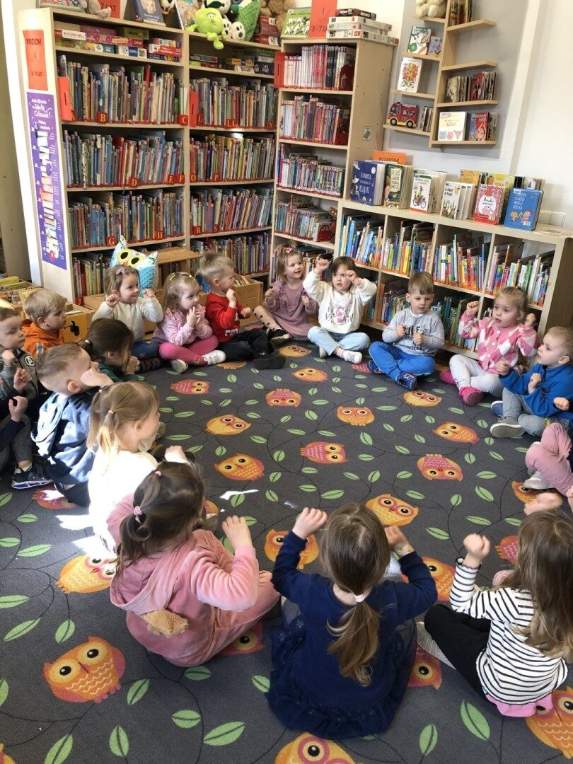 Dnia 8.04.2025r. dieci z grupy I “Pszczółki” były z wizytą w Bibliotece Publicznej w Józefowie. Miały możliwość zapoznania się z pomieszczeniami i regałami na których znajdują si e książki dla dzieci. Słuchały ujtworu “Potrząśnij jabłonką”. W tekście były zawarte polecenia, które dzieci miały pokazać gestami, np.: płynące fale, itp.. Pani bibliotekarka zachęcała aby przedszkolaki z rodzicami zapisali sie do bibli9oteki. Pokazała kartę biblioteczną. Dzieciom bardzo podobało się w bibliotece.