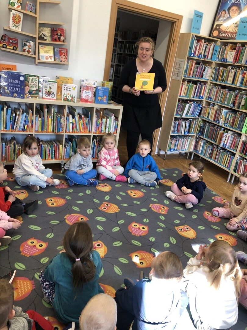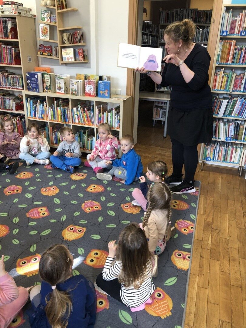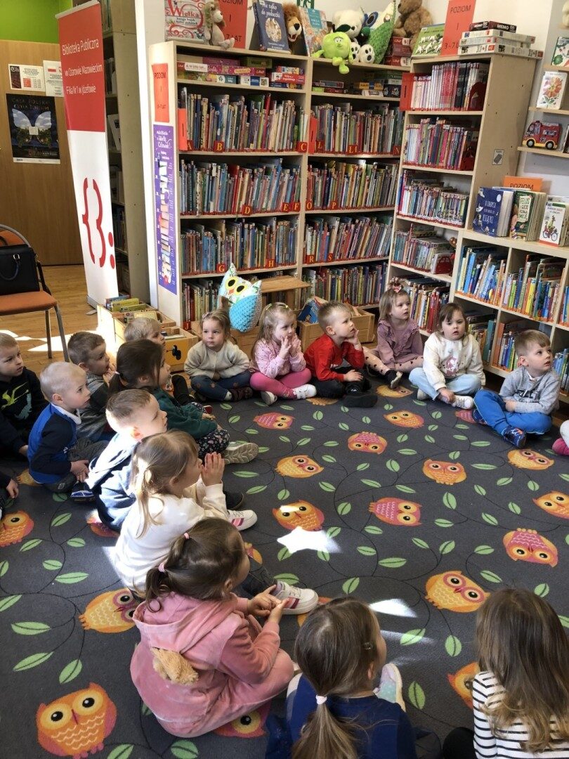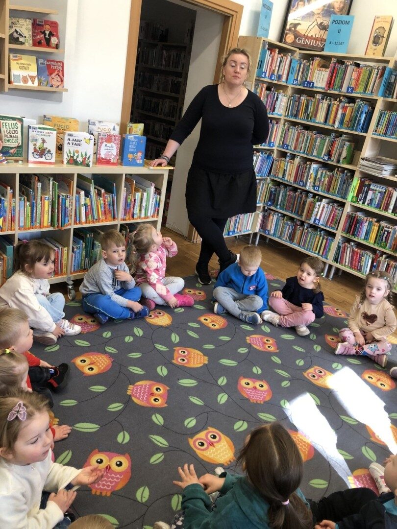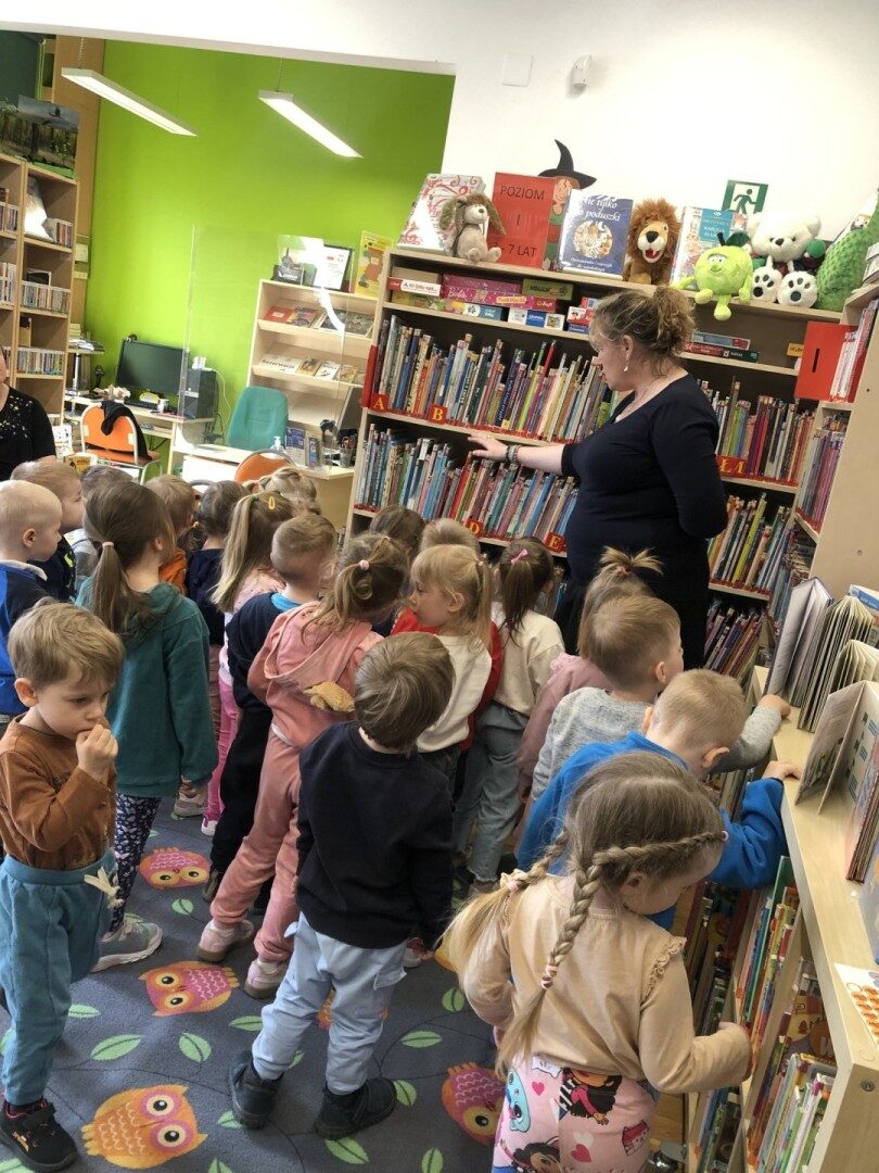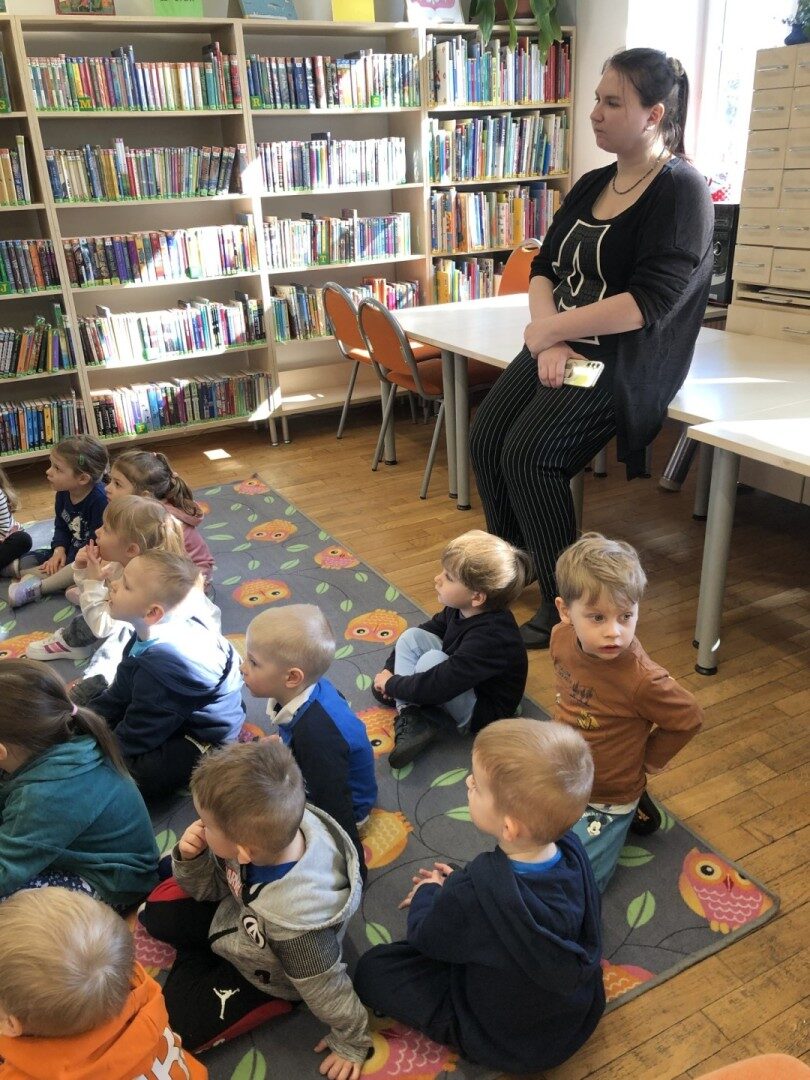 Dnia 8.04.2025r. dieci z grupy I “Pszczółki” były z wizytą w Bibliotece Publicznej w Józefowie. Miały możliwość zapoznania się z pomieszczeniami i regałami na których znajdują si e książki dla dzieci. Słuchały ujtworu “Potrząśnij jabłonką”. W tekście były zawarte polecenia, które dzieci miały pokazać gestami, np.: płynące fale, itp.. Pani bibliotekarka zachęcała aby przedszkolaki z rodzicami zapisali sie do bibli9oteki. Pokazała kartę biblioteczną. Dzieciom bardzo podobało się w bibliotece.