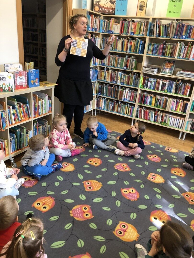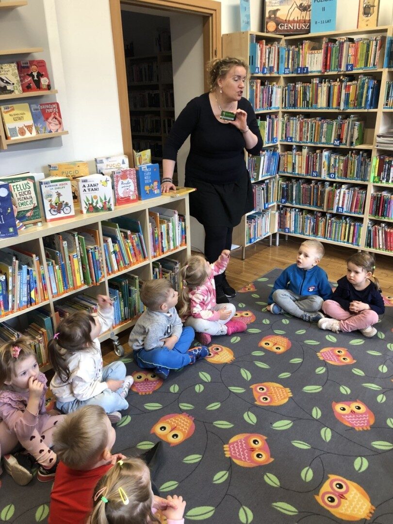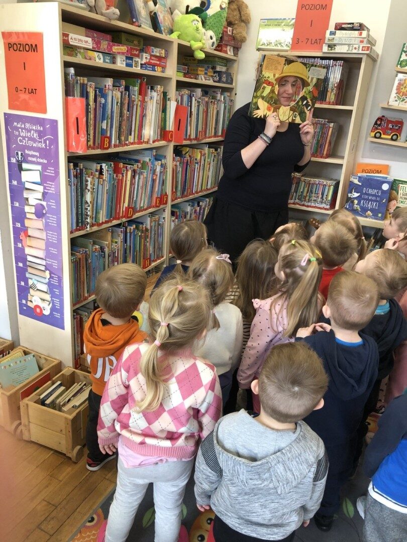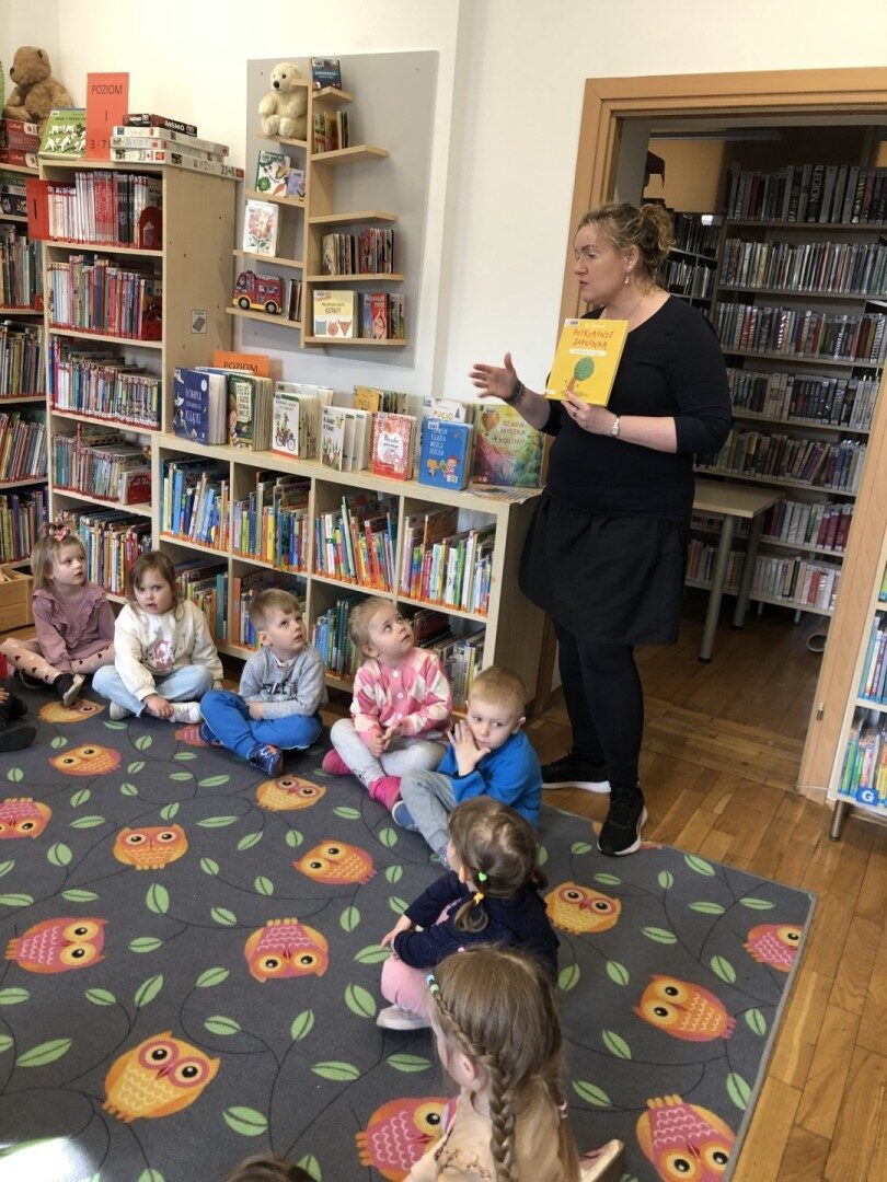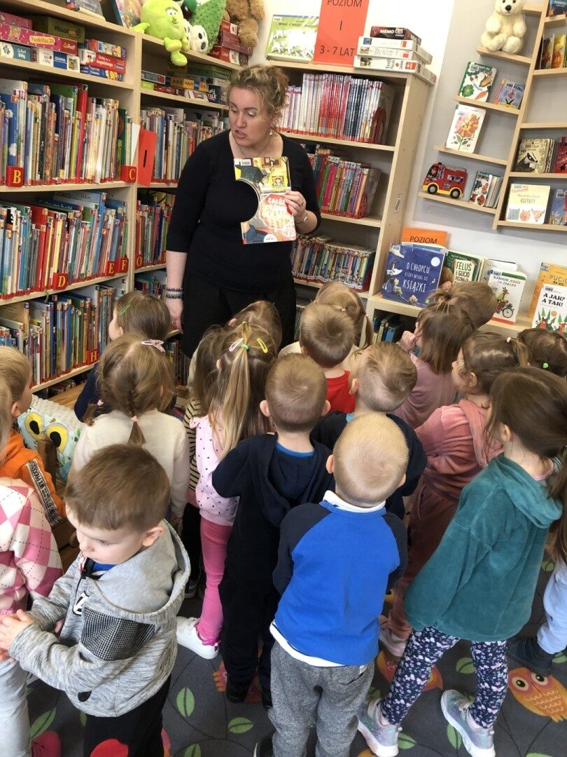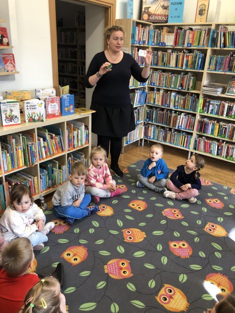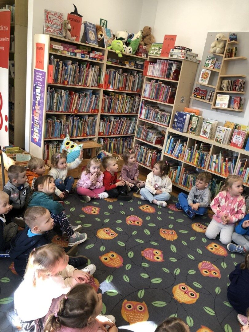 Dnia 8.04.2025r. dieci z grupy I “Pszczółki” były z wizytą w Bibliotece Publicznej w Józefowie. Miały możliwość zapoznania się z pomieszczeniami i regałami na których znajdują si e książki dla dzieci. Słuchały ujtworu “Potrząśnij jabłonką”. W tekście były zawarte polecenia, które dzieci miały pokazać gestami, np.: płynące fale, itp.. Pani bibliotekarka zachęcała aby przedszkolaki z rodzicami zapisali sie do bibli9oteki. Pokazała kartę biblioteczną. Dzieciom bardzo podobało się w bibliotece.